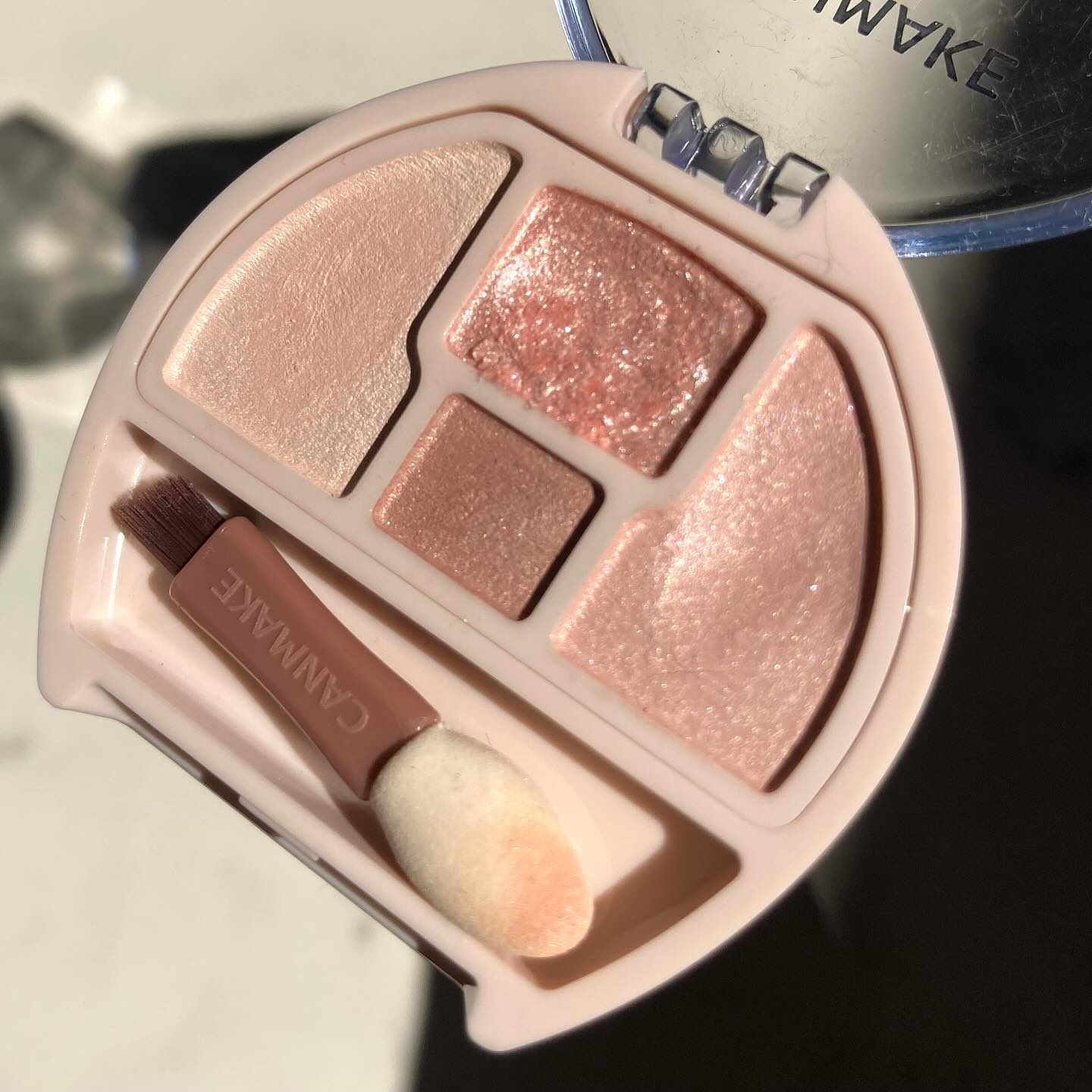 マットは肌に溶け込むような粉質でボソボソしません! シマーのしっとりした粉質も密着してくれて好き!!! 1番キラキラなのは右上のラメですね🍑💓でも粒が大きくないので、大人も使いやすいラメだと思います🥰 どの色使おうか迷うけど、どれ使っても本当可愛くて、自分が桃になったかのような🍑(笑)多幸感あふれるパレットです💘