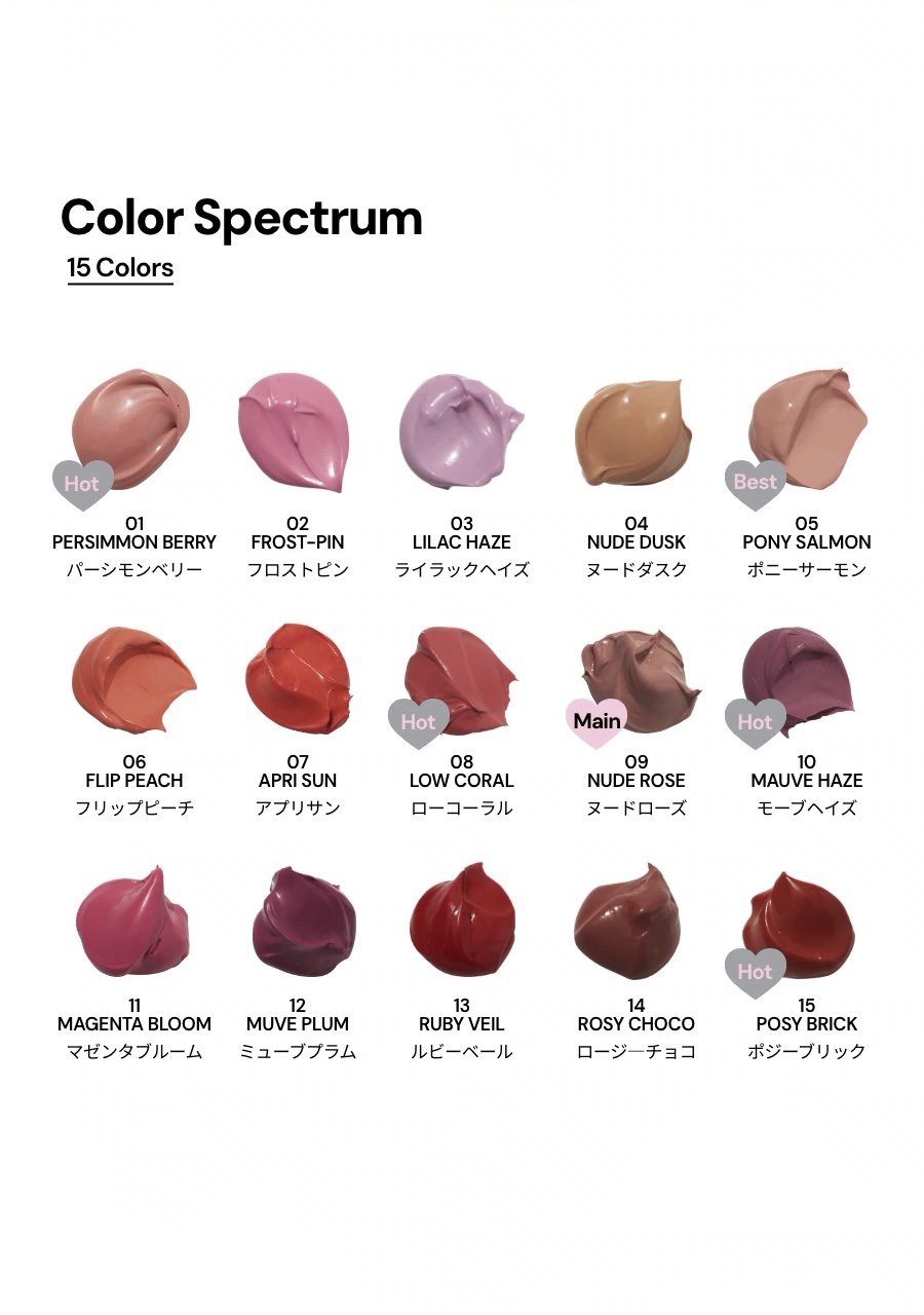 - <01 パーシモンベリー> イソドデカン、オクチルドデカノール、酸化チタン、(ビニルジメチコン/メチコンシルセスキオキサン)クロスポリマー、シリカ、タルク、水添(スチレン/イソプレン)コポリマー、トリ(カプリル酸/カプリン酸)グリセリル、ジメチコン、ポリメチルシルセスキオキサン、ジステアルジモニウムヘクトライト、セスキオレイン酸ソルビタン、(ジメチコン/ビニルジメチコン)クロスポリマー、1,2-ヘキサンジオール、炭酸プロピレン、赤酸化鉄、黄酸化鉄、黄4、香料、赤202、エチルヘキシルグリセリン、黒酸化鉄、赤104(1)、テトラ(ジ-t-ブチルヒドロキシヒドロケイヒ酸)ペンタエリスリチル <02 フロストピン> イソドデカン、オクチルドデカノール、酸化チタン、タルク、(ビニルジメチコン/メチコンシルセスキオキサン)クロスポリマー、シリカ、水添(スチレン/イソプレン)コポリマー、トリ(カプリル酸/カプリン酸)グリセリル、ジメチコン、ポリメチルシルセスキオキサン、ジステアルジモニウムヘクトライト、セスキオレイン酸ソルビタン、(ジメチコン/ビニルジメチコン)クロスポリマー、1,2-ヘキサンジオール、炭酸プロピレン、赤酸化鉄、赤202、香料、黄酸化鉄、エチルヘキシルグリセリン、テトラ(ジ-t-ブチルヒドロキシヒドロケイヒ酸)ペンタエリスリチル <03 ライラックヘイズ> イソドデカン、オクチルドデカノール、酸化チタン、タルク、(ビニルジメチコン/メチコンシルセスキオキサン)クロスポリマー、シリカ、水添(スチレン/イソプレン)コポリマー、トリ(カプリル酸/カプリン酸)グリセリル、ジメチコン、ポリメチルシルセスキオキサン、ジステアルジモニウムヘクトライト、セスキオレイン酸ソルビタン、(ジメチコン/ビニルジメチコン)クロスポリマー、1,2-ヘキサンジオール、炭酸プロピレン、香料、黒酸化鉄、赤202、エチルヘキシルグリセリン、黄酸化鉄、赤酸化鉄、テトラ(ジ-t-ブチルヒドロキシヒドロケイヒ酸)ペンタエリスリチル <04 ヌードダスク> イソドデカン、オクチルドデカノール、酸化チタン、タルク、(ビニルジメチコン/メチコンシルセスキオキサン)クロスポリマー、シリカ、水添(スチレン/イソプレン)コポリマー、トリ(カプリル酸/カプリン酸)グリセリル、ジメチコン、ポリメチルシルセスキオキサン、ジステアルジモニウムヘクトライト、セスキオレイン酸ソルビタン、(ジメチコン/ビニルジメチコン)クロスポリマー、黄酸化鉄、1,2-ヘキサンジオール、炭酸プロピレン、赤酸化鉄、香料、黒酸化鉄、エチルヘキシルグリセリン、テトラ(ジ-t-ブチルヒドロキシヒドロケイヒ酸)ペンタエリスリチル <05 ポニーサーモン> イソドデカン、オクチルドデカノール、酸化チタン、タルク、(ビニルジメチコン/メチコンシルセスキオキサン)クロスポリマー、シリカ、水添(スチレン/イソプレン)コポリマー、トリ(カプリル酸/カプリン酸)グリセリル、ジメチコン、ポリメチルシルセスキオキサン、ジステアルジモニウムヘクトライト、セスキオレイン酸ソルビタン、(ジメチコン/ビニルジメチコン)クロスポリマー、1,2-ヘキサンジオール、炭酸プロピレン、赤酸化鉄、香料、エチルヘキシルグリセリン、黄酸化鉄、黒酸化鉄、テトラ(ジ-t-ブチルヒドロキシヒドロケイヒ酸)ペンタエリスリチル <06 フリップピーチ> イソドデカン、オクチルドデカノール、タルク、酸化チタン、(ビニルジメチコン/メチコンシルセスキオキサン)クロスポリマー、シリカ、水添(スチレン/イソプレン)コポリマー、トリ(カプリル酸/カプリン酸)グリセリル、ジメチコン、ポリメチルシルセスキオキサン、ジステアルジモニウムヘクトライト、セスキオレイン酸ソルビタン、(ジメチコン/ビニルジメチコン)クロスポリマー、黄5、1,2-ヘキサンジオール、炭酸プロピレン、黄酸化鉄、赤酸化鉄、香料、赤202、エチルヘキシルグリセリン、黒酸化鉄、テトラ(ジ-t-ブチルヒドロキシヒドロケイヒ酸)ペンタエリスリチル <07 アプリサン> イソドデカン、オクチルドデカノール、タルク、(ビニルジメチコン/メチコンシルセスキオキサン)クロスポリマー、シリカ、水添(スチレン/イソプレン)コポリマー、トリ(カプリル酸/カプリン酸)グリセリル、ジメチコン、ポリメチルシルセスキオキサン、酸化チタン、ジステアルジモニウムヘクトライト、黄4、赤酸化鉄、セスキオレイン酸ソルビタン、(ジメチコン/ビニルジメチコン)クロスポリマー、1,2-ヘキサンジオール、赤104(1)、炭酸プロピレン、香料、赤202、エチルヘキシルグリセリン、テトラ(ジ-t-ブチルヒドロキシヒドロケイヒ酸)ペンタエリスリチル <08 ローコーラル> イソドデカン、オクチルドデカノール、タルク、(ビニルジメチコン/メチコンシルセスキオキサン)クロスポリマー、シリカ、水添(スチレン/イソプレン)コポリマー、トリ(カプリル酸/カプリン酸)グリセリル、酸化チタン、ジメチコン、ポリメチルシルセスキオキサン、ジステアルジモニウムヘクトライト、セスキオレイン酸ソルビタ