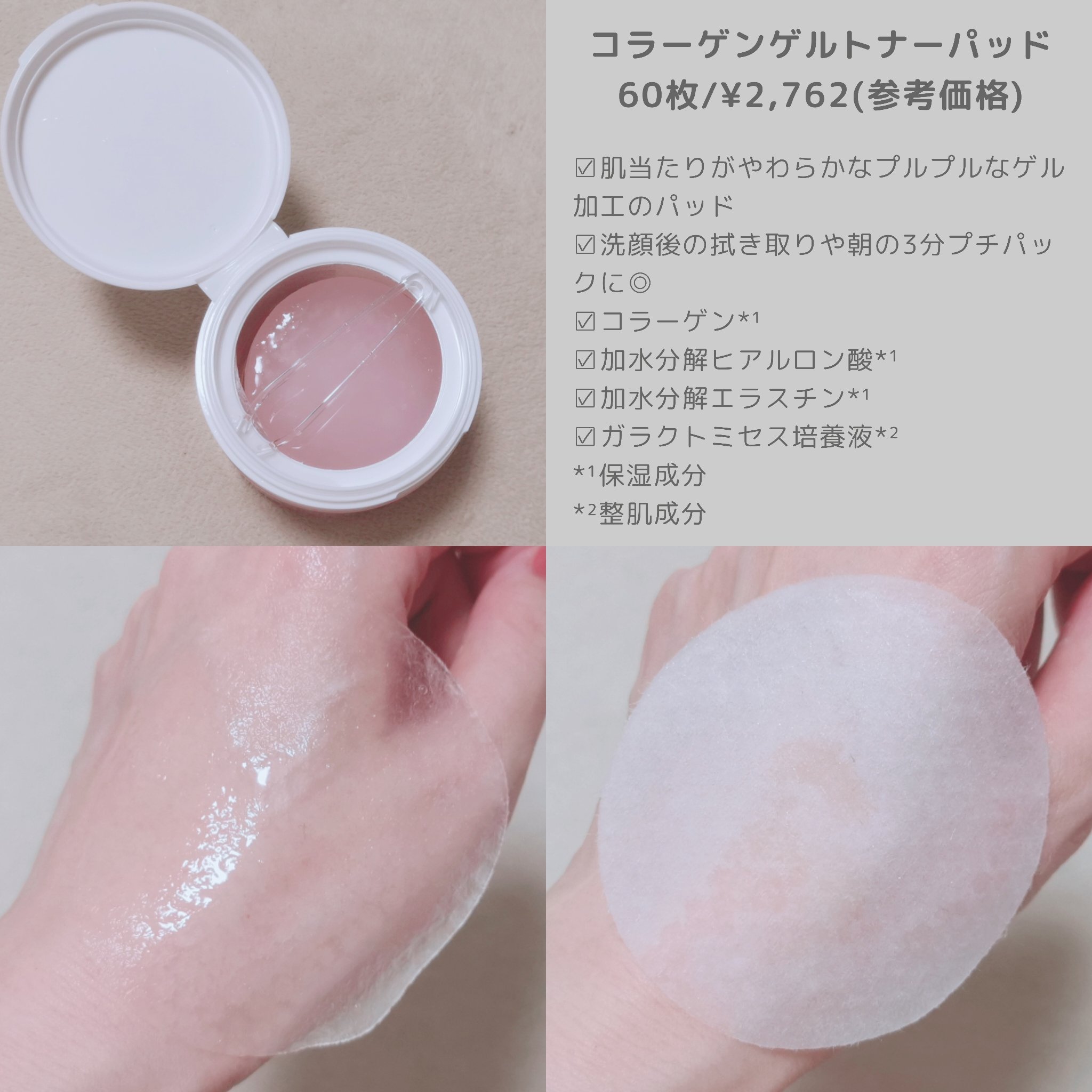 - シートをゲルでコーティングし、肌への摩擦を抑えた新感覚ゲルトナーパッド。 毛穴より小さい超低分子コラーゲンが角質層隅々まで浸透し、肌に潤いと弾力を与える効果が期待できます。(60枚入り)