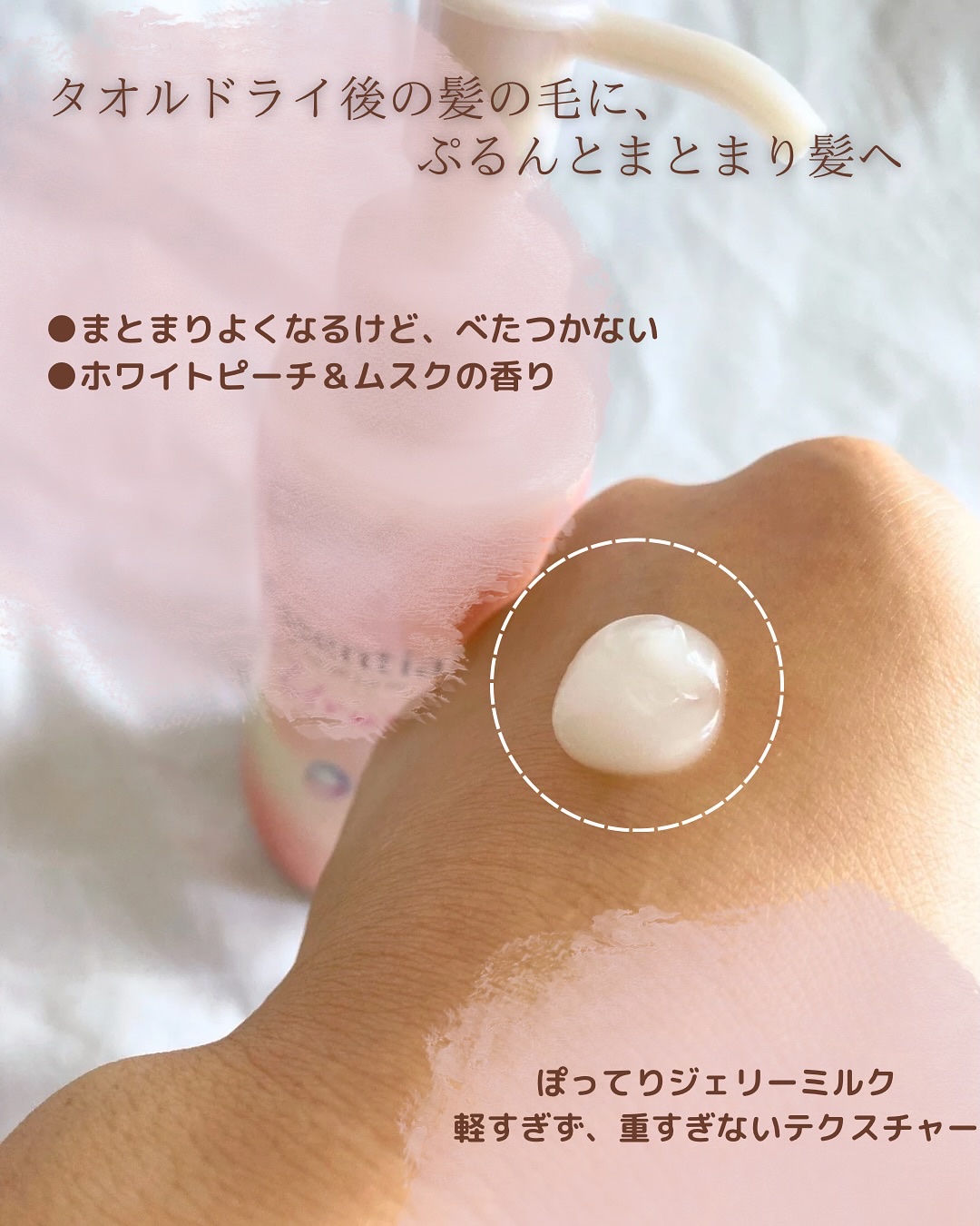 - うねり・広がる髪に。うるおい補給&パック。 翌朝もぷるんとまとまり髪つづくジェリーミルク。 〇乾燥によるうねり・広がりをケア 〇紫外線・摩擦などによるダメージ補修 〇ドライヤー速乾/ドライヤー・アイロンの熱によるダメージ予防 〇翌朝のアイロンもするんときまる 〇保水ミルキープロテイン配合(保湿)<加水分解コラーゲン・乳酸・ローヤルゼリーエキス・ジラウラミドグルタミドリシンNa> ○ときめくホワイトピーチ&ムスクの香り