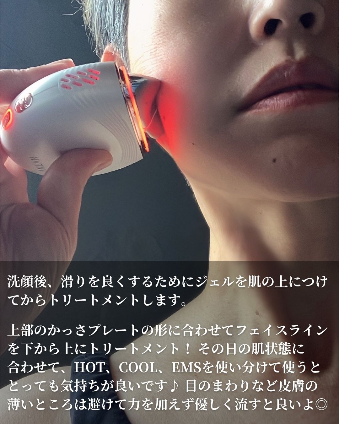 EMS、41℃の温熱ケア、バイブレーションが使える ツボ押し美顔器。顔がすっきりリフトアップし、ポカポカめぐりが良くなるので小顔になりたい人にぴったりの美顔器です! 41℃まで温まり心地よい温度で肌をトリートメントすることができます。まるでホットストーンでエステされているような極上の気持ちの良さです♪ 肌のメリハリが出てフェイスラインがシュッとしました! 血色も良くなりワントーン明るくなったと思います。