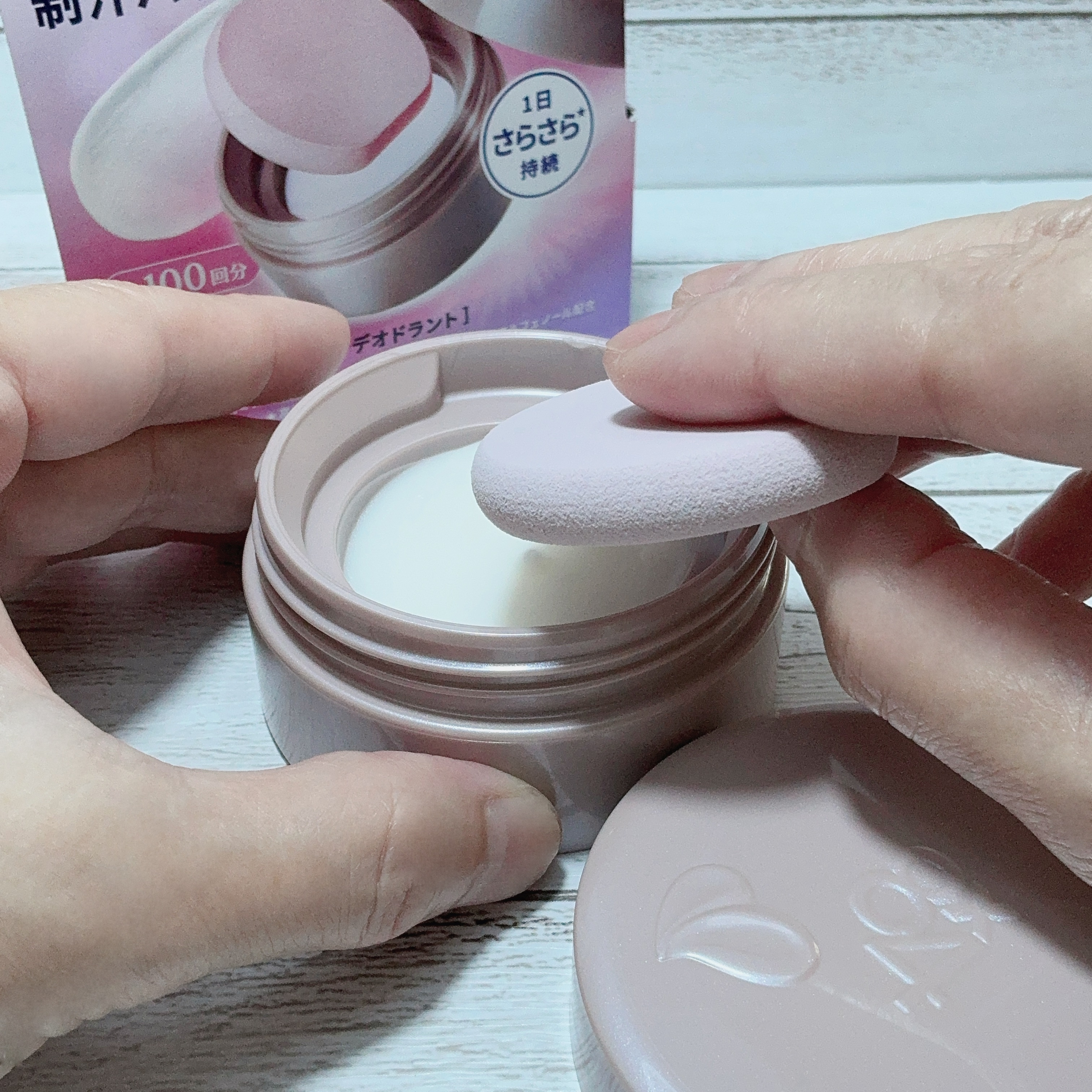 5年間で1000個以上の試作を重ねて完成したアイテム! ワキなど汗やニオイが気になる所に、クッションパフでパテを塗り込むことで、毛穴まで入り込んで密着する、新タイプの制汗デオドランド剤✨ 一見ファンデーションのような見た目でデオドラントアイテムには見えない👀 メイク用のパフみたいなクッションパフで柔らかいペーストのパテを取って汗の気になる箇所に塗り込むよ! 塗り込んだところがするっ!とすれば塗り込めたサイン🙆🏻♀️ パフでパパッと簡単に塗布できるし、さらさらっとした使用感が使いやすいと感じたよ☺️