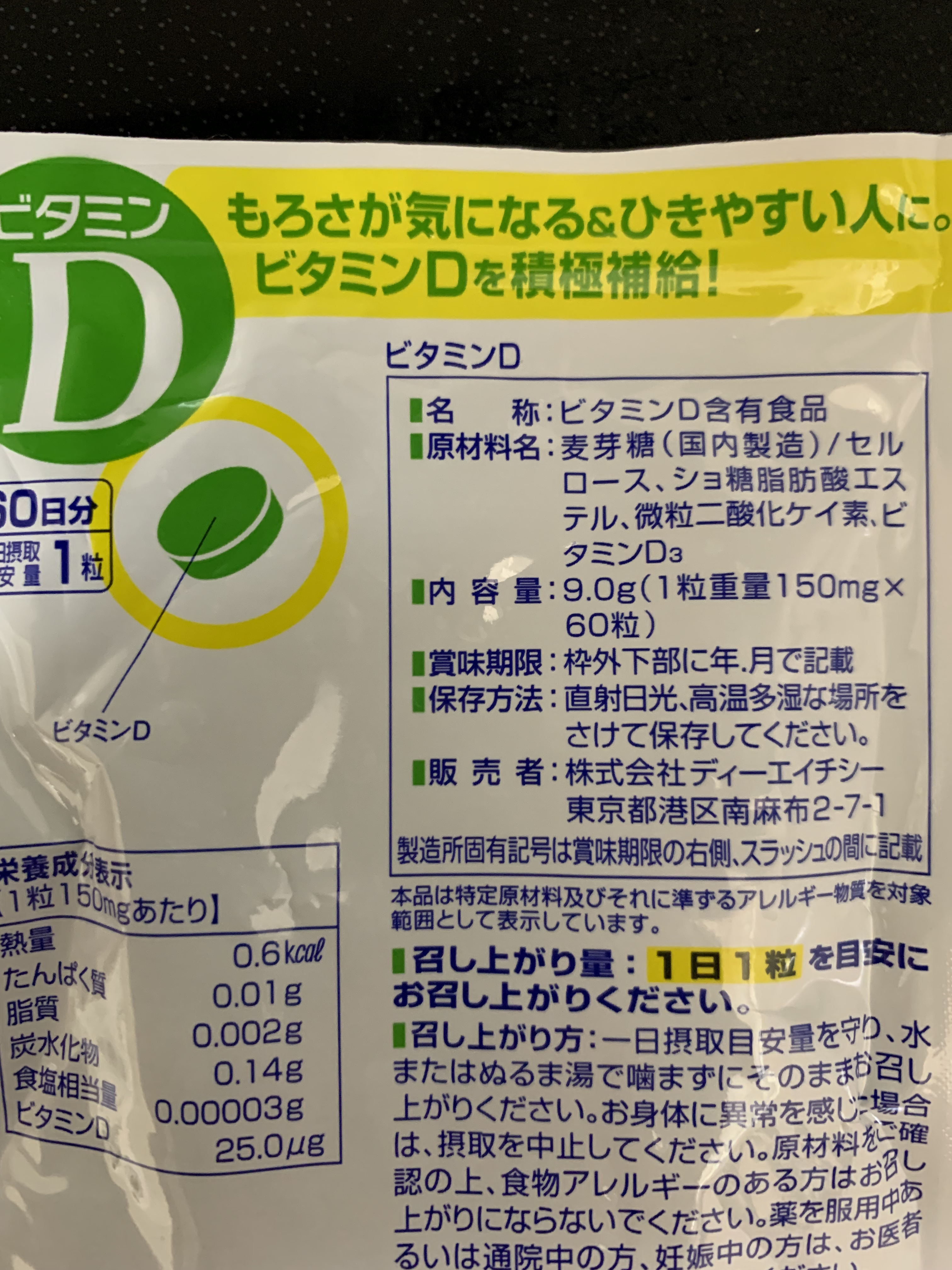 - ビタミンDを手軽なサプリメントにしました。食物から摂りにくく、太陽光を浴びない現代人に不足しがちなビタミンDを、1日目安あたり25μg配合しました。 【ビタミンDの効果】 ビタミンDは、骨を丈夫にしてくれるビタミンです。骨の発達・成長にはカルシウムなどの摂取が効果的と知られていますが、実際にはカルシウムだけでは骨は丈夫になってくれません。だからと言って、カルシウムは骨とは無関係かと言うとそうではなく、カルシウムとビタミンDの力が揃ってはじめて効果が現れます。 ※「ビタミンD3」から「ビタミンD」に名称が変更になりました。 【使い方】 1日1粒目安 ビタミンD 1日1粒総重量(=内容量)150mgあたり、ビタミンD〈1000IU〉25μg 【主要原材料】 ビタミンD 【調整剤等】 麦芽糖、セルロース、ショ糖脂肪酸エステル、二酸化ケイ素