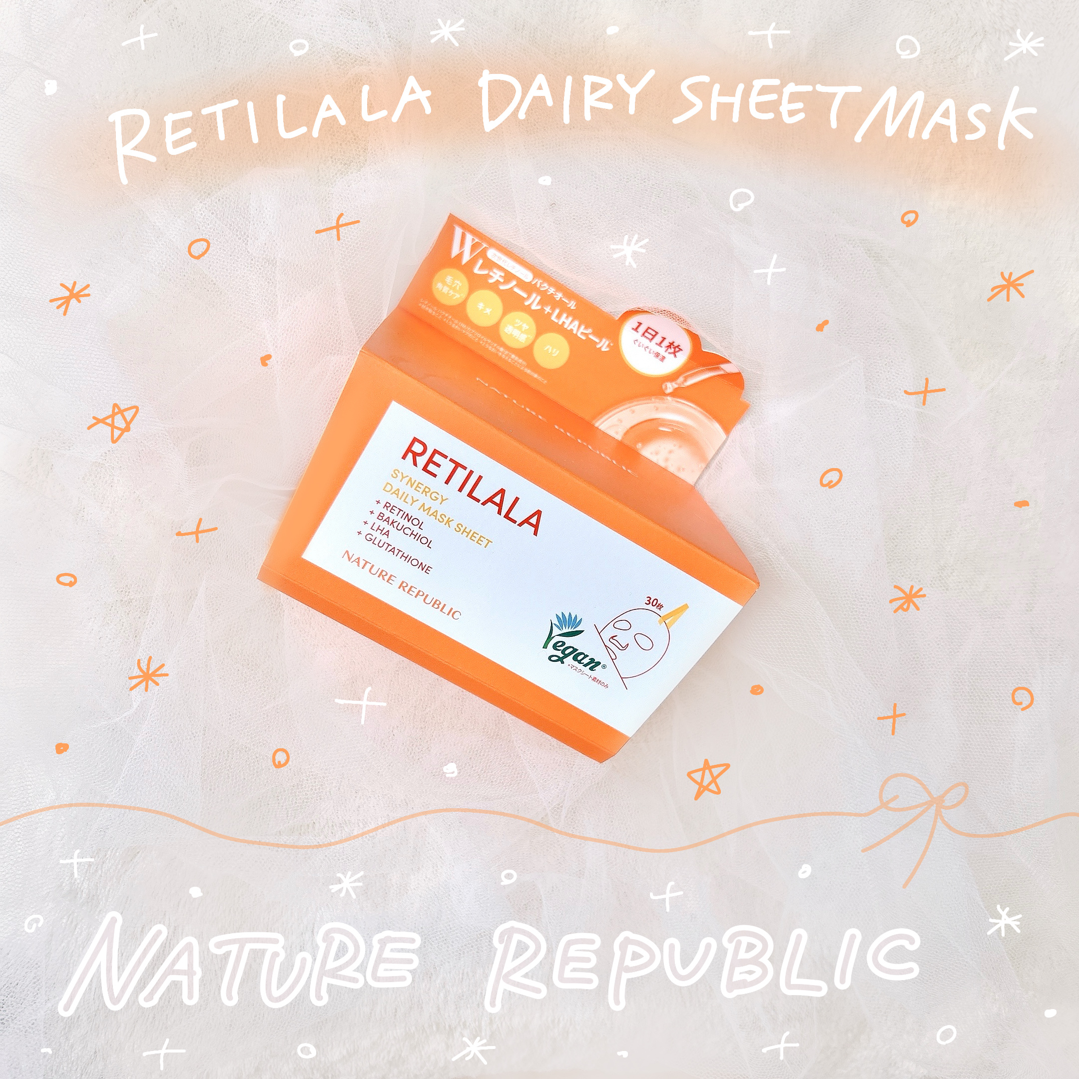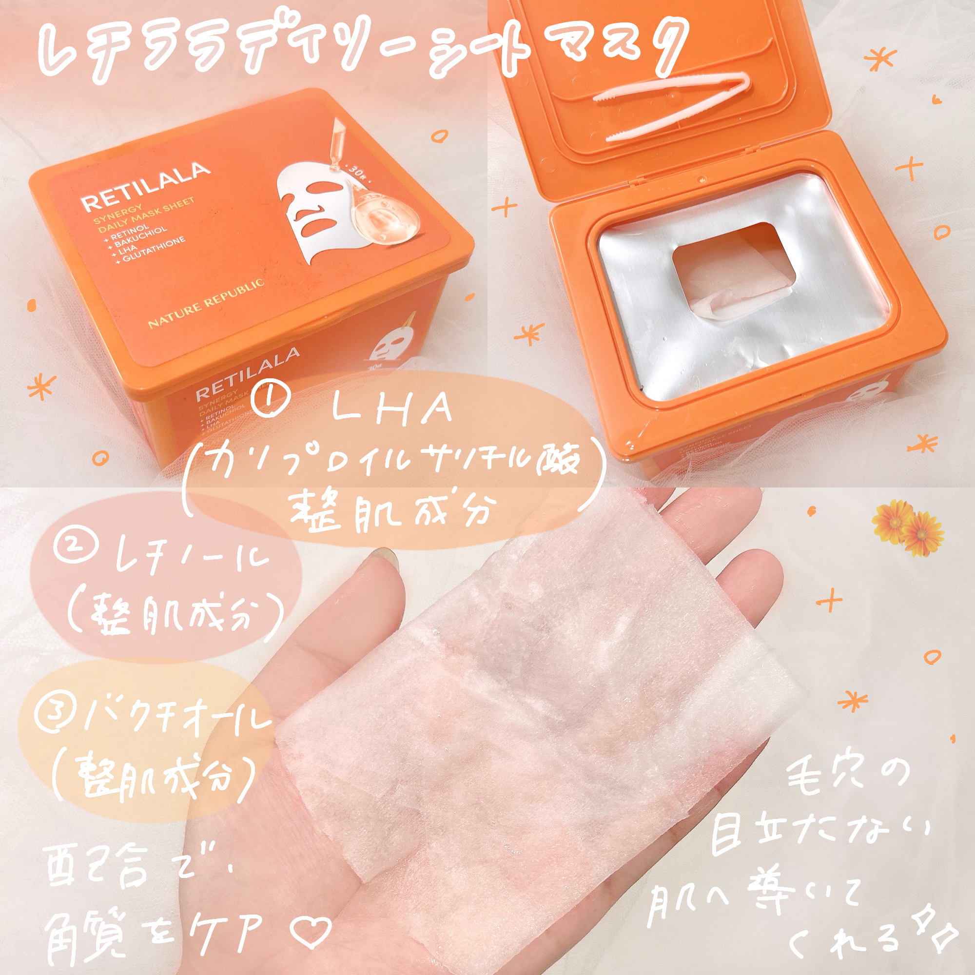 .ネイチャーリパブリックレチララデイリーシートマスク保湿と角質ケア*を同時にできるシートマスク✨レチノール、バクチオール、第4世代ピーリングと呼ぼれるLHA(カプリロイルサリチル酸)配合🌿ユーカリ由来のリヨセル素材のシートが柔らかく、顔にぴっ...