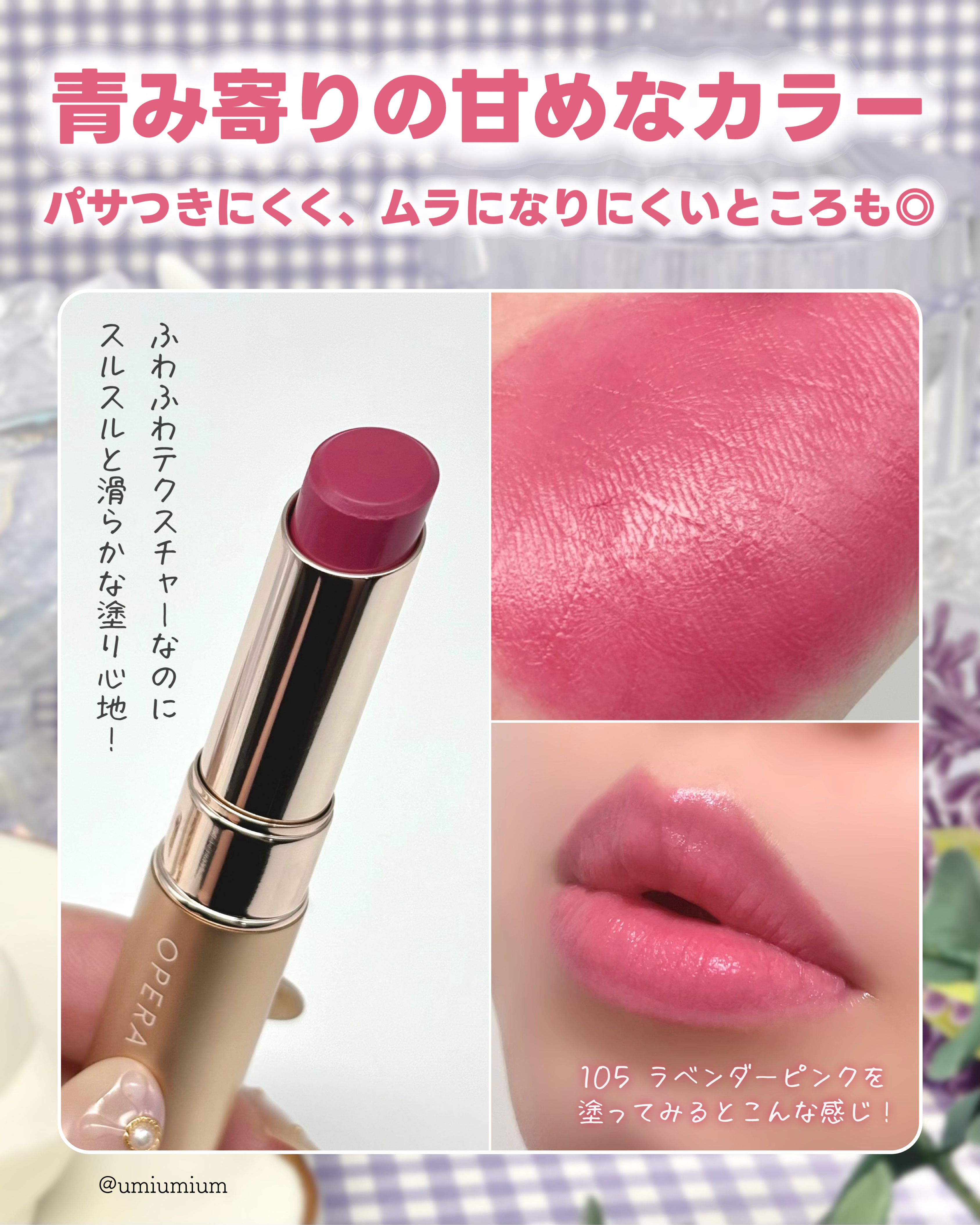 \透けふわピンクが可愛すぎた…🥹/オペラシアーマットリップスティックから、夏の限定色が発売!▶︎105ラベンダーピンク(限定色)どこか儚いラベンダーのニュアンスを一滴加えた血色ピンクに、シフォンケーキのような“ふわり質感”を掛け合わせたラベン...