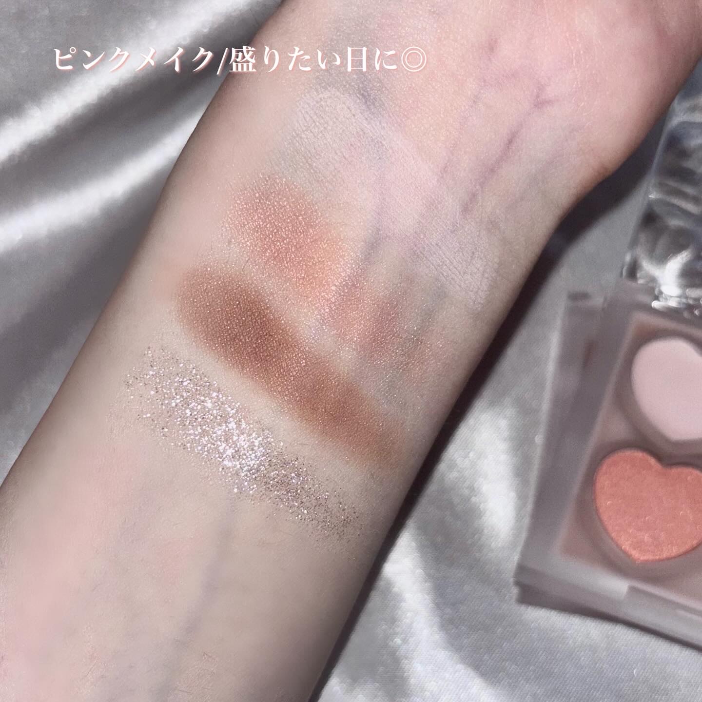 アイシャドウは可愛い配色なのはもちろんのこと、予想していたより発色が良くて驚きました!❤︎ 私は白みピンクが大好物であり得意なのでまぶたでも綺麗に発色してくれてドンピシャなカラー🥹🥹 ラメもそれぞれ個性があって素敵...😭🩷🩷 チークもまた予想以上に発色が良くて、驚きました😳 4色でグラデーションがしやすいし、ちゃんと見た目通りの発色なのでギャップを感じにくくて感動です... 可愛さだけじゃないところがさすがdasique🎀 おまけに付いていたグロスなどもめちゃくちゃ可愛くて、全部見ているだけで幸せになれそうです🥺