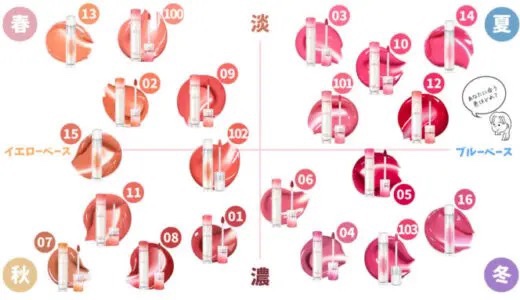 - <01 ビンテージアップル(VINTAGE APPLE)> リンゴ酸ジイソステアリル、水、ビスジグリセリルポリアシルアジペート-2、トリメチルシロキシフェニルジメチコン、水添ポリイソブテン、ダイマージリノール酸ダイマージリノレイルビス(ベヘニル/イソステアリル/フィトステリル)、ポリフェニルシルセスキオキサン、ジグリセリン、セチルPEG/PPG-10/1ジメチコン、ポリソルベート60、セテアレス-20、1,2-ヘキサンジオール、(アクリル酸ヒドロキシエチル/アクリロイルジメチルタウリンNa)コポリマー、スクワラン、ベヘニルアルコール、フェノキシエタノール、カプリリルグリコール、酸化チタン、黄5、赤227、香料、イソステアリン酸ソルビタン、水酸化Al、ポリアクリル酸アンモニウム、青1、BG、トリ(カプリル酸/カプリン酸)グリセリル、テトラ(ジ-t-ブチルヒドロキシヒドロケイヒ酸)ペンタエリスリチル、バラエキス <02 サマーアプリコット(SUMMER APRICOT)> リンゴ酸ジイソステアリル、水、ビスジグリセリルポリアシルアジペート-2、トリメチルシロキシフェニルジメチコン、水添ポリイソブテン、ダイマージリノール酸ダイマージリノレイルビス(ベヘニル/イソステアリル/フィトステリル)、ポリフェニルシルセスキオキサン、ジグリセリン、セチルPEG/PPG-10/1ジメチコン、ポリソルベート60、セテアレス-20、1,2-ヘキサンジオール、(アクリル酸ヒドロキシエチル/アクリロイルジメチルタウリンNa)コポリマー、スクワラン、ベヘニルアルコール、フェノキシエタノール、酸化チタン、カプリリルグリコール、香料、黄4、黄5、赤227、イソステアリン酸ソルビタン、水酸化Al、ポリアクリル酸アンモニウム、赤104(1)、BG、青1、トリ(カプリル酸/カプリン酸)グリセリル、テトラ(ジ-t-ブチルヒドロキシヒドロケイヒ酸)ペンタエリスリチル、バラエキス <03 ブラッシュドピーチ(BLUSHED PEACH)> リンゴ酸ジイソステアリル、水、ビスジグリセリルポリアシルアジペート-2、トリメチルシロキシフェニルジメチコン、ダイマージリノール酸ダイマージリノレイルビス(ベヘニル/イソステアリル/フィトステリル)、水添ポリイソブテン、ポリフェニルシルセスキオキサン、ジグリセリン、セチルPEG/PPG-10/1ジメチコン、ポリソルベート60、セテアレス-20、1,2-ヘキサンジオール、(アクリル酸ヒドロキシエチル/アクリロイルジメチルタウリンNa)コポリマー、スクワラン、ベヘニルアルコール、フェノキシエタノール、酸化チタン、カプリリルグリコール、香料、赤227、イソステアリン酸ソルビタン、黄4、黄5、水酸化Al、ポリアクリル酸アンモニウム、BG、トリ(カプリル酸/カプリン酸)グリセリル、テトラ(ジ-t-ブチルヒドロキシヒドロケイヒ酸)ペンタエリスリチル、バラエキス <04 ペールプラム(PALE PLUM)> リンゴ酸ジイソステアリル、水、ビスジグリセリルポリアシルアジペート-2、トリメチルシロキシフェニルジメチコン、水添ポリイソブテン、ダイマージリノール酸ダイマージリノレイルビス(ベヘニル/イソステアリル/フィトステリル)、ポリフェニルシルセスキオキサン、ジグリセリン、セチルPEG/PPG-10/1ジメチコン、ポリソルベート60、セテアレス-20、1,2-ヘキサンジオール、(アクリル酸ヒドロキシエチル/アクリロイルジメチルタウリンNa)コポリマー、スクワラン、ベヘニルアルコール、酸化チタン、フェノキシエタノール、カプリリルグリコール、香料、黄5、赤227、イソステアリン酸ソルビタン、黄4、赤104(1)、水酸化Al、ポリアクリル酸アンモニウム、酸化鉄、青1、BG、トリ(カプリル酸/カプリン酸)グリセリル、テトラ(ジ-t-ブチルヒドロキシヒドロケイヒ酸)ペンタエリスリチル、バラエキス <05 フレッシュチェリー(FRESH CHERRY)> リンゴ酸ジイソステアリル、水、ビスジグリセリルポリアシルアジペート-2、トリメチルシロキシフェニルジメチコン、水添ポリイソブテン、ダイマージリノール酸ダイマージリノレイルビス(ベヘニル/イソステアリル/フィトステリル)、ポリフェニルシルセスキオキサン、ジグリセリン、セチルPEG/PPG-10/1ジメチコン、ポリソルベート60、セテアレス-20、1,2-ヘキサンジオール、(アクリル酸ヒドロキシエチル/アクリロイルジメチルタウリンNa)コポリマー、スクワラン、ベヘニルアルコール、フェノキシエタノール、カプリリルグリコール、赤227、香料、黄4、赤104(1)、イソステアリン酸ソルビタン、黄5、青1、BG、トリ(カプリル酸/カプリン酸)グリセリル、テトラ(ジ-t-ブチルヒドロキシヒドロケイヒ酸)ペンタエリスリチル、バラエキス <06 デイリーモーブ(DAILY MAUVE)> リンゴ酸ジイソステアリル、水、ビスジグリセリルポリアシルアジペート-2、トリメチルシロキシフェニルジメチコン、水添ポリイソブテン、ダイマージリノール酸ダイマージリノレイルビス(ベヘニル/イソステアリル/フィトステリル)、ポリフェニルシルセスキオキサン、ジグリセリン、セチルPEG/PPG-10/1ジメチコン、ポリソルベート60、セテアレス-20、1,2-ヘキサンジオール、(アクリル酸ヒドロキシ