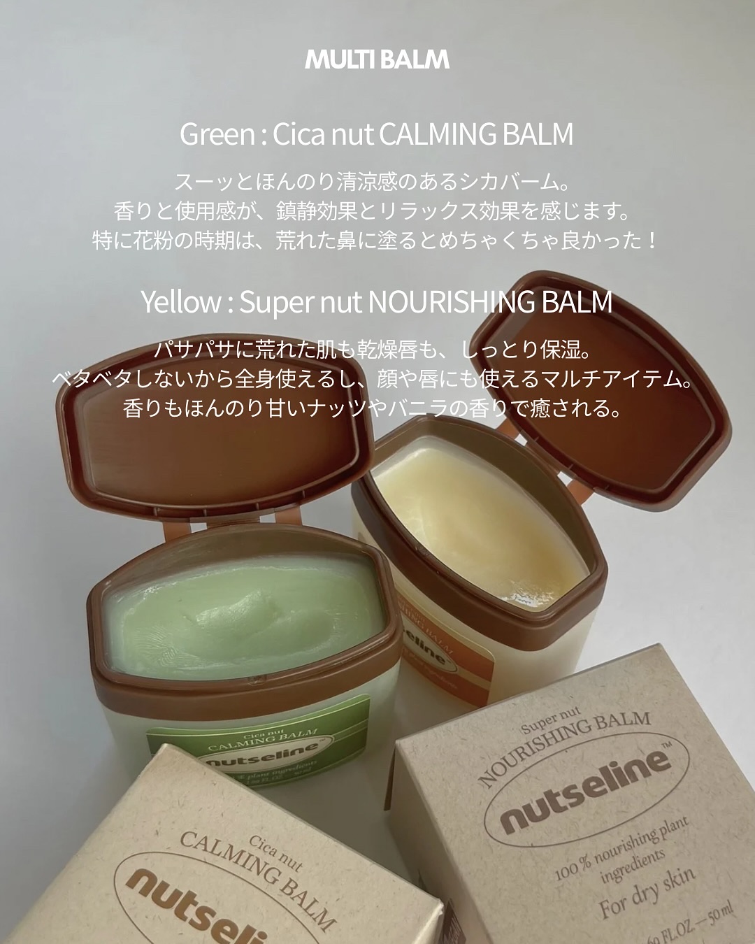 RedVelvetのスルギの愛用品としても知られる"nutseline"🧡植物由来成分で乾燥肌の全年齢の方々が使えるスキン・ボディケアブランドなんだそう🌿どのアイテムも香りが良すぎて全人類の癒しになること間違いなし😇●ナリシングバーム、シカバ...