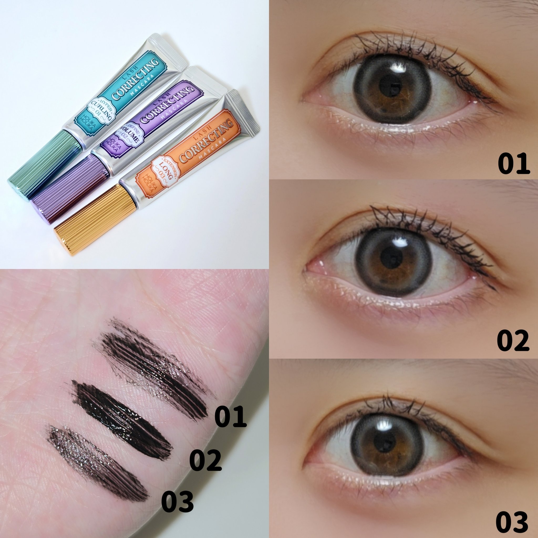 あなたはどんなまつ毛になりたい??👀✨なりたい仕上がりに合わせてマスカラを選べる😆🌸HOLIKAHOLIKAホリカホリカラッシュコレクティングマスカラ01ハイパーカーリング/02ディファインボリューム/03ロングエクステンション01のハイパー...