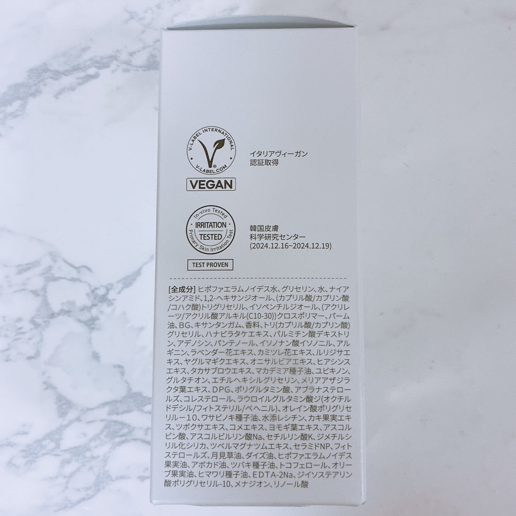 - <50ml> ヒポファエラムノイデス水、グリセリン、水、ナイアシンアミド、1,2-ヘキサンジオール、(カプリル酸/カプリン酸/コハク酸)トリグリセリル、インペンチルジオール、(アクリルーツ/アクリル酸アルキル(C10-30))クロスポリマー、パーム油、BG、キサンタンガム、香料、トリ(カプリル酸/カプリン酸)グリセリル、ハナビラタケエキス、パルミチン酸デキストリン、アデノシン、パンテノール、イソノナン酸イソノニル、アルギニン、ラベンダー花エキス、カミツレ花エキス、ルリジサエキス、ヤグルマギクエキス、オニサルビアエキス、ヒアシンスエキス、タカサブロウエキス、マカデミア種子油、ユビキノン、グルタチオン、エチルヘキシルグリセリン、メリアアザジラクタ葉エキス、DPG、ポリグルタミン酸、アブラナステロールズ、コレステロール、ラウロイルグルタミン酸ジ(オクチルドデシル/フィトステリル/ベヘニル)、オレイン酸ポリグリセリー10、ワサビノキ種子油、水レシチン、カキ果実エキス、ツボクサエキス、コメエキス、ヨモギ葉エキス、アスコルビン酸、アスコルビルリン酸Na、セチルリン酸K、ジメチルシリル化シリカ、ツベルマグナツムエキス、セラミドNP、フィトステロールズ、月見草油、ダイズ油、ヒポファエラムノイデス果実油、アボカド油、ツバキ種子油、トコフェロール、オリーブ果実油、ヒマワリ種子油、EDTA-2Na、ジインステアリン酸ポリグリセリル-10、メナジオン、リノール酸 <100ml> ヒポファエラムノイデス水、グリセリン、水、ナイアシンアミド、1,2-ヘキサンジオール、(カプリル酸/カプリン酸/コハク酸)トリグリセリル、インペンチルジオール、(アクリルーツ/アクリル酸アルキル(C10-30))クロスポリマー、パーム油、BG、キサンタンガム、香料、トリ(カプリル酸/カプリン酸)グリセリル、ハナビラタケエキス、パルミチン酸デキストリン、アデノシン、パンテノール、イソノナン酸イソノニル、アルギニン、ラベンダー花エキス、カミツレ花エキス、ルリジサエキス、ヤグルマギクエキス、オニサルビアエキス、ヒアシンスエキス、タカサブロウエキス、マカデミア種子油、ユビキノン、グルタチオン、エチルヘキシルグリセリン、メリアアザジラクタ葉エキス、DPG、ポリグルタミン酸、アブラナステロールズ、コレステロール、ラウロイルグルタミン酸ジ(オクチルドデシル/フィトステリル/ベヘニル)、オレイン酸ポリグリセリー10、ワサビノキ種子油、水レシチン、カキ果実エキス、ツボクサエキス、コメエキス、ヨモギ葉エキス、アスコルビン酸、アスコルビルリン酸Na、セチルリン酸K、ジメチルシリル化シリカ、ツベルマグナツムエキス、セラミドNP、フィトステロールズ、月見草油、ダイズ油、ヒポファエラムノイデス果実油、アボカド油、ツバキ種子油、トコフェロール、オリーブ果実油、ヒマワリ種子油、EDTA-2Na、ジインステアリン酸ポリグリセリル-10、メナジオン、リノール酸