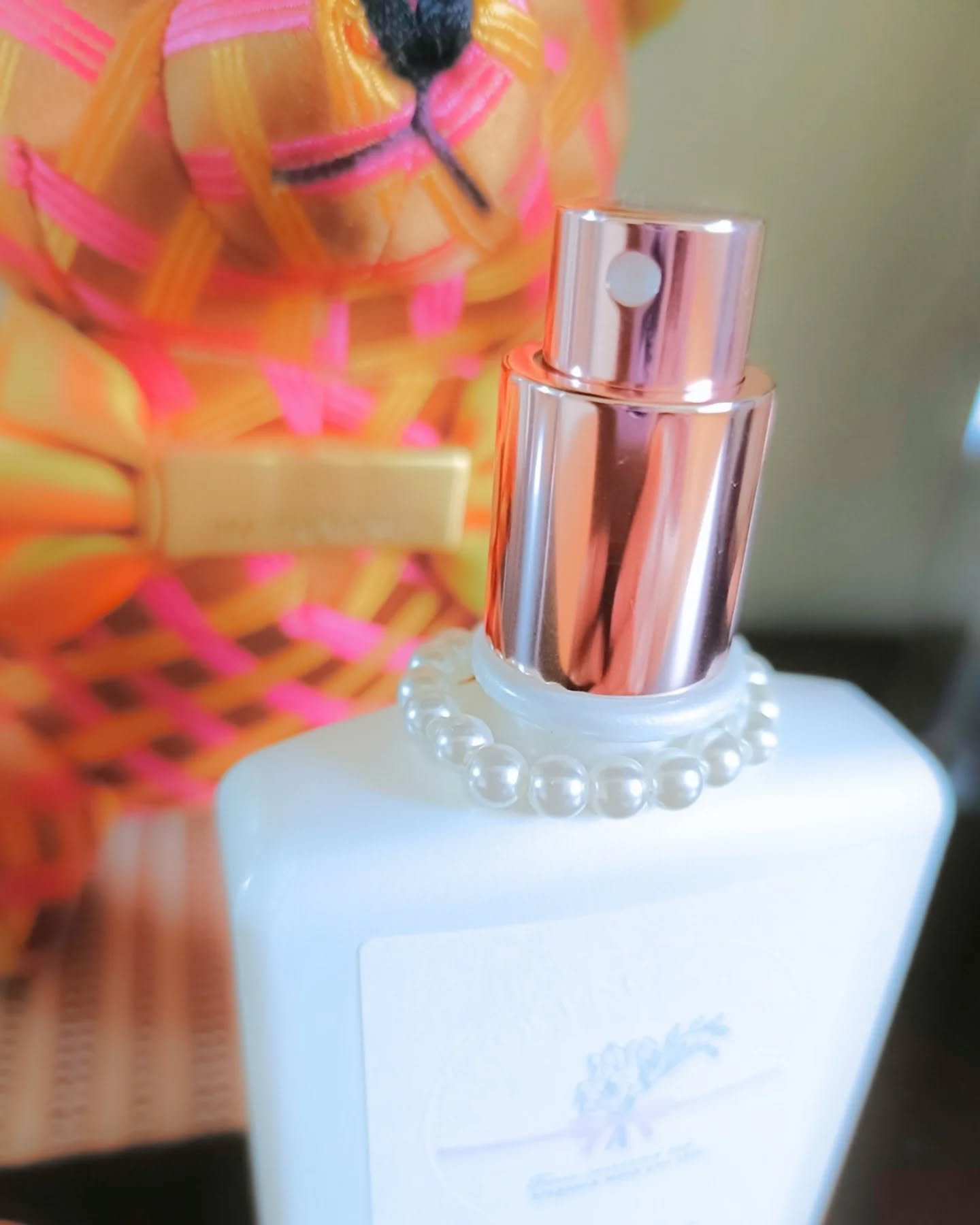 ボトルを見た瞬間にあまりの可愛さに一目惚れ♡ 本当に開けた瞬間にキュン♡ 高級感ただようデザインでボトルもキャップも色まで可愛い♡ シュッとひと吹きすると優しいフローラルな香りがふわっと広がって どこか懐かしい優しい香りがするねと旦那さまが♡ 甘すぎず上品な香りなうえに香りが強くないので場所問わず使用できそうな感じ!