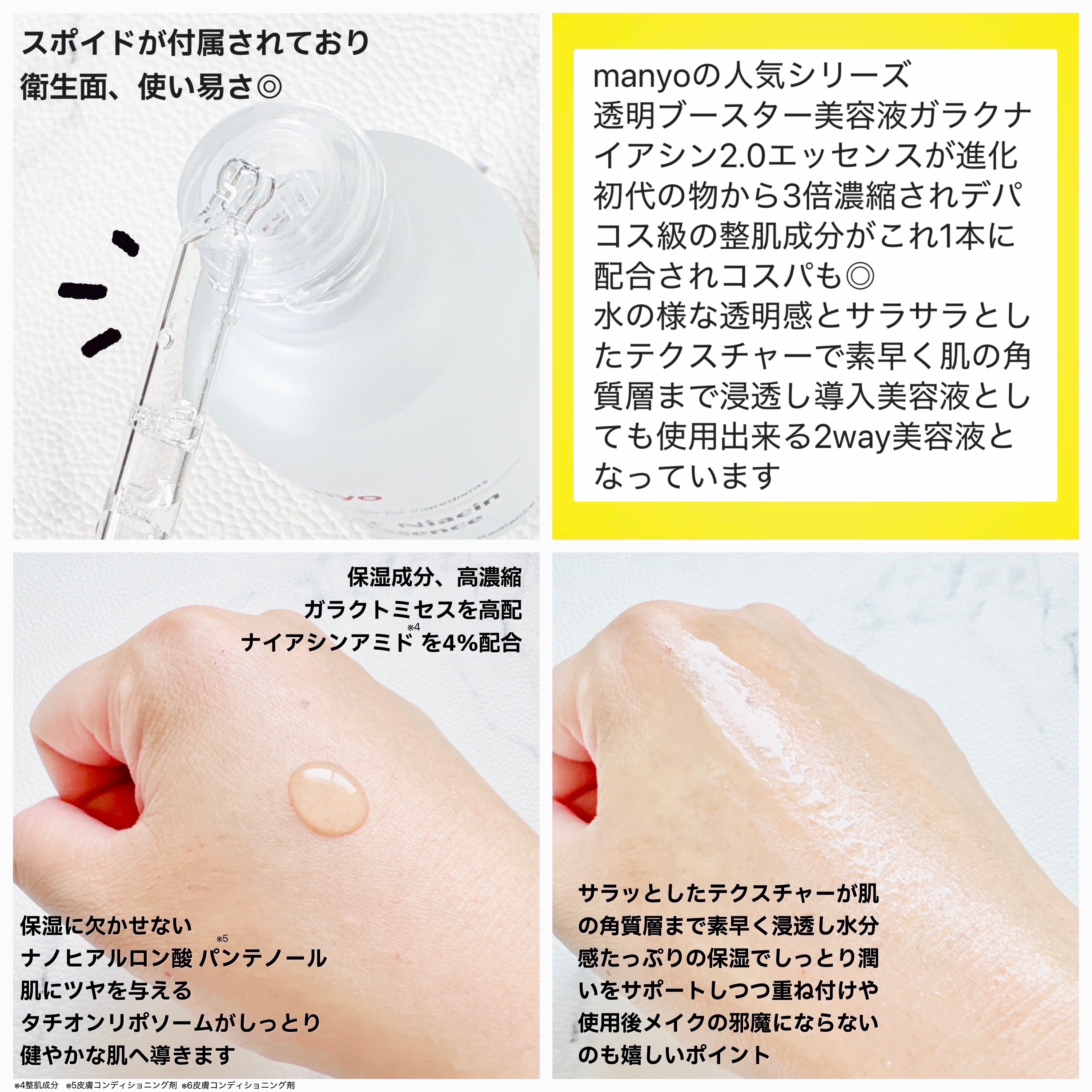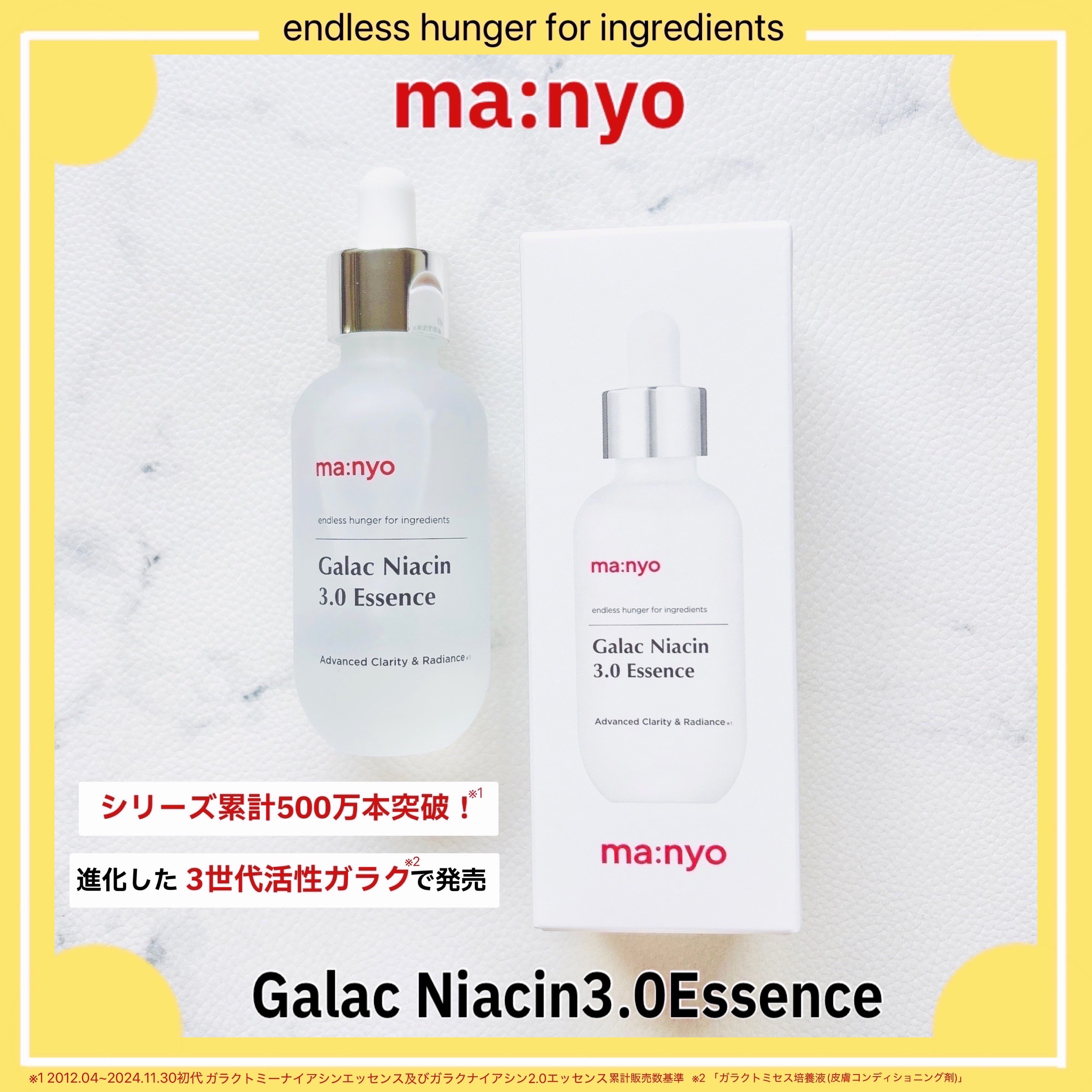 - ・manyoの独自成分!3倍*¹高濃縮でより強力な3世代ガラク 電気石を発酵器に添加し、微生物の成長に刺激を与えガラクトミセス菌の活性度増加!生長性の高いガラクトミセス菌株からガラクトミセス培養液*²を抽出し、肌のキメケアとともに透明感*³のあるお肌へ *¹ 3倍は高濃縮工程前、初期のガラクトミセス培養液(皮膚コンディショニング剤)と比較した場合 *² 皮膚コンディショニング剤 *³ キメが整った肌が与える印象のこと ・肌トーンケア*⁴、毛穴ケア*⁵、肌キメケア*⁶まで、保湿効果 3世代ガラク(Galactomy Active™ 7)と、ナイアシンアミド²配合で保湿成分をより強化し、くすんだ肌トーン*⁸から肌キメ、毛穴*⁵までケアします。 *⁴ 保湿により肌にツヤを与え明るい印象に見せること *⁵ 保湿することで肌をなめらかに整えツヤを与えることで毛穴を目立たなくすること *⁶ キメが整った素肌へ導くお手入れのこと *⁷ ガラクトミセス培養液、BG(どちらも皮膚コンディショニング剤)、1,2-ヘキサンジオール(溶剤) *⁸ 乾燥による ・水のようなさらっとしたテクスチャーで、べたつかず角質層まですっと浸透 保湿成分配合のウォータリーテクスチャーで、使用感は既存の「ガラク ナイアシン 2.0 エッセンス」と同じくさらっとした水のようなテクスチャー。角質層まで素早く浸透!べたつかない使用感で使いやすくて、角質層の奥まで潤い、表面はなめらかで整った肌へ 3月17日(月)からオフラインのバラエティショップで販売 3月24日(月)よりQoo10公式、楽天公式ショップで販売