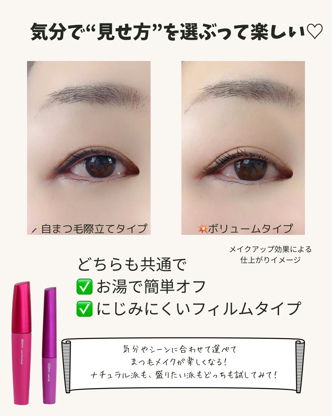 自まつ毛際建てタイプのブラシが塗りやすくて仕上がりも自然に盛れるから好き🫶✨ ロングタイプまつげが長く伸びて目が大きく見えるよ ボリュームタイプふわっと束感ある仕上がり