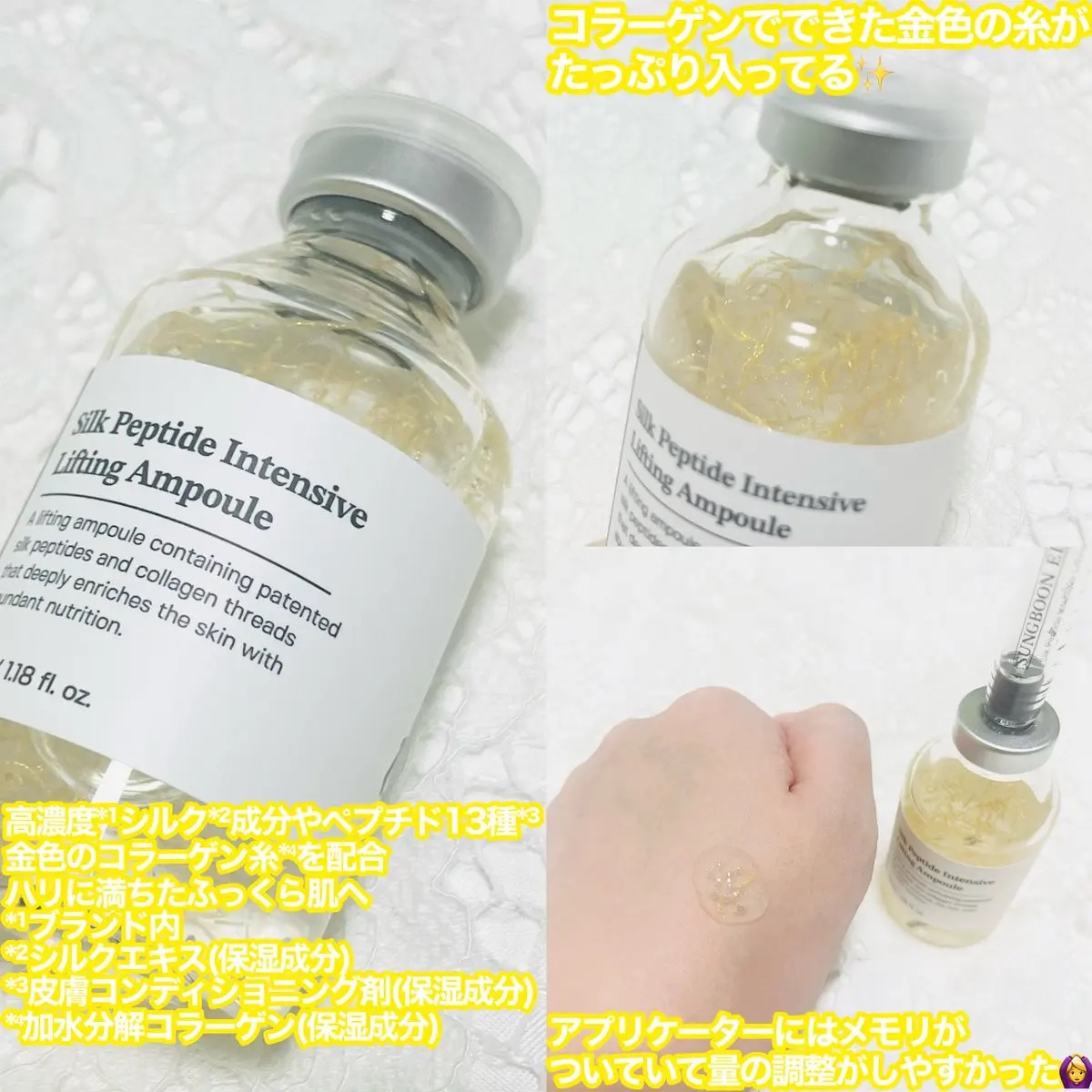 高濃度*1シルク*2+ペプチド*3で深いしわも、弾力も1本で💛*1ブランド内*2シルク水(保湿成分)*3保湿成分シルクペプチドインテンシブリフティングアンプル注射器みたいな特徴的なパケがかわいい💉アンプルに差し込んで吸い上げて使うのが斬新です...