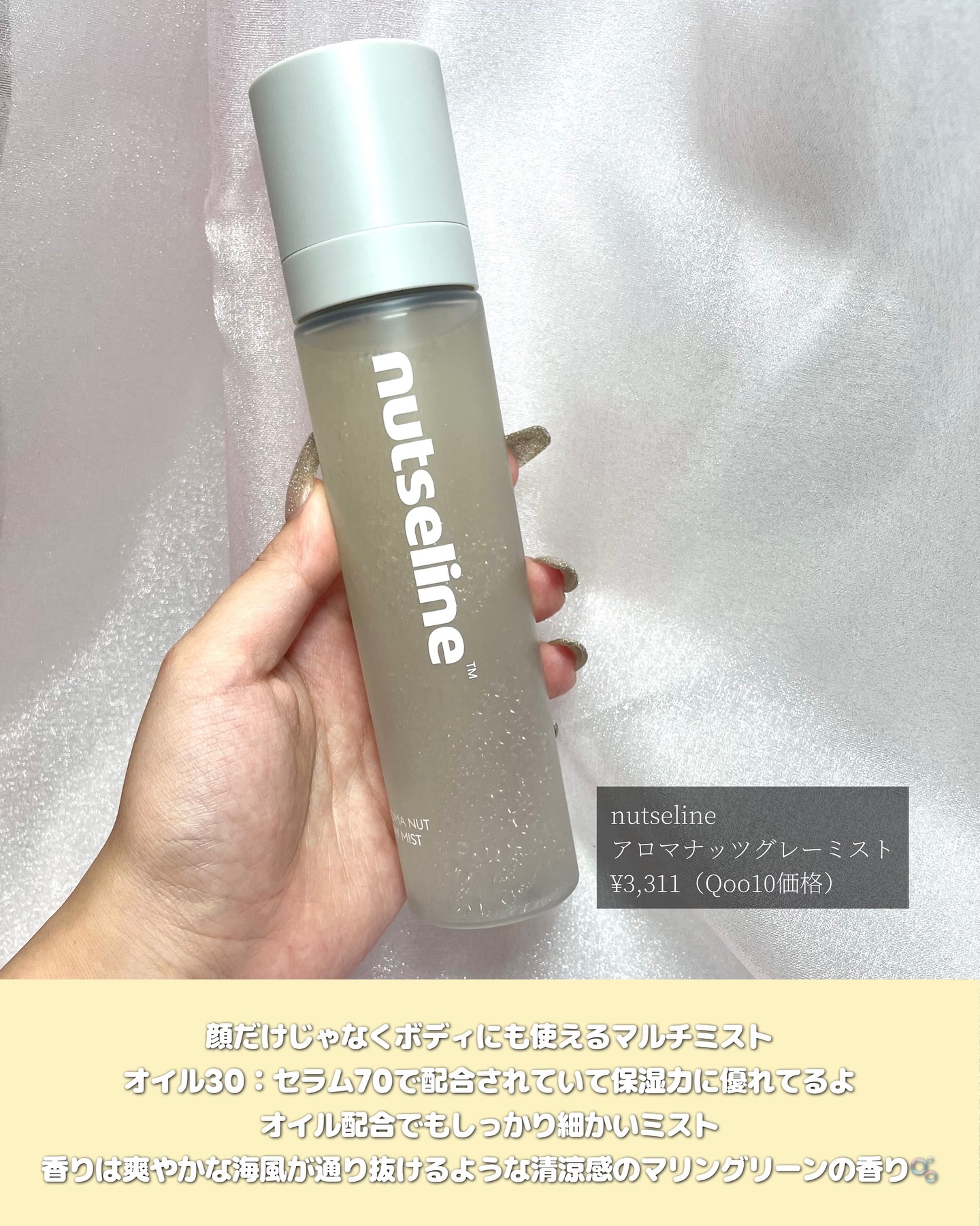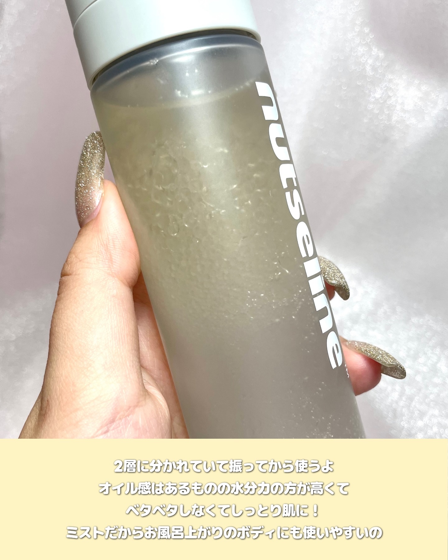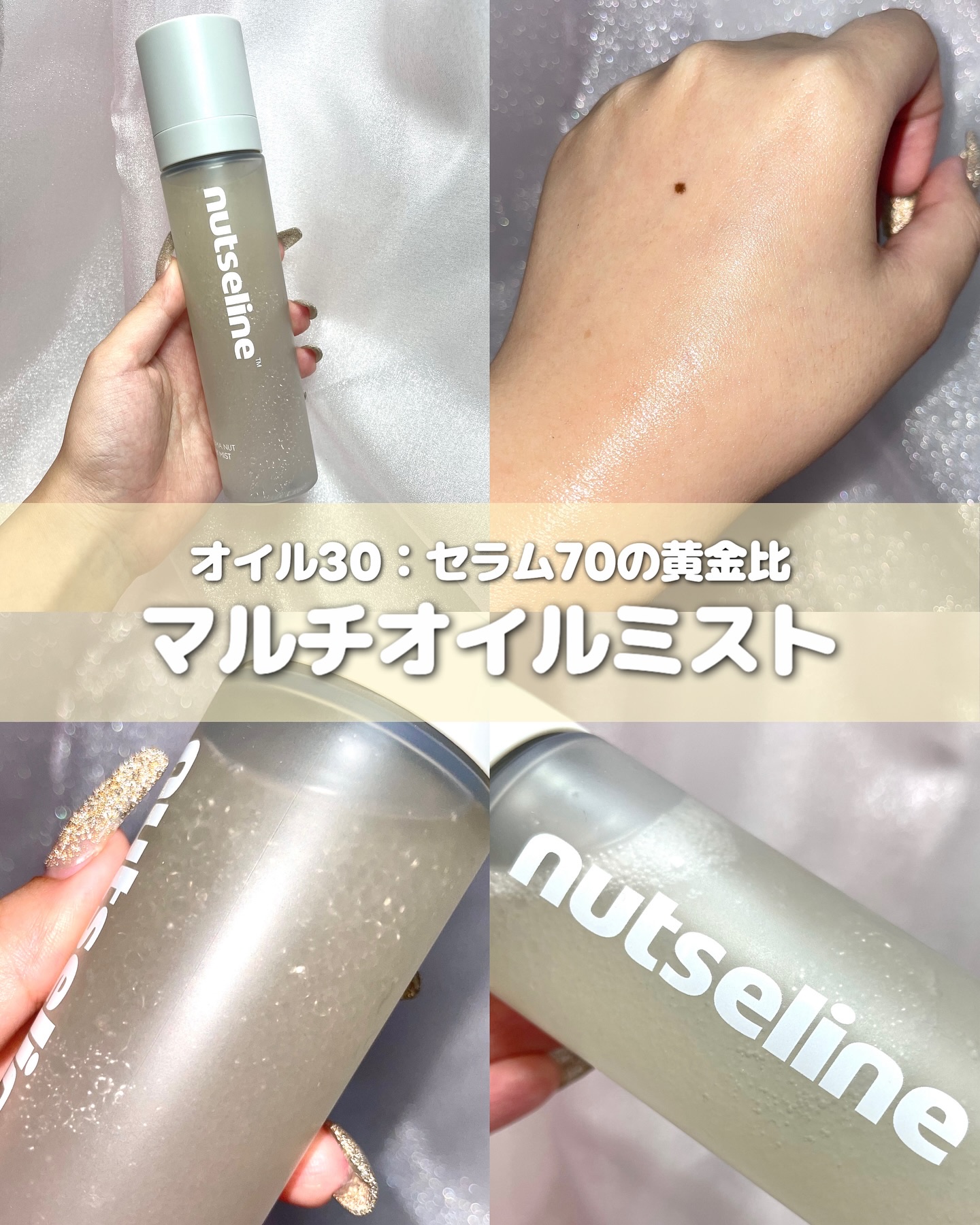 .nutselineの新作♪グレーオイルミストは、オイル30.セラム70の保湿の黄金比率で作られたミスト✨オイルinなのにムラのない霧状噴射でしっとりとした保湿感♡ボディだけじゃなく、メイク前後にも使えるんだけど、メイク前に使用するとメイクの...