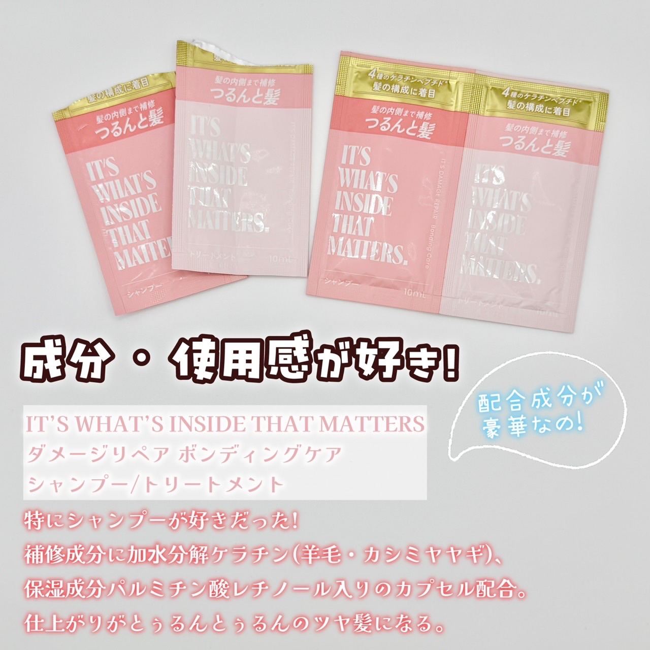 つるんと髪を手に入れたい方必見のアイテム! シャンプーは4種類のケラチンペプチド*と13種類のアミノ酸系成分***が入っていて、髪の毛を補修しながら潤い補給もしてくれるのˎˊ˗ 3分泡パックシャンプーっていう方法も超おすすめ❕ シャンプーを泡立てた後、目安3分放置するだけなんだけど髪内部までケアしてくれてる気がする🤍 ドライヤーやアイロンで傷んだ髪を内側までケアしてくれてありがたいの🫶🏻