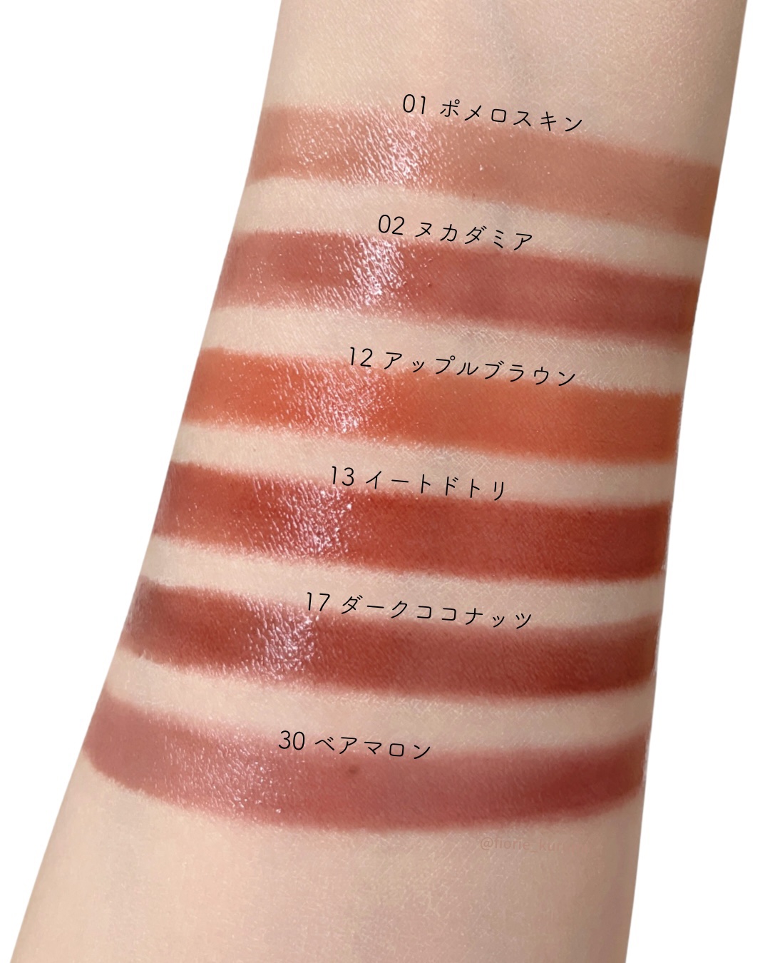 大人気のうるつや光沢ティントリップ、ラカのフルーティーグラムティント全22色をまとめました! 色持ちも良いので塗り直しができないときにも◎ ※121アッシュナッツは変色しやすいので注意⚠️