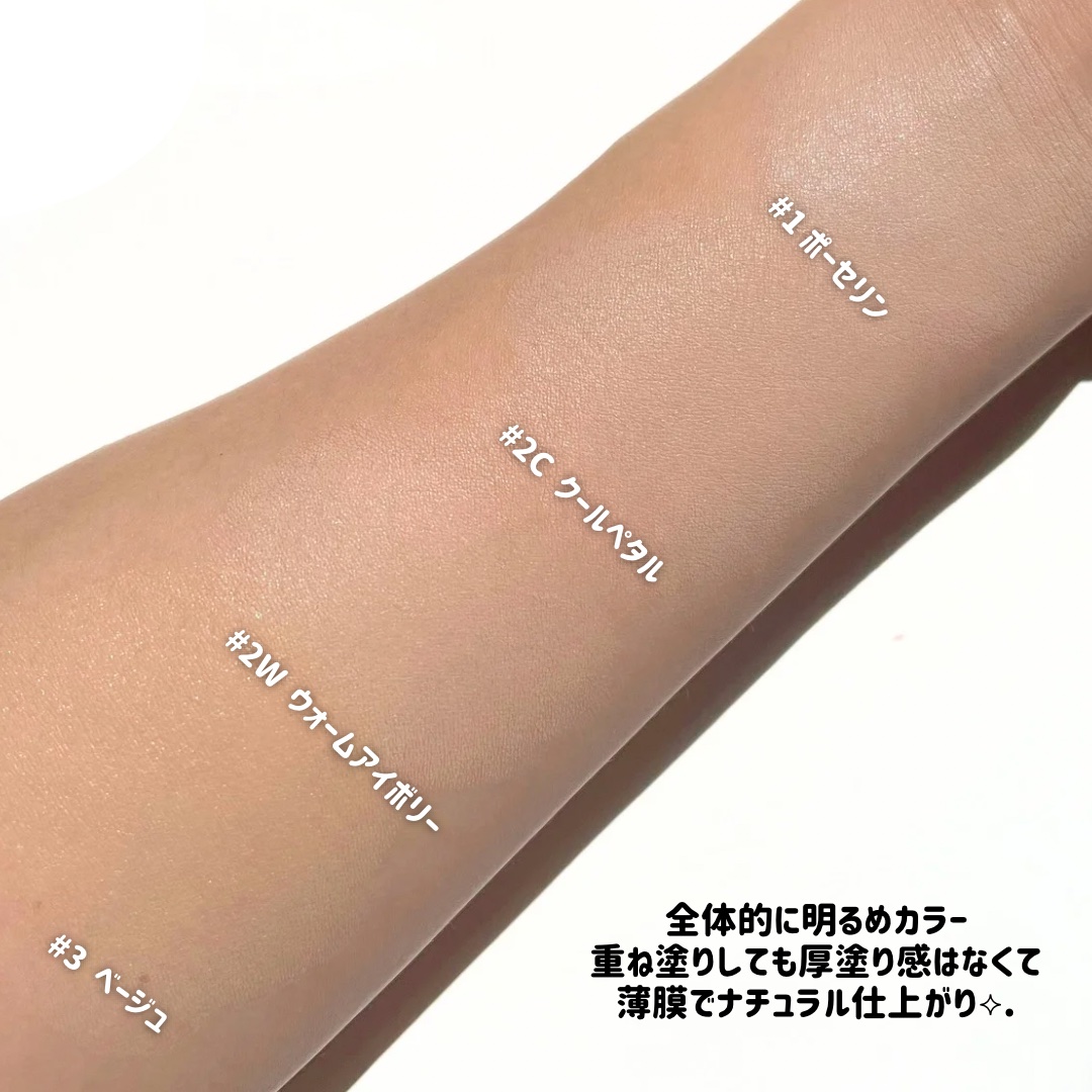 - <#1 ホスリン> 精製水、酸化チタン (CI 77891)、サイクロペンタシロキサン、エチルヘキシルメトキシシンナメート、イソドデカン、エチルヘキシルサリチレート、メチルトリメチコン、ラウリルPEG-9ポリジメチルシロキシエチルジメチコン、ジフェニルシロキシフェニルトリメチコン、グリセリン、プロパンジオール、ブチレングリコールジカプリレート/ジカプレート、ナイアシンアミド、トリメチルシロキシケイ酸、1,2-ヘキサンジオール、ジステアジモニウムヘクトライト、ビフィダ発酵溶解物、ガラクトミセス発酵液、ヒアルロン酸、加水分解ヒアルロン酸、ヒアルロン酸Na、PEG-10ジメチコン、トリデシルトリメリテート、ジメチコン、アクリレーツ/ステアリルアクリレーツ/ジメチコンメタクリレートコポリマー、硫酸マグネシウム、ジメチコン/ビニルジメチコンクロスポリマー、合成フルオロフロゴパイト、ポリグリセリル-3ポリジメチルシロキシエチルジメチコン、オクチルドデカノール、ポリヒドロキシステアリン酸、ステアリン酸、アルミナ、水酸化アルミニウム、トリエトキシカプリリルシラン、エチルヘキシルパルミテート、イソプロピルミリステート、イソステアリン酸、レシチン、ポリグリセリル-4イソステアレート、アデノシン、トリソジウムエチレンジアミンジコハク酸、ポリグリセリル-3ポリリシノレイン酸、イソプロピルチタニウムトリイソステアレート、ネオペンチルグリコールジエチルヘキサノエート、PEG-9ポリジメチルシロキシエチルジメチコン、トコフェロール、ポリプロピルシルセスキオキサン、ブチレングリコール、エチルヘキシルグリセリン、香料、酸化鉄黄 (CI 77492)、酸化鉄赤 (CI 77491)、酸化鉄黒 (CI 77499) <#2c クールペタル> 精製水、酸化チタン (CI 77891)、サイクロペンタシロキサン、エチルヘキシルメトキシシンナメート、イソドデカン、エチルヘキシルサリチレート、メチルトリメチコン、ラウリルPEG-9ポリジメチルシロキシエチルジメチコン、ジフェニルシロキシフェニルトリメチコン、グリセリン、プロパンジオール、ブチレングリコールジカプリレート/ジカプレート、ナイアシンアミド、トリメチルシロキシケイ酸、1,2-ヘキサンジオール、ジステアジモニウムヘクトライト、ビフィダ発酵溶解物、ガラクトミセス発酵液、ヒアルロン酸、加水分解ヒアルロン酸、ヒアルロン酸Na、PEG-10ジメチコン、トリデシルトリメリテート、ジメチコン、アクリレーツ/ステアリルアクリレーツ/ジメチコンメタクリレートコポリマー、硫酸マグネシウム、ジメチコン/ビニルジメチコンクロスポリマー、オクチルドデカノール、合成フルオロフロゴパイト、ポリグリセリル-3ポリジメチルシロキシエチルジメチコン、ポリヒドロキシステアリン酸、ステアリン酸、アルミナ、水酸化アルミニウム、トリエトキシカプリリルシラン、ポリグリセリル-4イソステアレート、エチルヘキシルパルミテート、イソプロピルミリステート、イソステアリン酸、レシチン、アデノシン、トリソジウムエチレンジアミンジコハク酸、ポリグリセリル-3ポリリシノレイン酸、イソプロピルチタニウムトリイソステアレート、ネオペンチルグリコールジエチルヘキサノエート、PEG-9ポリジメチルシロキシエチルジメチコン、トコフェロール、ポリプロピルシルセスキオキサン、ブチレングリコール、エチルヘキシルグリセリン、香料、酸化鉄黄 (CI 77492)、酸化鉄赤 (CI 77491)、酸化鉄黒 (CI 77499) <#2w ウォームアイボリー> 精製水、酸化チタン(CI 77891)、サイクロペンタシロキサン、エチルヘキシルメトキシシンナメート、イソドデカン、エチルヘキシルサリチレート、メチルトリメチコン、ラウリルPEG-9ポリジメチルシロキシエチルジメチコン、ジフェニルシロキシフェニルトリメチコン、グリセリン、プロパンジオール、ブチレングリコールジカプリレート/ジカプレート、ナイアシンアミド、トリメチルシロキシケイ酸、1,2-ヘキサンジオール、ジステアジモニウムヘクトライト、ビフィダ発酵溶解物、ガラクトミセス発酵液、ヒアルロン酸、加水分解ヒアルロン酸、ヒアルロン酸Na、PEG-10ジメチコン、トリデシルトリメリテート、ジメチコン、アクリレーツ/ステアリルアクリレーツ/ジメチコンメタクリレートコポリマー、硫酸マグネシウム、ジメチコン/ビニルジメチコンクロスポリマー、オクチルドデカノール、合成フルオロフロゴパイト、ポリグリセリル-3ポリジメチルシロキシエチルジメチコン、ポリヒドロキシステアリン酸、ステアリン酸、アルミナ、水酸化アルミニウム、トリエトキシカプリリルシラン、ポリグリセリル-4イソステアレート、エチルヘキシルパルミテート、イソプロピルミリステート、イソステアリン酸、レシチン、アデノシン、トリソジウムエチレンジアミンジコハク酸、ポリグリセリル-3ポリリシノレイン酸、イソプロピルチタニウムトリイソステアレート、ネオペンチルグリコールジエチルヘキサノエー