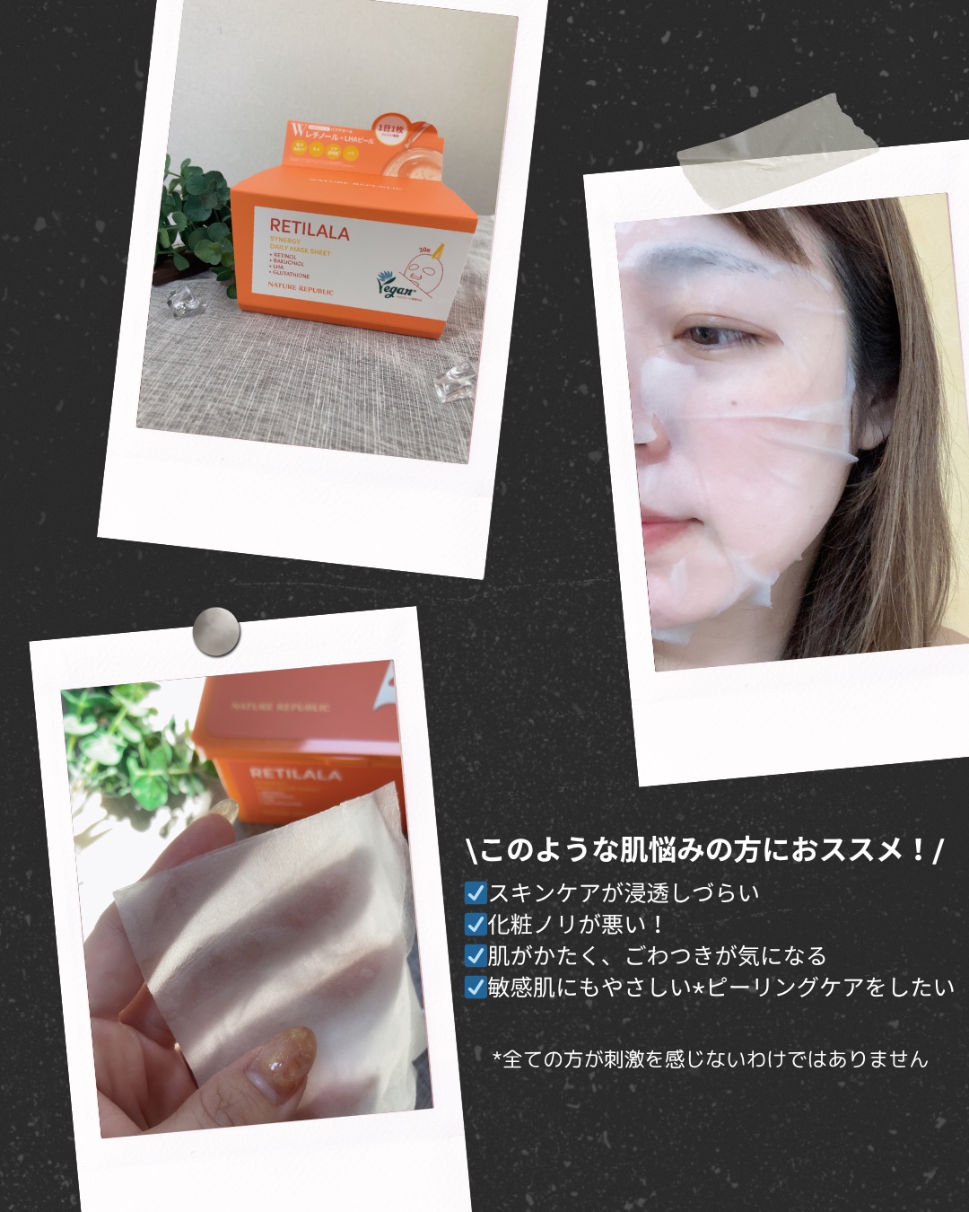 .ネイチャーリパブリックレチララデイリーシートマスク保湿と角質ケア*を同時にできるシートマスク✨レチノール、バクチオール、第4世代ピーリングと呼ぼれるLHA(カプリロイルサリチル酸)配合🌿ユーカリ由来のリヨセル素材のシートが柔らかく、顔にぴっ...