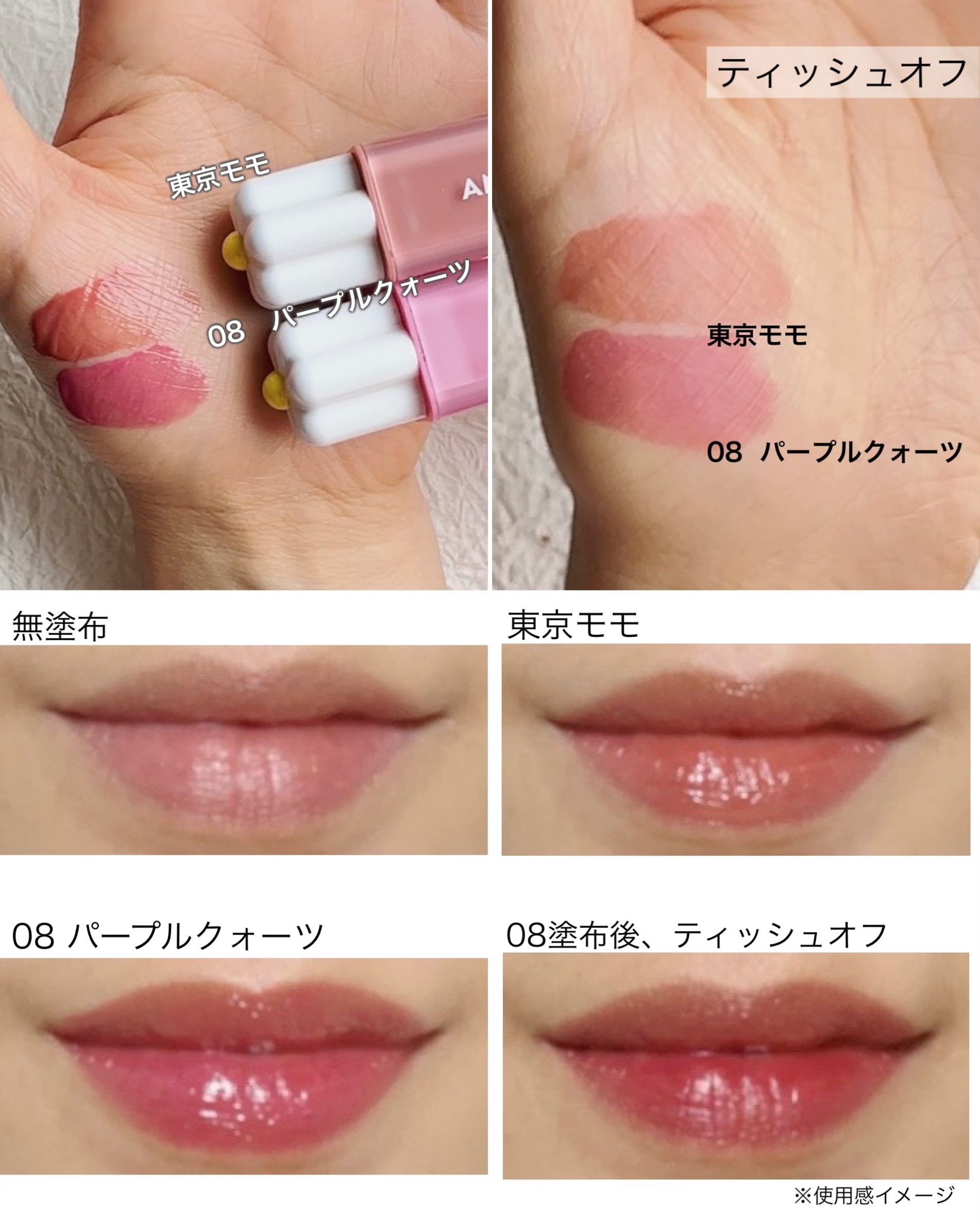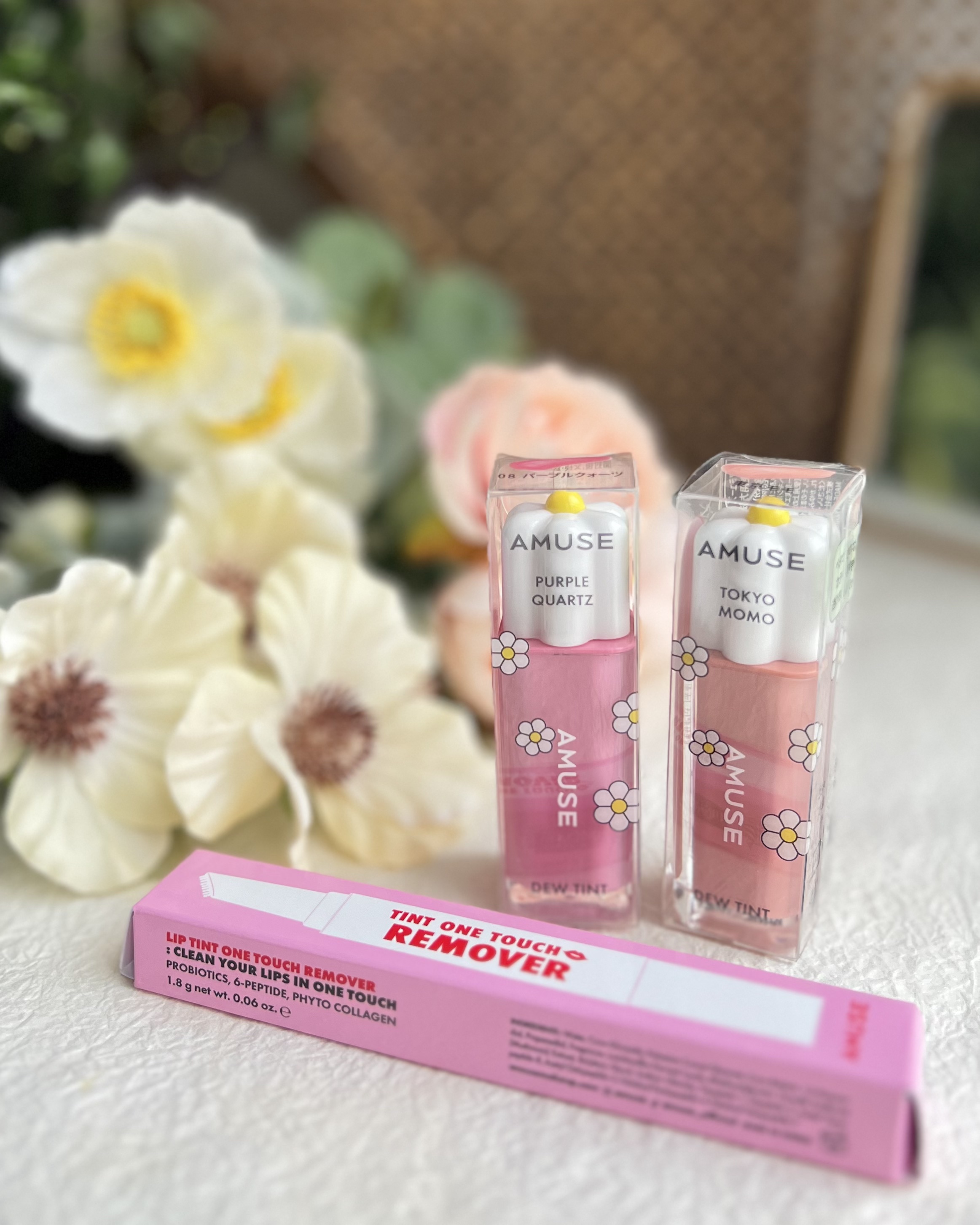 お花のパケが可愛すぎる🌼飲み会リップでもおすすめなティント♡AMUSEのデューティント3色とティントワンタッチリムーバーをスウォッチ♡😆AMUSEアミューズデューティント日本限定東京モモ/03ヘルシーモモ/08パープルクォーツティントワンタッ...