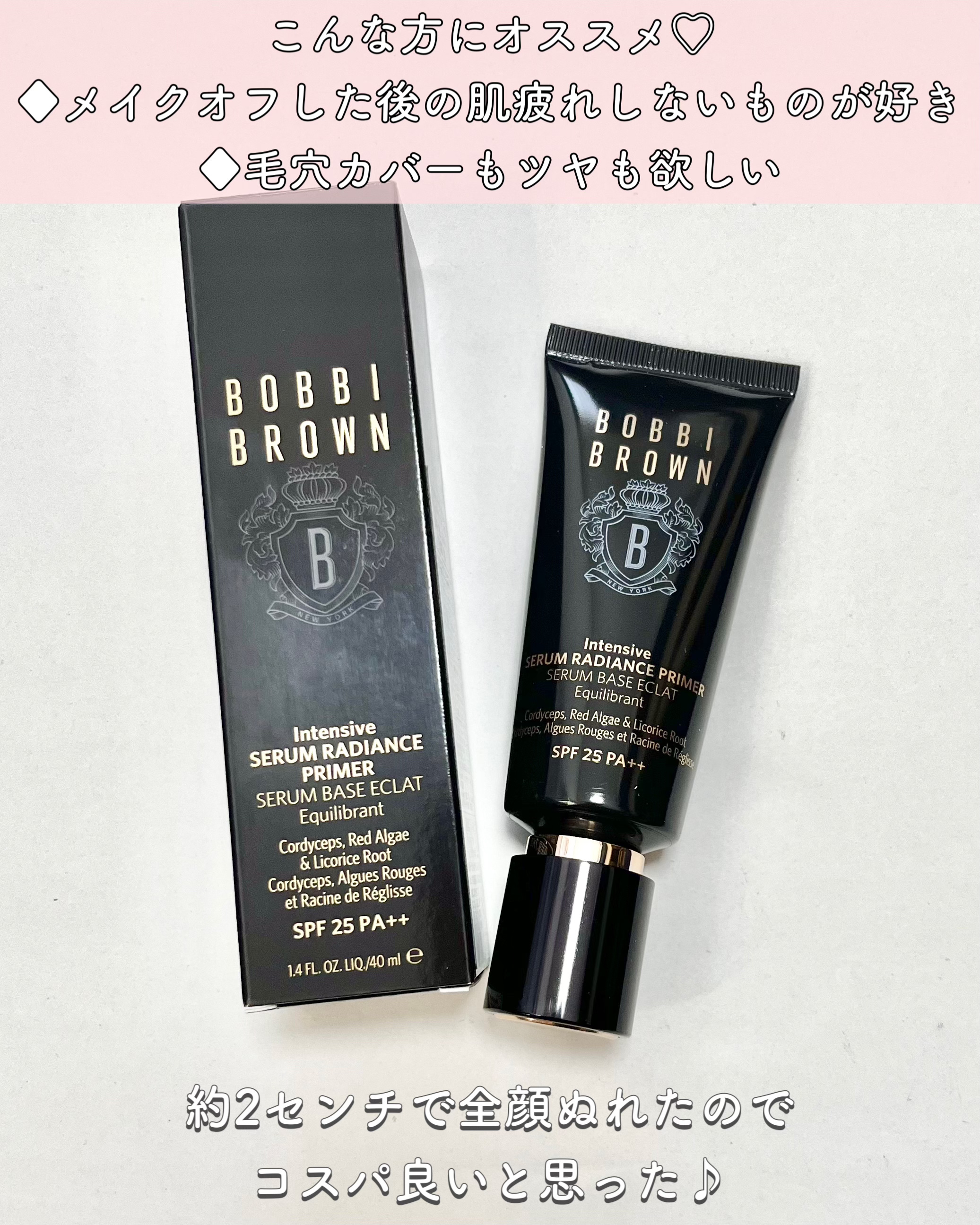 疲れ知らずの肌にボビイブラウンインテンシブセラムラディアンスプライマーSPF25(PA++)7,150円(税込)SNSで話題!濃密美容液プライマー!まるでスキンケアみたいにするする伸びて重たさゼロ。使用感のレベルが桁違いにいい。肌にぴたっと密...