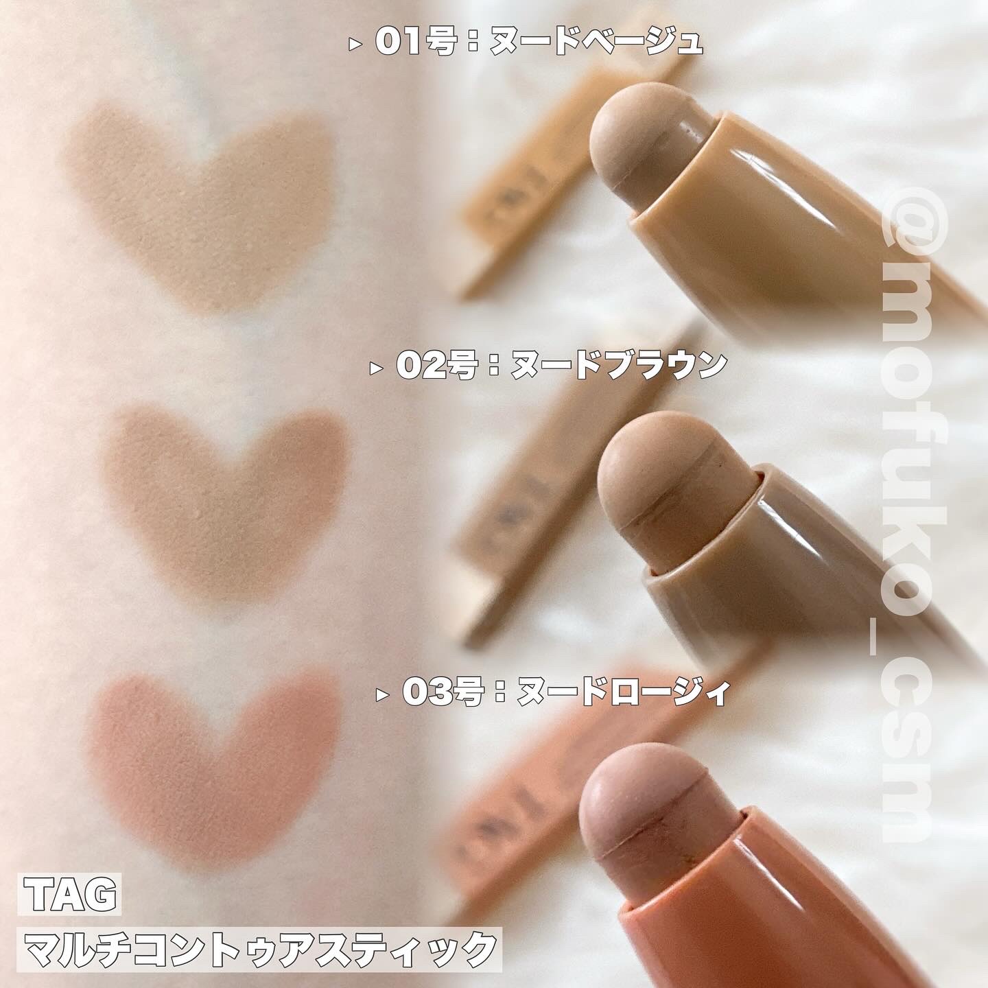 本日紹介するのはTAGマルチコントゥアスティックです✨✨マルチコントゥアスティックは、鼻筋、目元、顎、ヘアラインなど好きな部位に陰影の演出可能なススティック❣️丸いシェイプのスティックでスルスルと描きやすく様々な部位に活用できるマルチユーズコ...