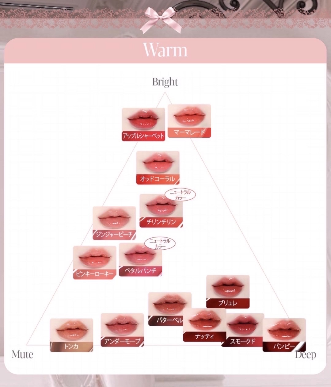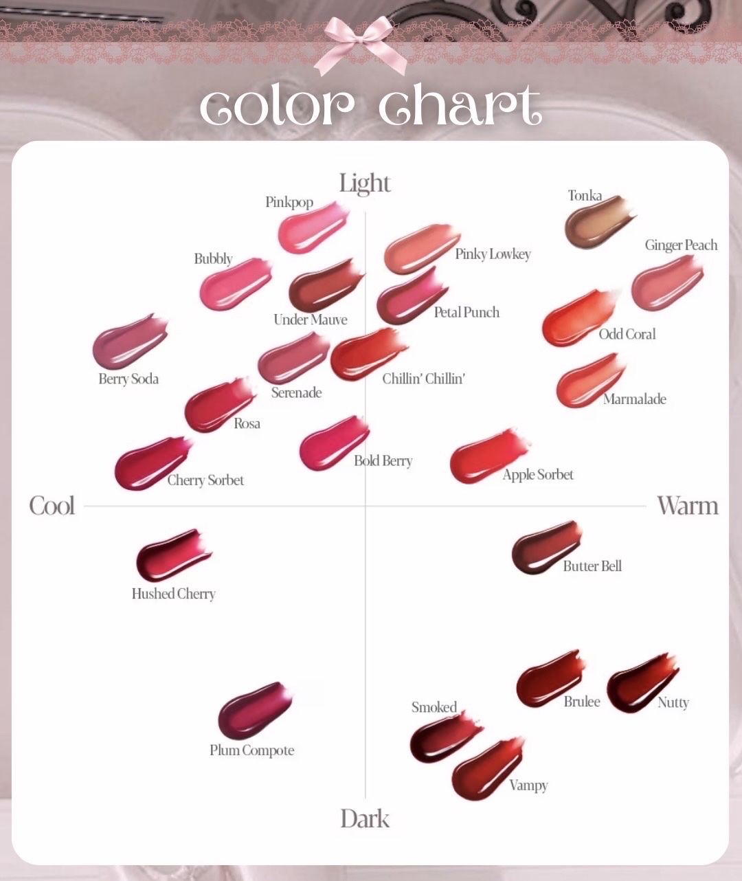 - <アップルシャーベット> 水、リンゴ酸ジイソステアリル、ビスジグリセリルポリアシルアジペート-2、ダイマージリノール酸ダイマージリノレイルビス(ベヘニル/イソステアリル/フィトステリル)、水添ポリイソブテン、ジグリセリン、ジフェニルジメチコン、セチルPEG/PPG-10/1ジメチコン、トリメチルシロキシフェニルジメチコン、ポリソルベート60、ペンチレングリコール、イソステアリン酸ソルビタン、イソステアリン酸ポリグリセリル-4、フェノキシエタノール、(アクリル酸ヒドロキシエチル/アクリロイルジメチルタウリンNa)コポリマー、セテアレス-20、スクワラン、香料、ジラウラミドグルタミドリシンNa、エチルヘキシルグリセリン、エチレンジアミンジコハク酸3Na、黄5、赤227、赤104(1)、黄4 <オッドコーラル> 水、リンゴ酸ジイソステアリル、ダイマージリノール酸ダイマージリノレイルビス(ベヘニル/イソステアリル/フィトステリル)、ビスジグリセリルポリアシルアジペート-2、水添ポリイソブテン、ジフェニルジメチコン、ジグリセリン、セチルPEG/PPG-10/1ジメチコン、トリメチルシロキシフェニルジメチコン、ポリソルベート60、ペンチレングリコール、イソステアリン酸ソルビタン、イソステアリン酸ポリグリセリル-4、フェノキシエタノール、セテアレス-20、(アクリル酸ヒドロキシエチル/アクリロイルジメチルタウリンNa)コポリマー、スクワラン、香料、ジラウラミドグルタミドリシンNa、エチルヘキシルグリセリン、エチレンジアミンジコハク酸3Na、水酸化Al、ポリアクリル酸アンモニウム、BG、酸化チタン、黄5、赤104(1)、黄4、赤227、青1 <チリンチリン> 水、リンゴ酸ジイソステアリル、ダイマージリノール酸ダイマージリノレイルビス(ベヘニル/イソステアリル/フィトステリル)、ビスジグリセリルポリアシルアジペート-2、水添ポリイソブテン、ジグリセリン、ジフェニルジメチコン、セチルPEG/PPG-10/1ジメチコン、トリメチルシロキシフェニルジメチコン、ポリソルベート60、ペンチレングリコール、イソステアリン酸ソルビタン、イソステアリン酸ポリグリセリル-4、フェノキシエタノール、セテアレス-20、(アクリル酸ヒドロキシエチル/アクリロイルジメチルタウリンNa)コポリマー、スクワラン、香料、ジラウラミドグルタミドリシンNa、エチルヘキシルグリセリン、エチレンジアミンジコハク酸3Na、水酸化Al、ポリアクリル酸アンモニウム、BG、酸化チタン、黄5、赤227、黄4、赤104(1)、青1 <ハッシュドチェリー> 水、リンゴ酸ジイソステアリル、ビスジグリセリルポリアシルアジペート-2、ダイマージリノール酸ダイマージリノレイルビス(ベヘニル/イソステアリル/フィトステリル)、水添ポリイソブテン、ジグリセリン、ジフェニルジメチコン、トリメチルシロキシフェニルジメチコン、セチルPEG/PPG-10/1ジメチコン、ポリソルベート60、ペンチレングリコール、イソステアリン酸ソルビタン、イソステアリン酸ポリグリセリル-4、フェノキシエタノール、セテアレス-20、(アクリル酸ヒドロキシエチル/アクリロイルジメチルタウリンNa)コポリマー、スクワラン、香料、ジラウラミドグルタミドリシンNa、エチルヘキシルグリセリン、エチレンジアミンジコハク酸3Na、赤227、黄5、黄4、赤104(1)、青1 <ローザ> 水、リンゴ酸ジイソステアリル、ダイマージリノール酸ダイマージリノレイルビス(ベヘニル/イソステアリル/フィトステリル)、ビスジグリセリルポリアシルアジペート-2、水添ポリイソブテン、ジグリセリン、ジフェニルジメチコン、トリメチルシロキシフェニルジメチコン、セチルPEG/PPG-10/1ジメチコン、ポリソルベート60、ペンチレングリコール、イソステアリン酸ソルビタン、イソステアリン酸ポリグリセリル-4、フェノキシエタノール、セテアレス-20、(アクリル酸ヒドロキシエチル/アクリロイルジメチルタウリンNa)コポリマー、スクワラン、香料、ジラウラミドグルタミドリシンNa、エチルヘキシルグリセリン、エチレンジアミンジコハク酸3Na、酸化チタン、赤227、赤104(1)、黄4、黄5、水酸化Al、ポリアクリル酸アンモニウム、BG、青1 <ピンキーローキー> 水、リンゴ酸ジイソステアリル、ダイマージリノール酸ダイマージリノレイルビス(ベヘニル/イソステアリル/フィトステリル)、ビスジグリセリルポリアシルアジペート-2、水添ポリイソブテン、ジグリセリン、ジフェニルジメチコン、トリメチルシロキシフェニルジメチコン、セチルPEG/PPG-10/1ジメチコン、ポリソルベート60、ペンチレングリコール、イソステアリン酸ソルビタン、イソステアリン酸ポリグリセリル-4、フェノキシエタノール、セテアレス-20、(アクリル酸ヒドロキシエチル/アクリロイルジメチルタウリンNa)コポリマー、スクワラン、香料、ジラウラミドグルタミドリシンNa、エチルヘキシルグリセリン、エチレンジアミンジコハク酸3Na、酸化チタン、黄5、赤227、黄4、赤104(1)、青1、水酸化Al、ポリアクリル <アンダーモーブ> 水、リンゴ酸ジイソステア