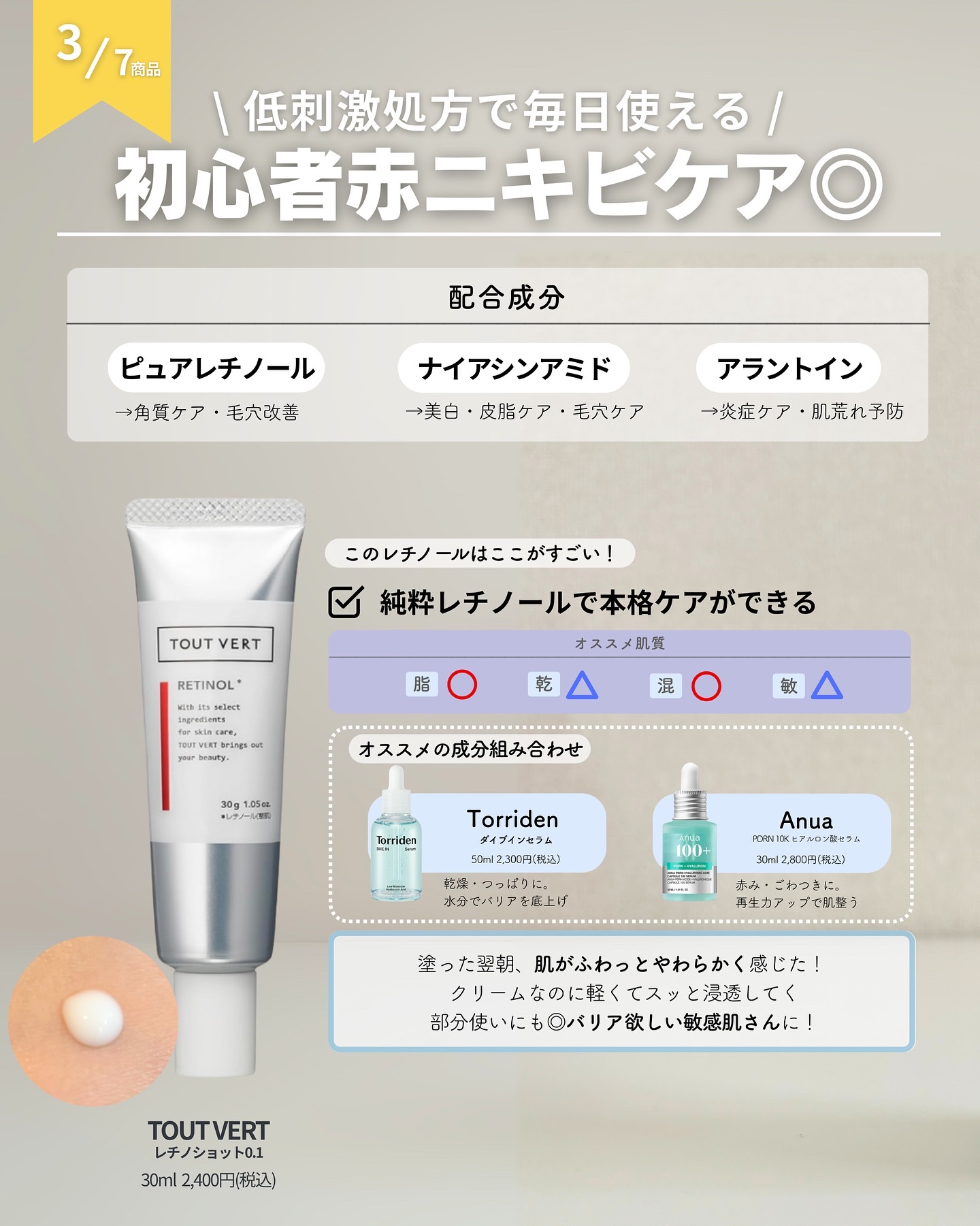 レチノールは美肌効果がめちゃめちゃ高い😳! ただレチノールは副反応が出てしまう方が多いので、使用の際は様子を見てください😭💧 🤍ニキビ、毛穴にお悩みの方向けに情報を発信中◎