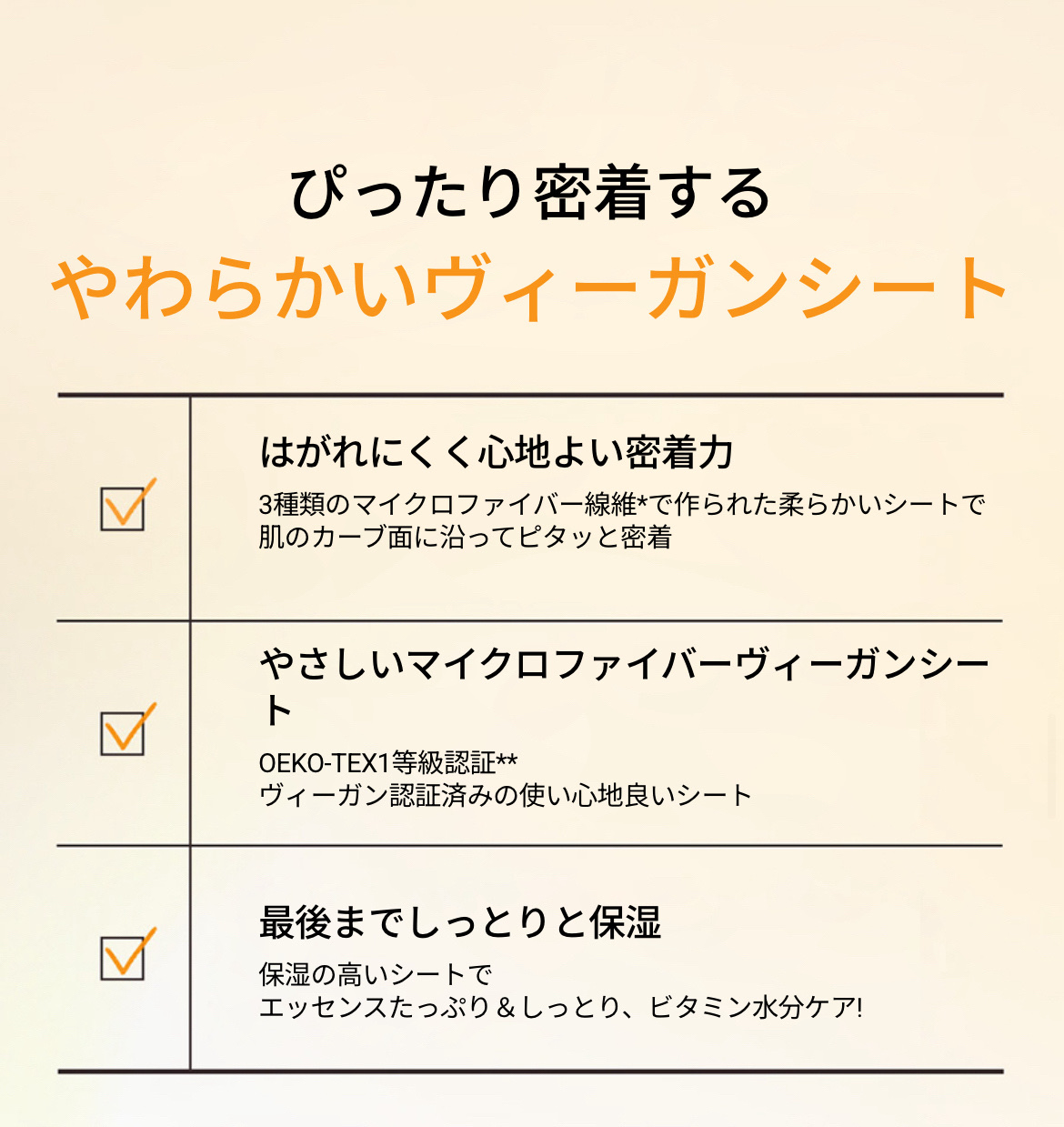 - POINT① べたつきのない使用感と肌あたりの良い高密着シート 3 種類のマイクロファイバー繊維で作られたヴィーガン認定シートが肌にやさしい使い心地で密着。エッセンスをたっぷり含んだシートで美容成分を角層まで届けます。 剝がした後もべたつかず、エッセンスが肌にスッと馴染み、水光うるツヤ肌へ導きます。 POINT② 水分たっぷりのマスクでしっとり保湿 5D リポソームビタミン*1はもちろん、 ヒアルロン酸*1を加えることでしっとりと保湿し、水分感溢れるお肌へ整えます。 POINT③ 注目の保湿成分のグルタチオン、ナイアシンアミド配合 乾燥による毛穴目立ちが気になる肌を整肌ケアする話題の成分グルタチオンや、肌荒れ予防ケアだけではなく、乾燥によるくすみの保湿ケアとしても注目のナイアシンアミドを配合。 5Dリポソームビタミン*1と合わせて肌の乾燥悩みが気にならないキメの整った透明感*2溢れる肌へと導きます。 *1 保湿成分 *2 保湿による