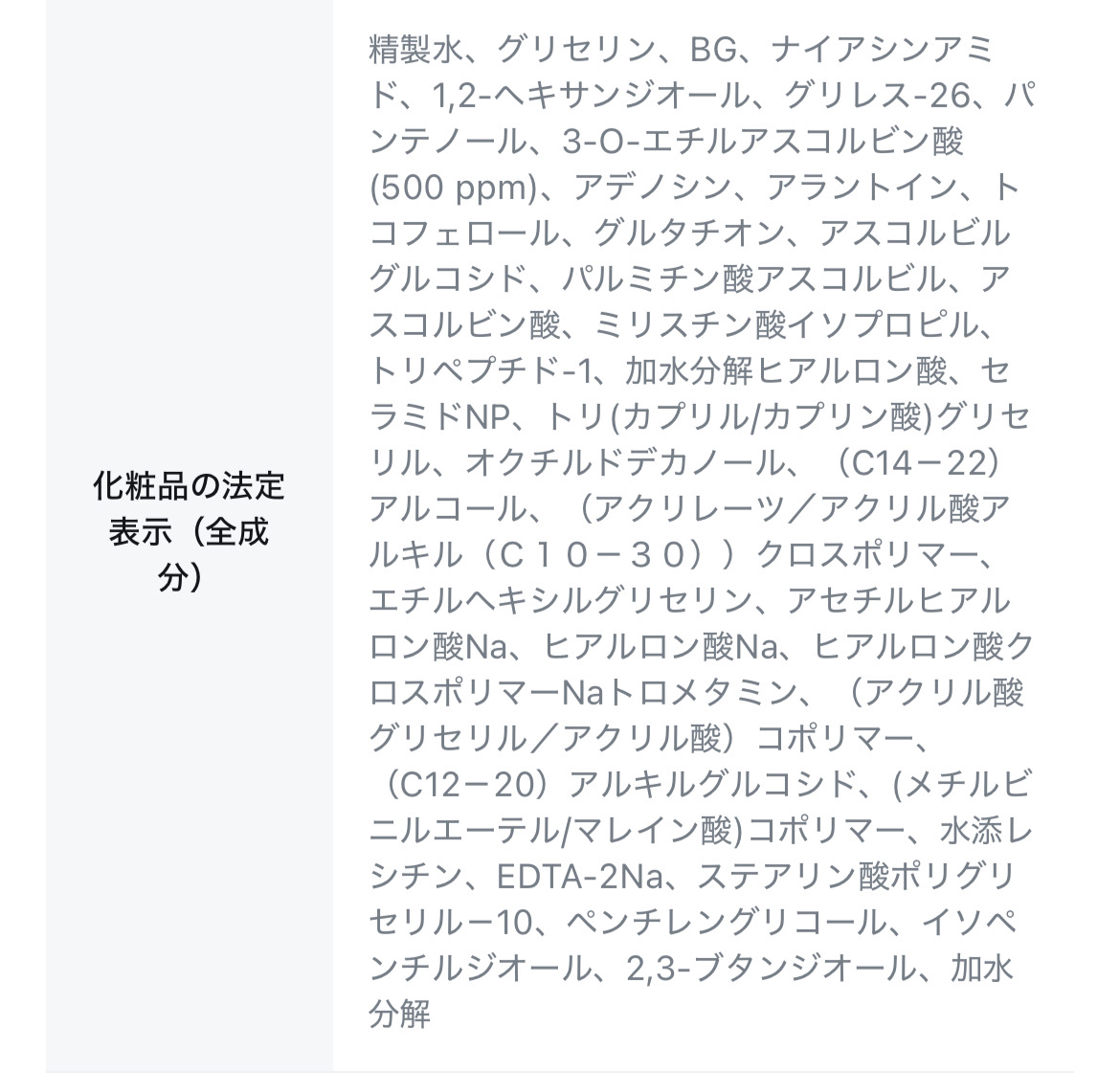 - <1枚> 水、グリセリン、BG、ナイアシンアミド、1,2-ヘキサンジオール、グリセレスー26、パンテノール、トリ(カプリル酸/カプリン酸)グリセリル、オクチルドデカノール、(C14-22)アルコール、(アクリーツ/アクリル酸アルキル(C10-30))クロスポリマー、エチルヘキシルグリセリン、3-0-エチルアスコルビン酸、トロメタミン、(アクリル酸グリセリル/アクリル酸)コポリマー、(C12-20)アルキルグルコシド、アデノシン、(メチルビニルエーテル/マレイン酸)コポリマー、水添レシチン、アラントイン、EDTA-2Na、キサンタンガム、ミリスチン酸ポリグリセリルー10、グルタチオン、加水分解ヒアルロン酸、セラミドNP、ペンチレングリコール、トコフェロール、アセチルヒアルロン酸Na、ヒアルロン酸Na、トリペプチドー1、グルコース、ヒアルロン酸クロスポリマーNa、イソペンチルジオール、2,3ーブタンジオール、加水分解ヒアルロン酸Na、アルギニン、カルボマー、プロリン、オレイン酸ポリグリセリルー4、ステアロイルグルタミン酸Na、アスコルビルグルコシド、パルミチン酸アスコルビル、アスコルビン酸、テトラへキシルデカン酸アスコルビル <3枚> 水、グリセリン、BG、ナイアシンアミド、1,2-ヘキサンジオール、グリセレス-26、パンテノール、トリ(カプリル酸/カプリン酸)グリセリル、オクチルドデカノール、(C14-22)アルコール、(アクリレーツ/アクリル酸アルキル(C10-30))クロスポリマー、エチルヘキシルグリセリン、3-O-エチルアスコルビン酸、トロメタミン、(アクリル酸グリセリル/アクリル酸)コポリマー、(C12-20)アルキルグルコシド、アデノシン、(メチルビニルエーテル/マレイン酸)コポリマー、水添レシチン、アラントイン、EDTA-2Na、キサンタンガム、ミリスチン酸ポリグリセリル-10、グルタチオン、加水分解ヒアルロン酸、セラミドNP、ペンチレングリコール、トコフェロール、アセチルヒアルロン酸Na、ヒアルロン酸Na、トリペプチド-1、グルコース、ヒアルロン酸クロスポリマーNa、イソペンチルジオール、2,3-ブタンジオール、加水分解ヒアルロン酸Na、アルギニン、カルボマー、プロリン、オレイン酸ポリグリセリル-4、ステアロイルグルタミン酸Na、アスコルビルグルコシド、パルミチン酸アスコルビル、アスコルビン酸、テトラヘキシルデカン酸アスコルビル <10枚> 水、グリセリン、BG、ナイアシンアミド、1,2-ヘキサンジオール、グリセレス-26、パンテノール、トリ(カプリル酸/カプリン酸)グリセリル、オクチルドデカノール、(C14-22)アルコール、(アクリレーツ/アクリル酸アルキル(C10-30))クロスポリマー、エチルヘキシルグリセリン、3-O-エチルアスコルビン酸、トロメタミン、(アクリル酸グリセリル/アクリル酸)コポリマー、(C12-20)アルキルグルコシド、アデノシン、(メチルビニルエーテル/マレイン酸)コポリマー、水添レシチン、アラントイン、EDTA-2Na、キサンタンガム、ミリスチン酸ポリグリセリル-10、グルタチオン、加水分解ヒアルロン酸、セラミドNP、ペンチレングリコール、トコフェロール、アセチルヒアルロン酸Na、ヒアルロン酸Na、トリペプチド-1、グルコース、ヒアルロン酸クロスポリマーNa、イソペンチルジオール、2,3-ブタンジオール、加水分解ヒアルロン酸Na、アルギニン、カルボマー、プロリン、オレイン酸ポリグリセリル-4、ステアロイルグルタミン酸Na、アスコルビルグルコシド、パルミチン酸アスコルビル、アスコルビン酸、テトラヘキシルデカン酸アスコルビル