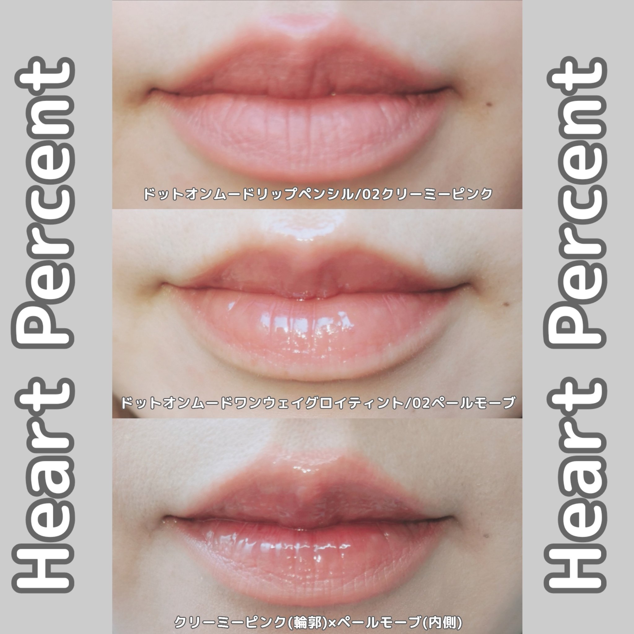 HeartPercentハートパーセントドットオンムードリップペンシル02クリーミーピンク/14カームピンク/19ダスティピンクふんわりマットな発色のリップペンシル✨️唇のラインよりオーバーリップにしてもぷっくりとした唇にみえて可愛いかも😆ド...