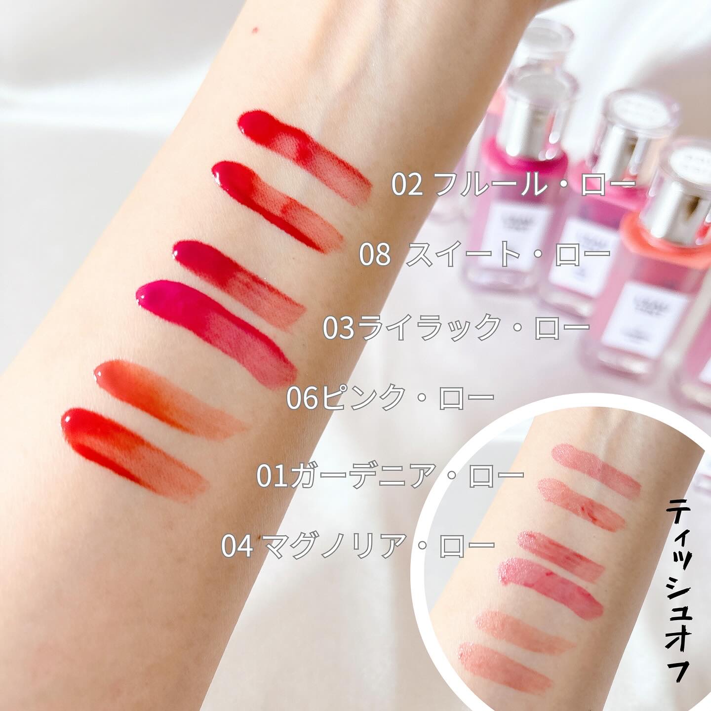 - <01 ガーデニア・ロー> 水、ジフェニルジメチコン、ビスジグリセリルポリアシルアジペート-2、リンゴ酸ジイソステアリル、グリセリン、DPG、セチルPEG/PPG-10/1ジメチコン、1,2-ヘキサンジオール、ポリソルベート60、イソステアリン酸ソルビタン、(アクリル酸ヒドロキシエチル/アクリロイルジメチルタウリンNa)コポリマー、セテアレス-20、スクワラン、酸化チタン、黄5、香料、エチルヘキシルグリセリン、赤227、青1、BG、ヤマザクラ花エキス、モクレン花エキス、ハス花エキス、ダマスクバラ花エキス、クエン酸Na、テトラ(ジ-t-ブチルヒドロキシヒドロケイヒ酸)ペンタエリスリチル、クエン酸、フェノキシエタノール <02 フルール・ロー> 水、ジフェニルジメチコン、ビスジグリセリルポリアシルアジペート-2、リンゴ酸ジイソステアリル、グリセリン、DPG、セチルPEG/PPG-10/1ジメチコン、1,2-ヘキサンジオール、ポリソルベート60、イソステアリン酸ソルビタン、(アクリル酸ヒドロキシエチル/アクリロイルジメチルタウリンNa)コポリマー、セテアレス-20、スクワラン、酸化チタン、香料、エチルヘキシルグリセリン、赤227、黄4、黄5、赤104(1)、青1、BG、ヤマザクラ花エキス、モクレン花エキス、ハス花エキス、ダマスクバラ花エキス、クエン酸Na、テトラ(ジ-t-ブチルヒドロキシヒドロケイヒ酸)ペンタエリスリチル、クエン酸、フェノキシエタノール <03 ライラック・ロー> 水、ジフェニルジメチコン、ビスジグリセリルポリアシルアジペート-2、リンゴ酸ジイソステアリル、グリセリン、DPG、セチルPEG/PPG-10/1ジメチコン、1,2-ヘキサンジオール、ポリソルベート60、イソステアリン酸ソルビタン、(アクリル酸ヒドロキシエチル/アクリロイルジメチルタウリンNa)コポリマー、セテアレス-20、スクワラン、酸化チタン、香料、エチルヘキシルグリセリン、赤227、黄5、青1、BG、ヤマザクラ花エキス、モクレン花エキス、ハス花エキス、ダマスクバラ花エキス、クエン酸Na、テトラ(ジ-t-ブチルヒドロキシヒドロケイヒ酸)ペンタエリスリチル、クエン酸、フェノキシエタノール <04 マグノリア・ロー> 水、ジフェニルジメチコン、ビスジグリセリルポリアシルアジペート-2、リンゴ酸ジイソステアリル、グリセリン、DPG、セチルPEG/PPG-10/1ジメチコン、1,2-ヘキサンジオール、ポリソルベート60、イソステアリン酸ソルビタン、(アクリル酸ヒドロキシエチル/アクリロイルジメチルタウリンNa)コポリマー、セテアレス-20、スクワラン、酸化チタン、香料、エチルヘキシルグリセリン、赤227、黄4、黄5、青1、BG、ヤマザクラ花エキス、モクレン花エキス、ハス花エキス、ダマスクバラ花エキス、クエン酸Na、テトラ(ジ-t-ブチルヒドロキシヒドロケイヒ酸)ペンタエリスリチル、クエン酸、フェノキシエタノール <05 ピオニー・ロー> 水、ジフェニルジメチコン、ビスジグリセリルポリアシルアジペート-2、リンゴ酸ジイソステアリル、グリセリン、DPG、セチルPEG/PPG-10/1ジメチコン、1,2-ヘキサンジオール、ポリソルベート60、イソステアリン酸ソルビタン、(アクリル酸ヒドロキシエチル/アクリロイルジメチルタウリンNa)コポリマー、セテアレス-20、スクワラン、香料、エチルヘキシルグリセリン、黄5、赤227、赤104(1)、BG、ヤマザクラ花エキス、モクレン花エキス、ハス花エキス、ダマスクバラ花エキス、クエン酸Na、テトラ(ジ-t-ブチルヒドロキシヒドロケイヒ酸)ペンタエリスリチル、クエン酸、フェノキシエタノール <06 ピンク・ロー> 水、ジフェニルジメチコン、ビスジグリセリルポリアシルアジペート-2、リンゴ酸ジイソステアリル、グリセリン、DPG、セチルPEG/PPG-10/1ジメチコン、1,2-ヘキサンジオール、ポリソルベート60、イソステアリン酸ソルビタン、(アクリル酸ヒドロキシエチル/アクリロイルジメチルタウリンNa)コポリマー、セテアレス-20、スクワラン、酸化チタン、香料、エチルヘキシルグリセリン、黄5、赤104(1)、赤227、青1、BG、ヤマザクラ花エキス、モクレン花エキス、ハス花エキス、ダマスクバラ花エキス、クエン酸Na、テトラ(ジ-t-ブチルヒドロキシヒドロケイヒ酸)ペンタエリスリチル、クエン酸、フェノキシエタノール <07 ピーチ・ロー> 水、ジフェニルジメチコン、ビスジグリセリルポリアシルアジペート-2、リンゴ酸ジイソステアリル、グリセリン、DPG、セチルPEG/PPG-10/1ジメチコン、1,2-ヘキサンジオール、ポリソルベート60、イソステアリン酸ソルビタン、(アクリル酸ヒドロキシエチル/アクリロイルジメチルタウリンNa)コポリマー、セテアレス-20、スクワラン、酸化チタン、香料、エチルヘキシルグリセリン、黄4、赤227、黄5、赤104(1)、BG、ヤマザクラ花エキス、モクレン花エキス、ハス花エキス、ダマスクバラ花エキス、クエン酸Na、テトラ(ジ-t-ブチルヒドロキシヒドロケイヒ酸)ペンタエリスリチル、クエン酸、フェノキシエタノール <08 スイート・ロー> 水、ジフェニルジメチコン、ビスジグリセリルポリアシルアジペート-2、リンゴ酸ジイソステア