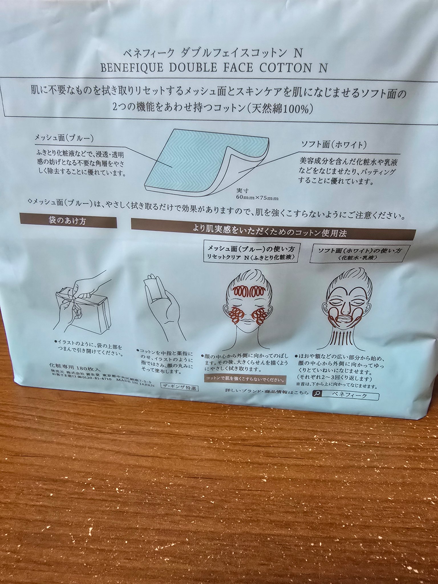 クレド以外のコットンで唯一使ってるのがこれBENEFIQUEダブルフェイスコットンN180枚¥990片面がメッシュ構造になってるコットンです。正直私はブルーのメッシュ面しか使ってないです。不要な角質を取り除きたい時に拭き取り化粧水を染み込ませ...