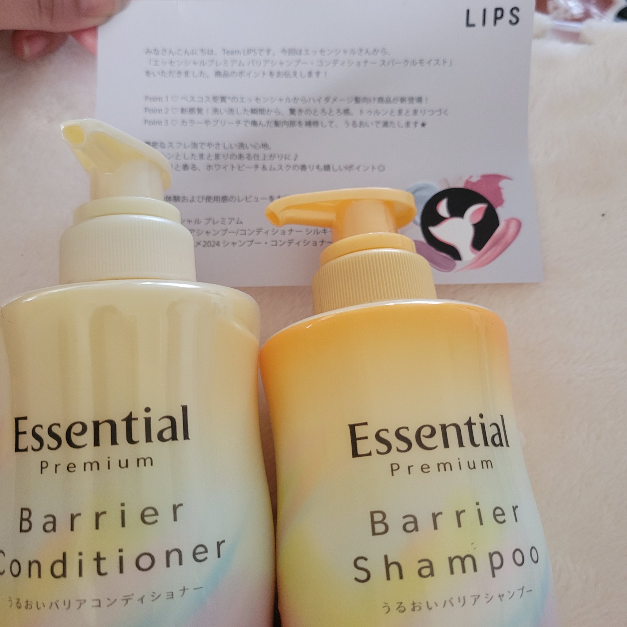 エッセンシャルからハイダメージ向けの商品が新登場!✨️エッセンシャルプレミアムバリアシャンプー/コンディショナースパークルモイスト新感覚のトゥルンとまとまりつづくとろとろ感🤍カラーやブリーチで傷んだ髪をうるおいで満たしてくれるそう👶🏻ホワイト...