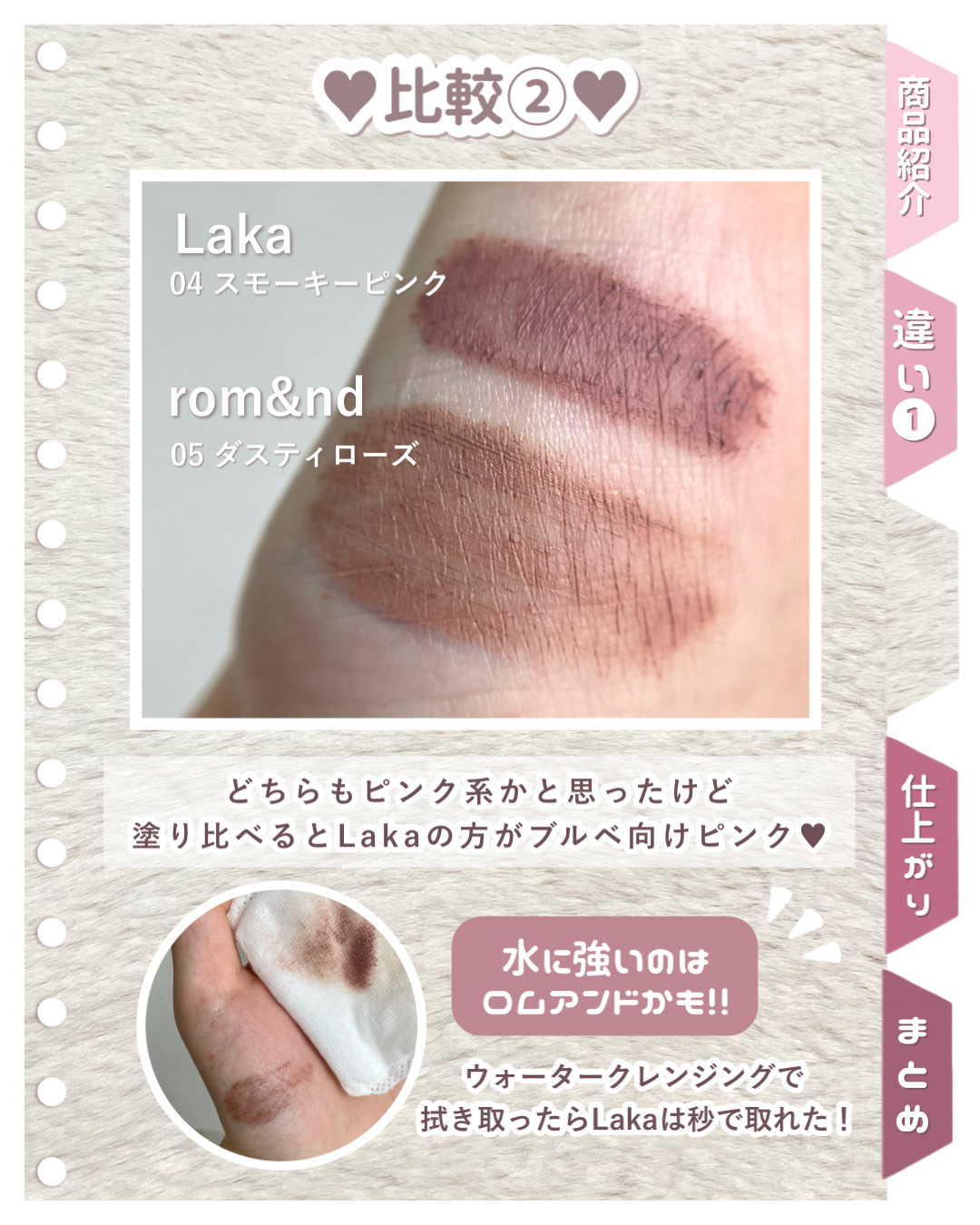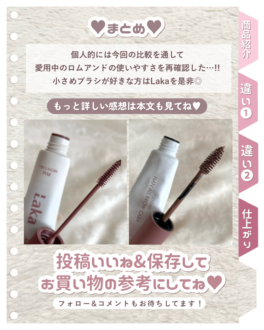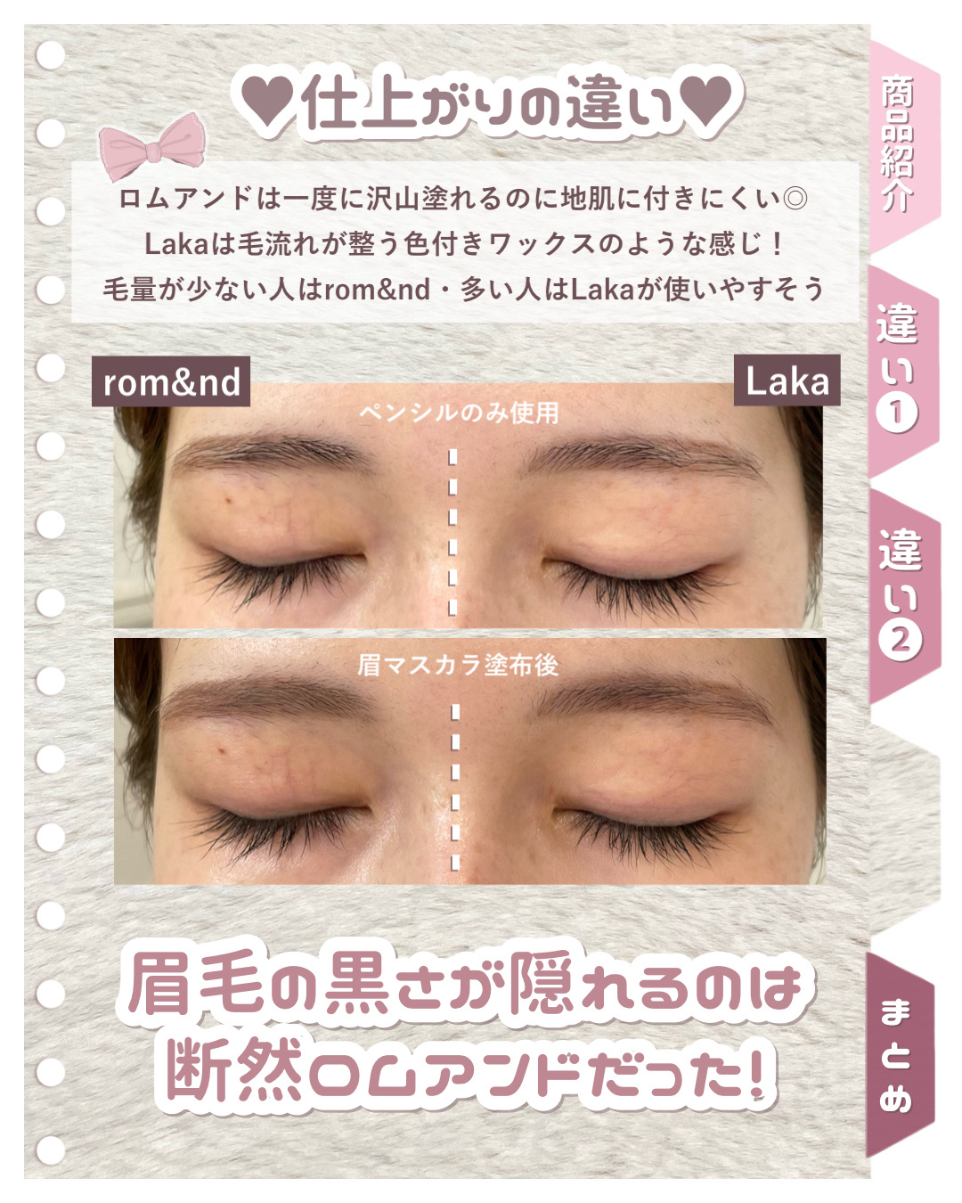 【ピンクアイブロウマスカラ】・rom&ndハンオールブロウカラ9g05ダスキーローズ・Lakaラカピクシーブロウカラ8g04スモーキーピンクLakaのアイブロウを買いましたが思ってた感じと違ったブラシは小さくていいんだけど液が結構付きにくいな...