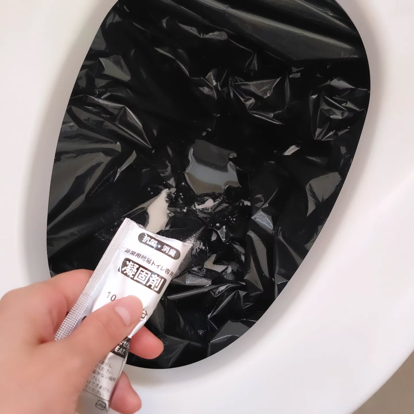 専用のトイレ用袋を便座にかぶせて用を足し、終えたら凝固剤を入れるだけ 固まったらトイレ用袋の開口部をしっかり結んで、そのまま可燃ゴミとして捨てられるのでとても衛生的です。 もしもという時に備えよう 国産の凝固剤なので、水なしですぐに固まります。 キャンプや登山などのアウトドアで近くに水場がない状況に携帯トイレとしても大活躍します 銀イオンと柿渋エキスを配合した独自開発のトイレ用袋は、スピーディに固まる高品質な凝固剤とセットで使うことで抜群の消臭力を実現!