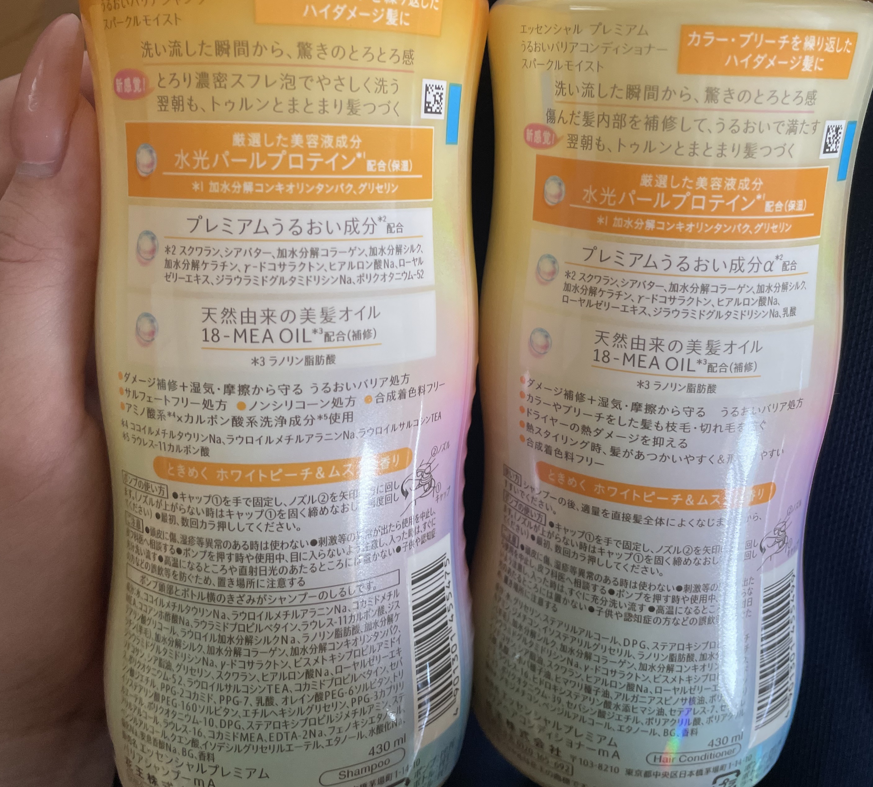 エッセンシャルプレミアムバリアシャンプー・コンディショナースパークルモイスト♡ハイダメージ髪向けのアイテム✨洗い流した瞬間から、驚きのとろとろ感。カラーやブリーチで傷んだ髪内部を補修して、うるおいで満たしてくれるそう。シャンプーは泡立ち良く、...