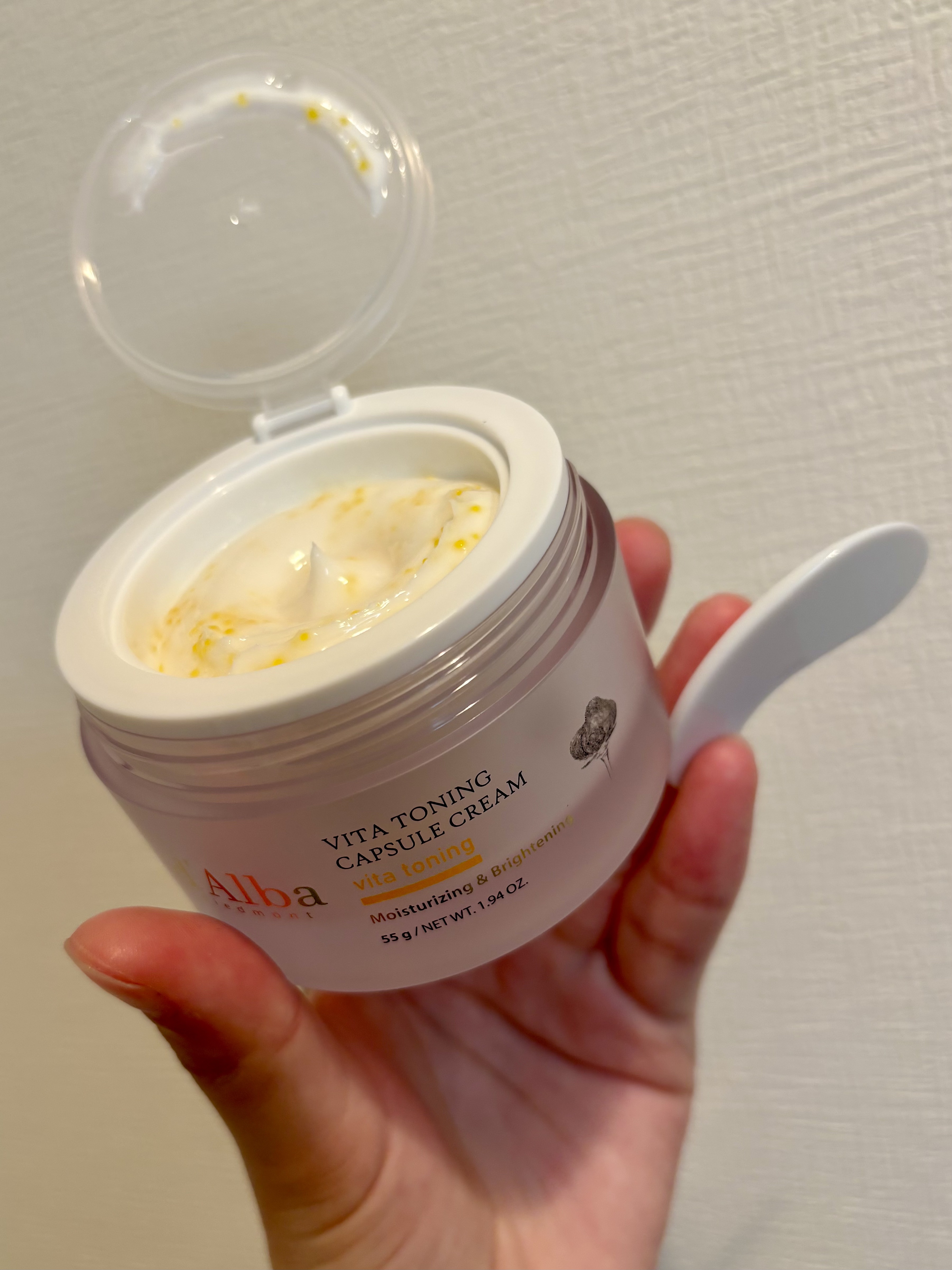 ダルバビタトーニングカプセルクリーム🌟もっちり高保湿クリームこっくり系かなと思ったけど意外とスッと伸びます♪黄色い粒も硬めかなと思ったら肌に馴染ませるときにスッと溶けました💡ベタベタしなくて好き(*´ェ`*)♥ますますダルバが好きになった💕気...