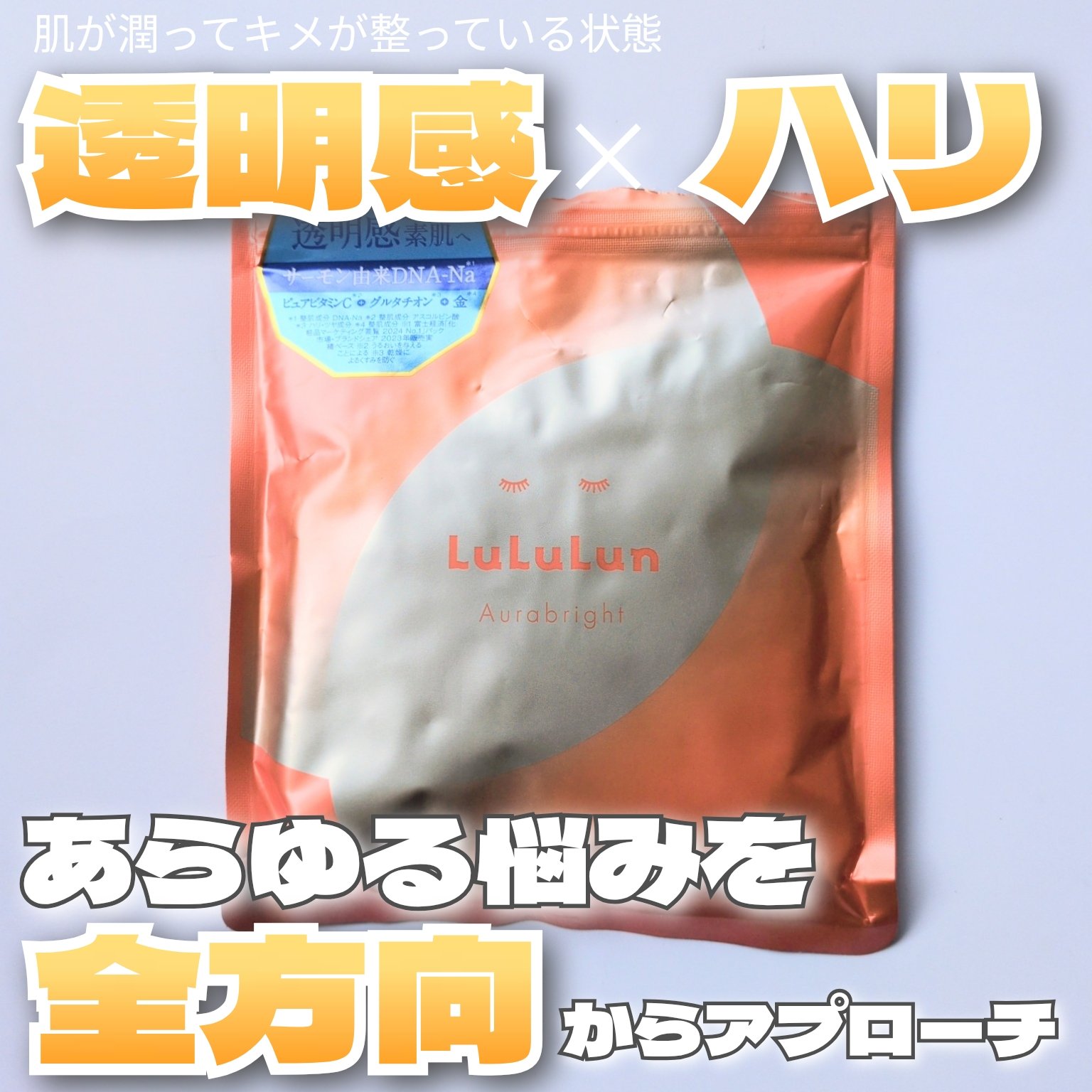 - <ルルルン オーラブライトマスク W 28枚入> 水、BG、ペンチレングリコール、グリセリン、(カプリル酸/カプリン酸/コハク酸)トリグリセリル、DNA-Na、アスコルビン酸、金、グルタチオン、セラミドNP、セラミドAP、セラミドEOP、シロキクラゲ多糖体、ダイズ芽エキス、ハス葉エキス、クエン酸、クエン酸Na、PEG-60水添ヒマシ油、トコフェロール、セリン、アラニン、グリシン、フィトスフィンゴシン、コレステロール、グルタミン酸、リシンHCl、トレオニン、アルギニン、プロリン、トリエチルヘキサノイン、アラントイン、ミリスチン酸ポリグリセリル-10、カルボマー、エチルヘキシルグリセリン、水酸化Na、シクロヘキサン-1,4-ジカルボン酸ビスエトキシジグリコール、ベタイン、ソルビトール、ラウロイルラクチレートNa、PCA-Na、プロパンジオール、乳酸Na、PCA、1,2-ヘキサンジオール、カプリリルグリコール、キサンタンガム、フェノキシエタノール <ルルルン オーラブライトマスク W 7枚入> 水、BG、ペンチレングリコール、グリセリン、(カプリル酸/カプリン酸/コハク酸)トリグリセリル、DNA-Na、アスコルビン酸、金、グルタチオン、セラミドNP、セラミドAP、セラミドEOP、シロキクラゲ多糖体、ダイズ芽エキス、ハス葉エキス、クエン酸、クエン酸Na、PEG-60水添ヒマシ油、トコフェロール、セリン、アラニン、グリシン、フィトスフィンゴシン、コレステロール、グルタミン酸、リシンHCl、トレオニン、アルギニン、プロリン、トリエチルヘキサノイン、アラントイン、ミリスチン酸ポリグリセリル-10、カルボマー、エチルヘキシルグリセリン、水酸化Na、シクロヘキサン-1,4-ジカルボン酸ビスエトキシジグリコール、ベタイン、ソルビトール、ラウロイルラクチレートNa、PCA-Na、プロパンジオール、乳酸Na、PCA、1,2-ヘキサンジオール、カプリリルグリコール、キサンタンガム、フェノキシエタノール