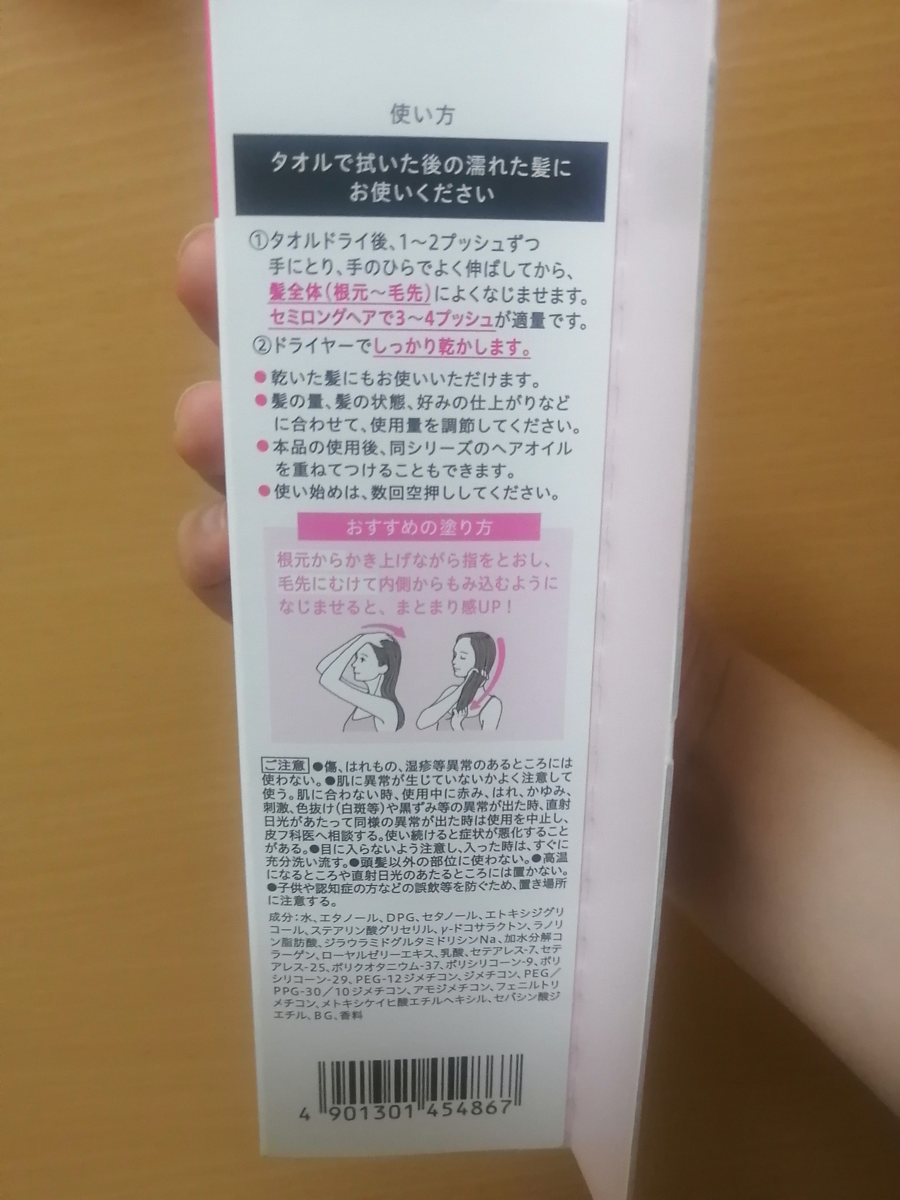 - <140ml > 水、エタノール、DPG、セタノール、エトキシジグリコール、ステアリン酸グリセリル、γ-ドコサラクトン、ラノリン脂肪酸、ジラウラミドグルタミドリシンNa、加水分解コラーゲン、ローヤルゼリーエキス、乳酸、セテアレス-7、セテアレス-25、ポリクオタニウム-37、ポリシリコーン-9、ポリシリコーン-29、PEG-12ジメチコン、ジメチコン、PEG/PPG-30/10ジメチコン、アモジメチコン、フェニルトリメチコン、メトキシケイヒ酸エチルヘキシル、セバシン酸ジエチル、BG、香料