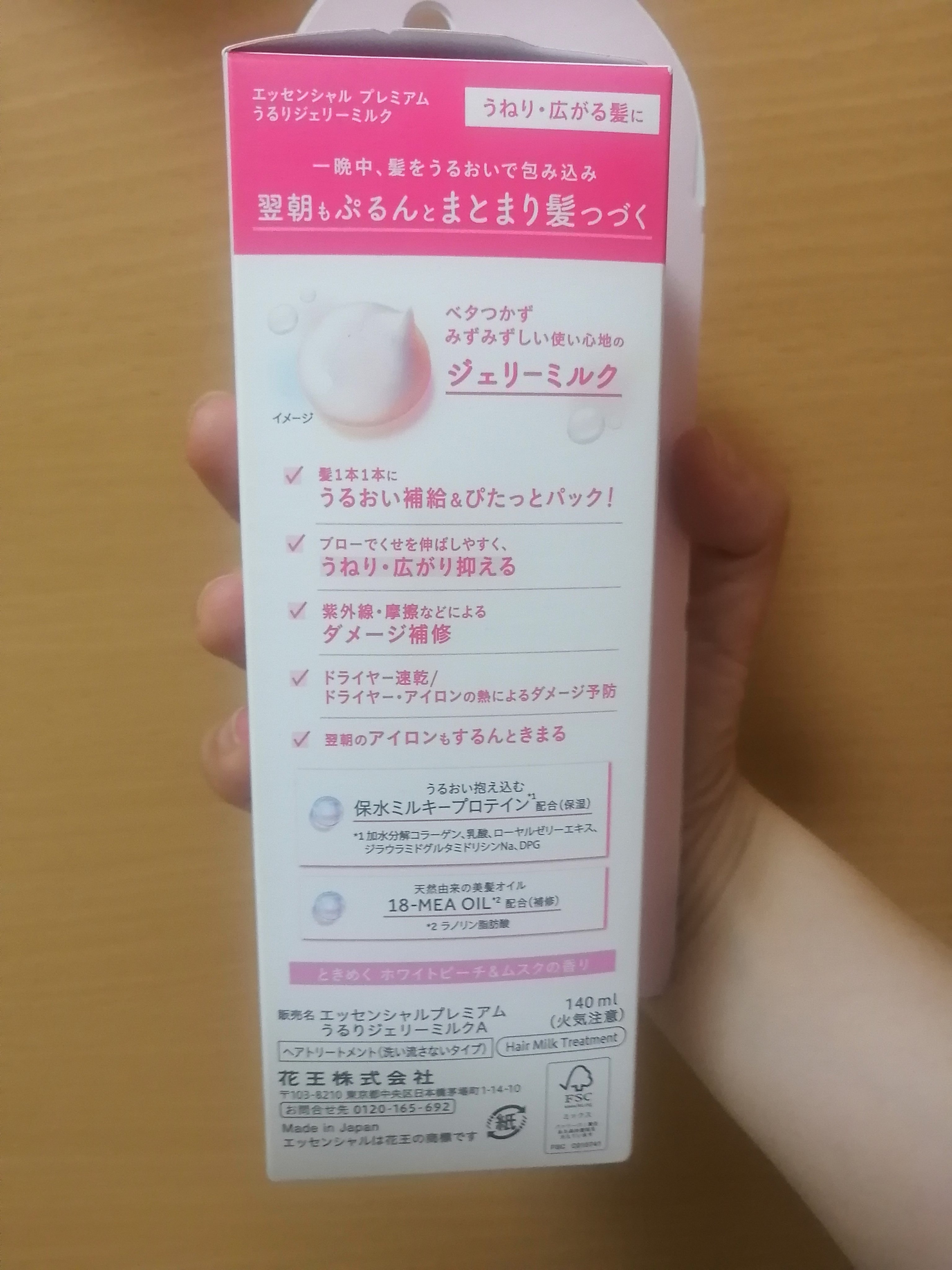 - うねり・広がる髪に。うるおい補給&パック。 翌朝もぷるんとまとまり髪つづくジェリーミルク。 〇乾燥によるうねり・広がりをケア 〇紫外線・摩擦などによるダメージ補修 〇ドライヤー速乾/ドライヤー・アイロンの熱によるダメージ予防 〇翌朝のアイロンもするんときまる 〇保水ミルキープロテイン配合(保湿)<加水分解コラーゲン・乳酸・ローヤルゼリーエキス・ジラウラミドグルタミドリシンNa> ○ときめくホワイトピーチ&ムスクの香り