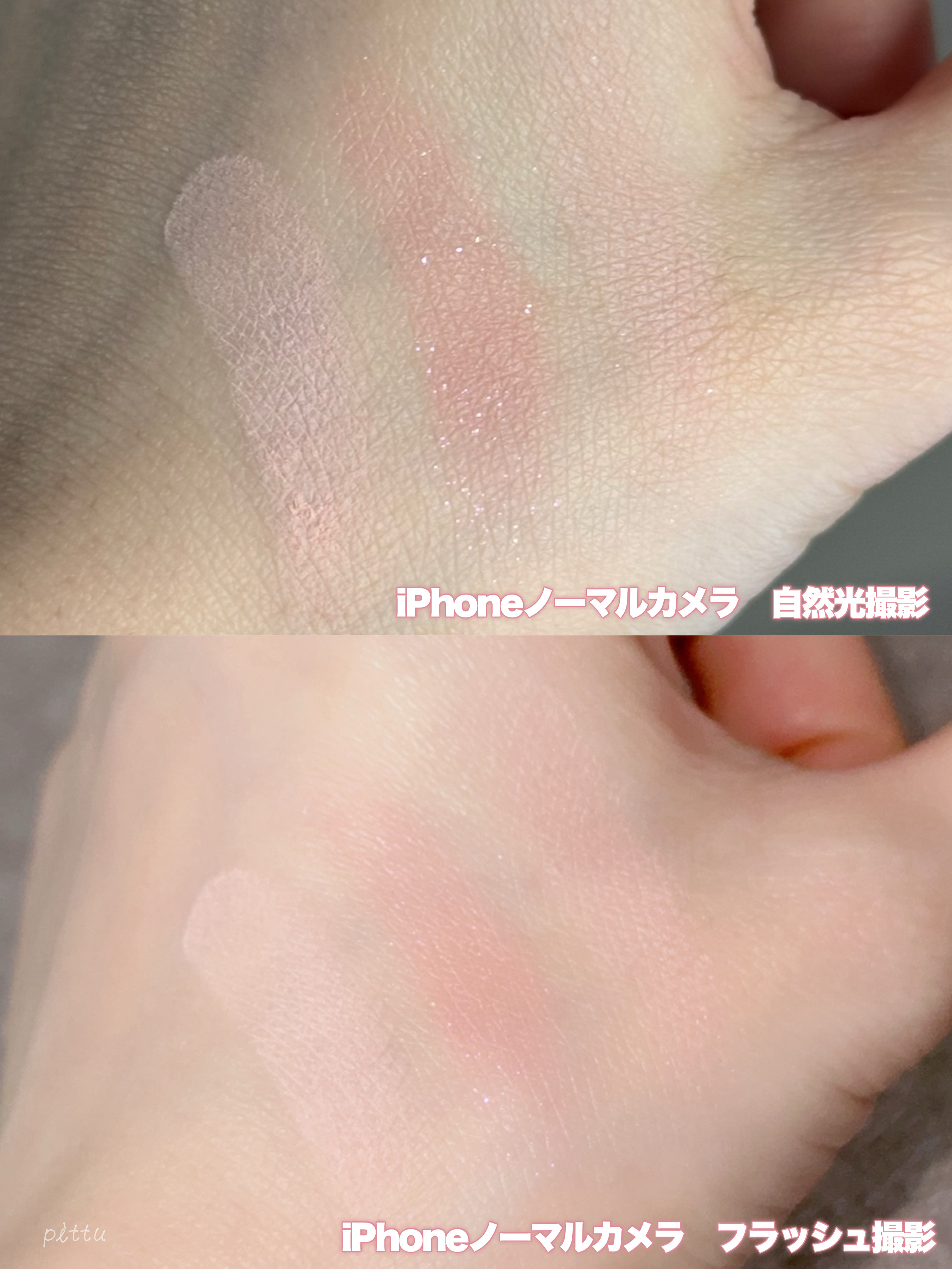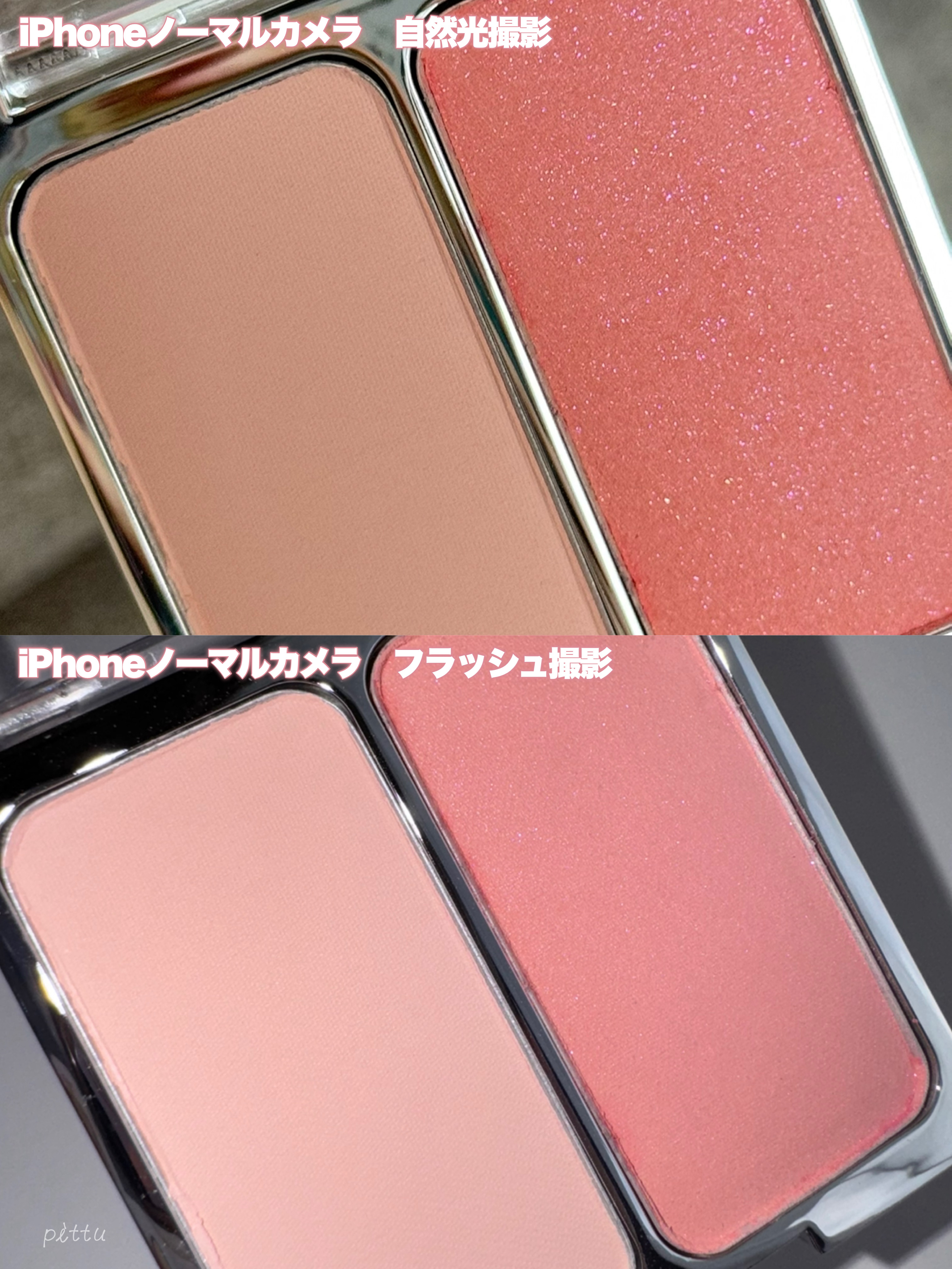 カラバリは2色展開、公式情報がないので不安ですがどうやら限定販売のようです! 01 プリュムフラワー ピンクベージュ系でまとめられたパレット 全体的にライトなピンクが多く、イエベ春の方向きに感じます 02 ボヌールマロン 赤みのあるカラーでまとめられたパレット 明るいカラーもありますがベージュや赤みブラウン等イエベ秋の方向きに感じます 表面のエンボス加工もかわいいのばっかりですね! ラメ強めが格子柄だからわかりやすいし、まとまりが良い⸜(๑⃙⃘'ᵕ'๑⃙⃘)⸝⋆* ちなみにこちらのパレットは8色も入っているのにかなりコンパクトで、1色の大きさが私の親指の爪よりちょい大きめという嬉しさ…! フタの水面のデザインは内側だけに施されているので、表面はツルッとしていますよ🌊 チップもふわふわで、多色パレット専用のサイズ感で長めなのが嬉しい♪ とにかく話題になっているこちら、可愛すぎるから在庫無くなるのお願い待って…🙏🏻💦