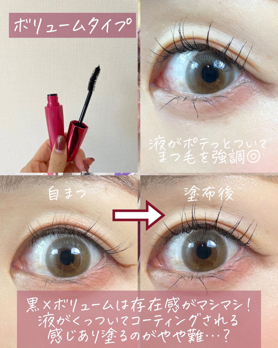 ロング、ボリューム、自まつげ際立てのブラックを使用しました🙂↕️ ロングとボリュームはブラシが大きめ。自まつげ際立ては塗りやすかったです! 個人的にはやっぱり使いやすさで自まつげ際立てタイプが好きです。仕上がりも🌼 ボリュームも仕上がりは好き! 3種類とも液の乾きがはやくて、落としやすさもよかったです◎ あとパケが目立つからポーチの中で探しやすいのも良い🥰