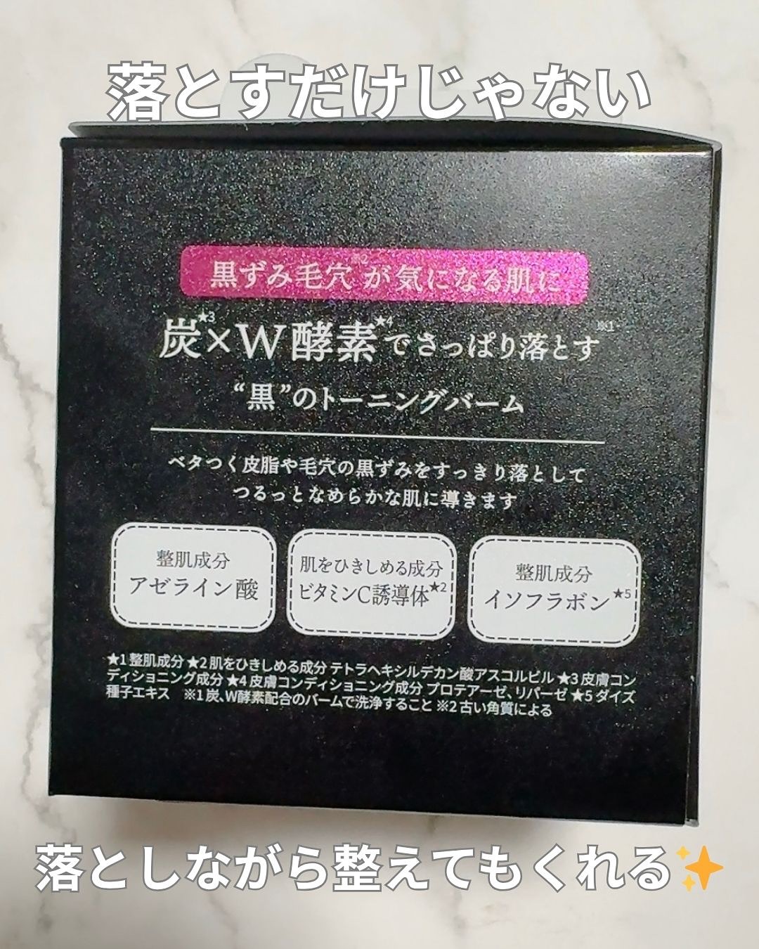 \小鼻や頬に黒ずみ毛穴にアプローチ/ ⽑⽳⽬⽴ちの原因となる⾓栓を炭とW酵素で【落とす】 ⾓栓の元となる余分な⽪脂をケアするアゼライン酸を配合で【整える】 バームが肌にのせるととけてメイク、毛穴汚れも落としてくれるのに、クレンジング後の突っ張り感もなくて使用感は良かったです。