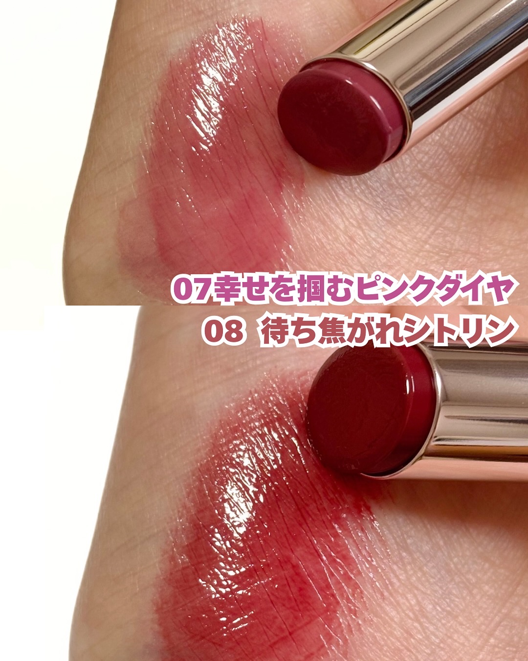 - ■チョコレートのようにとろけて宝石のようなツヤへ 植物由来のメルティングオイル※1が唇の温度でとろけだし、ツヤと血色感をスルスル広げます。 通常の3倍の水を抱え込むことができるほどの保水効果と密着性に優れたオイルが、元の唇の色を活かしながら目が奪われるような口元を演出します。 ■ツヤと発色が長時間続く! ティント処方でツヤも発色もキープし、つけたての美しさが持続します。 ■美容保湿成分配合でツヤぷる唇ケア シア脂※2、ホホバ種子油※2、グリチルレチン酸ステアリル※2、ビタミンE※3配合で、うるおいベールの膜を形成し、唇あれや乾燥を防ぎます。 ※1 ダイマージリノール酸(フィトステリル/イソステアリル/セチル/ステアリル/ベヘニル)(油性基剤) ※2 保湿成分 ※3 トコフェロール(整肌成分) 2024年8月31日(土)ロフト先行発売
