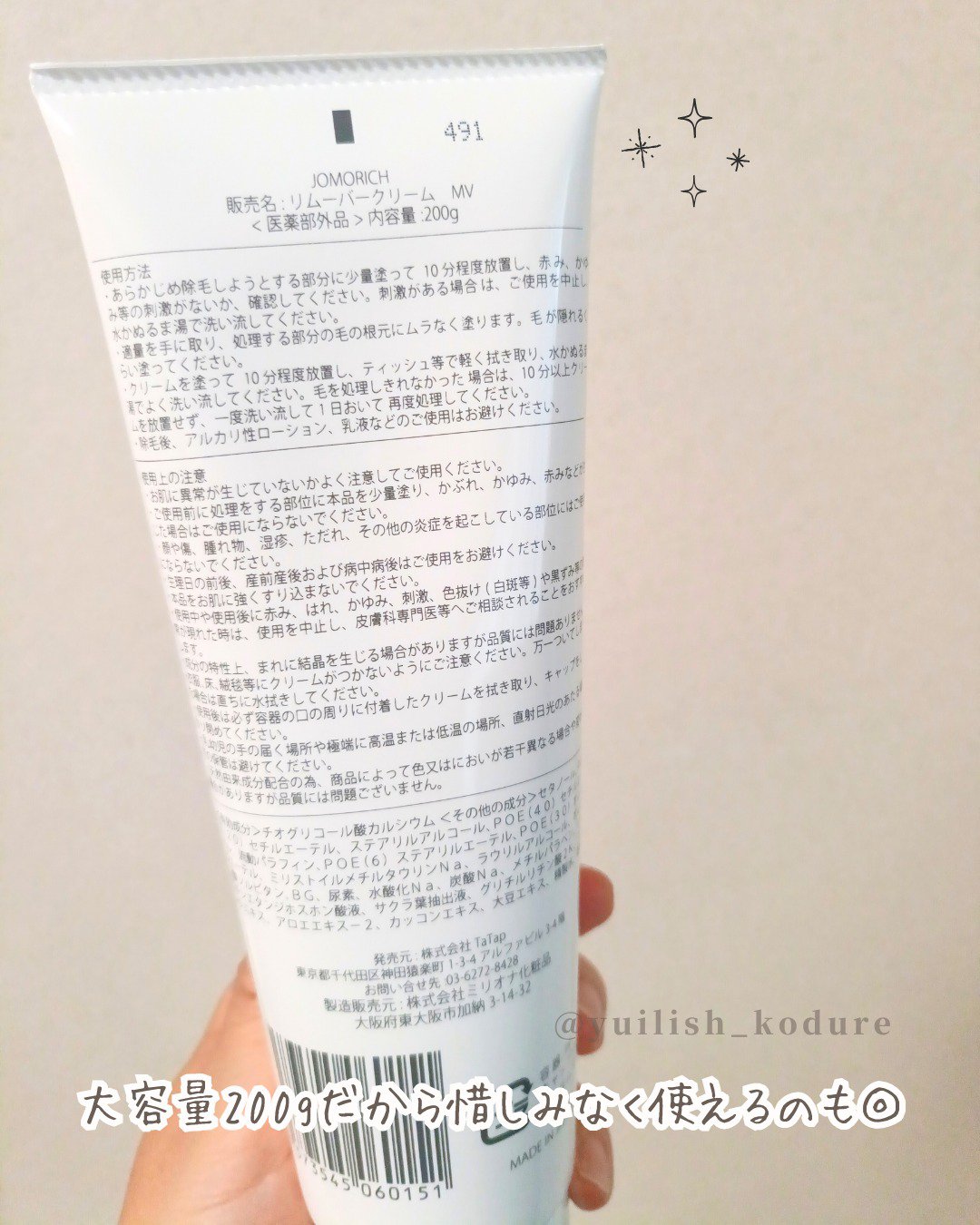 鎌倉ライフさまより商品提供によりいただきました🤍今回紹介するのは鎌倉ライフのジョモリッチ✨️肌見せの増える時期到来😭全身に使える(顔や局所以外)除毛クリームで、200gと大容量なのも嬉しい♡約5~10分放置してから拭き取ったり、洗い流すとO...