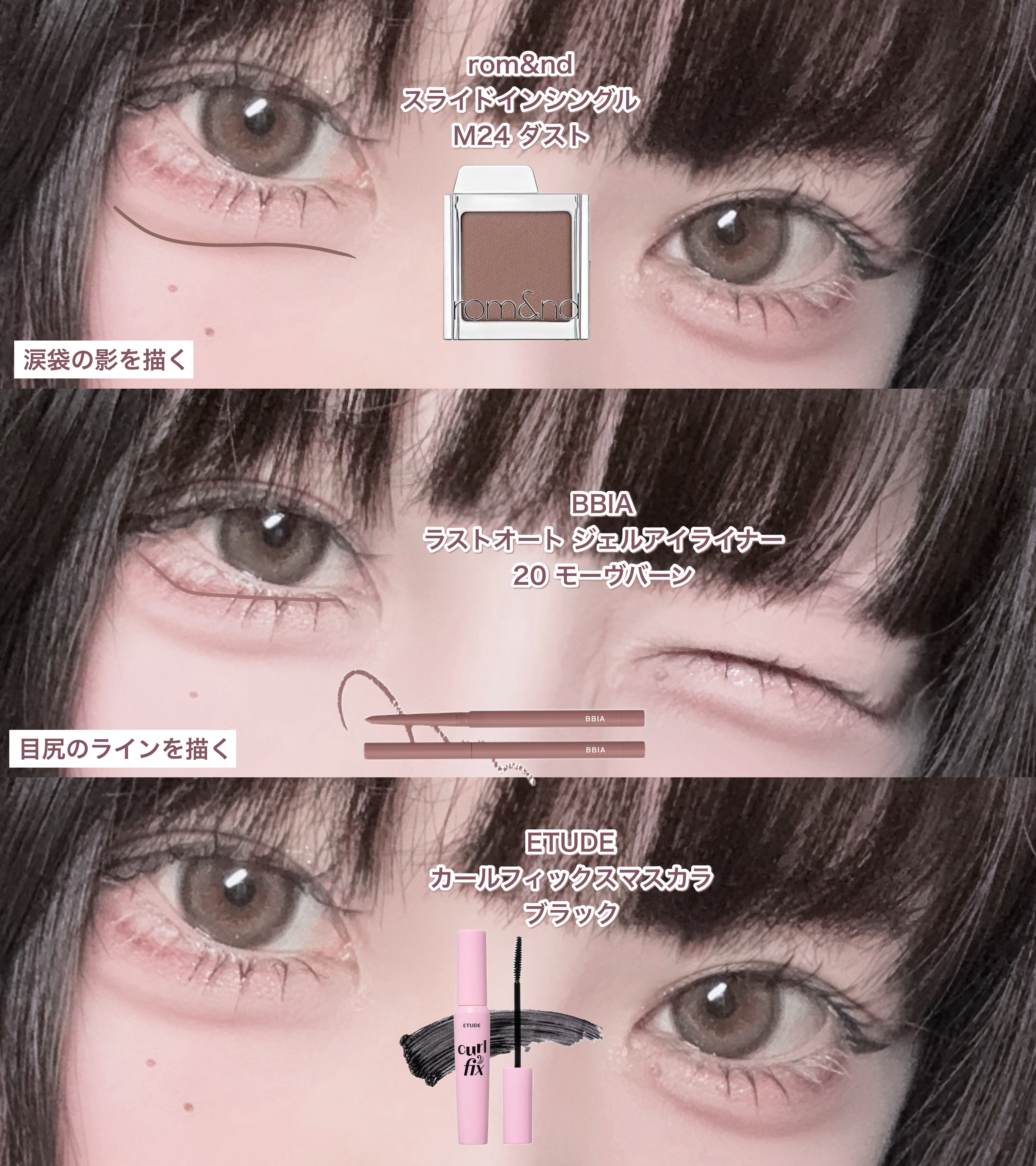 アイシャドウをグラデーションにするときに濃淡に気をつける。 アイラインはぶつっと途切れさせない! マスカラの色も重要で、ブラウンのマスカラを普段使っている方は少し赤みのあるブラウンマスカラを使ってみると、目元に自然な血色感がでてとってもおすすめです!