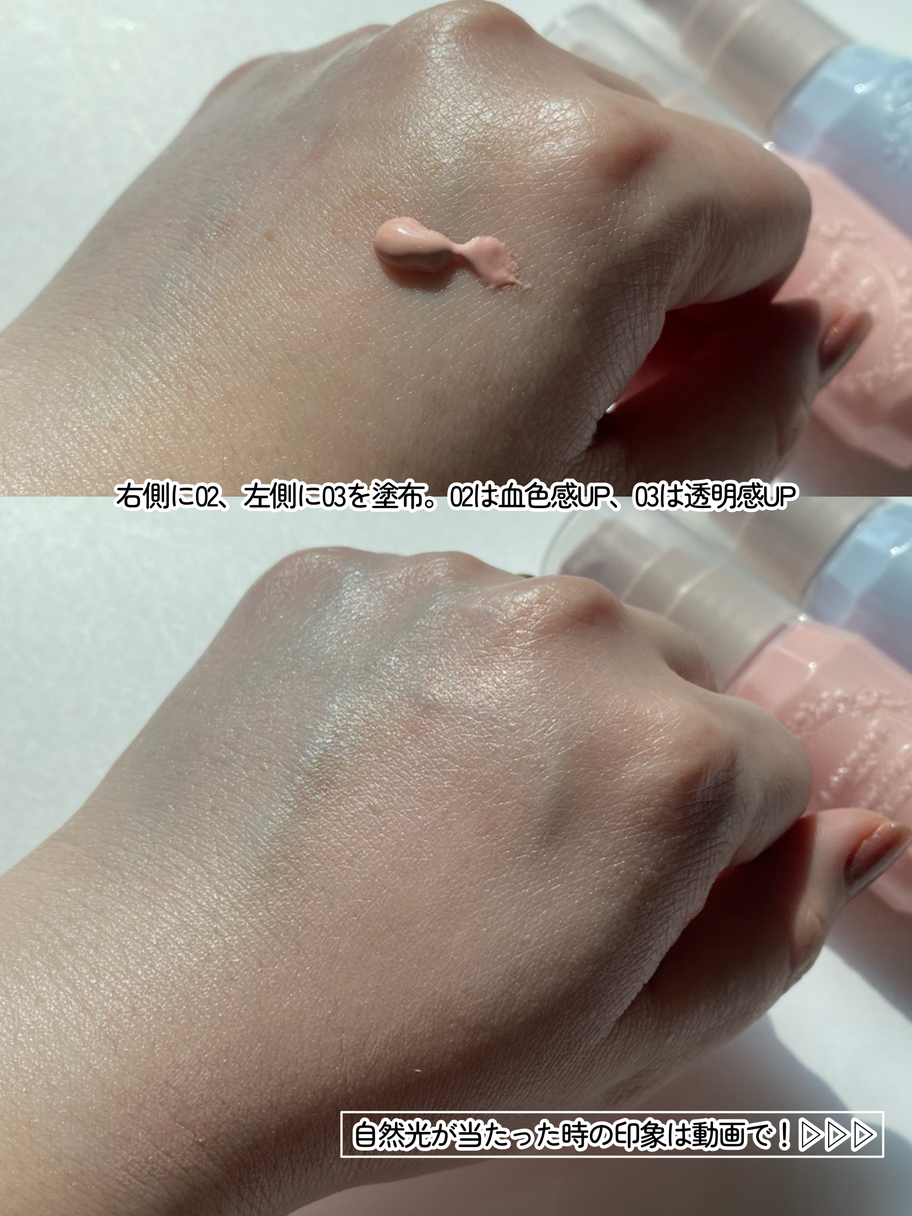 - <01 ライトベージュ> 水、ジメチコン、BG、酸化チタン、グリセリン、合成フルオロフロゴパイト、PEG-9ポリジメチルシロキシエチルジメチコン、ポリグリセリル-3ポリジメチルシロキシエチルジメチコン、メチルグルセス-20、水酸化Al、ステアリン酸、トリエチルヘキサノイン、(ジメチコン/(PEG-10/15))クロスポリマー、(ジメチコン/ビニルジメチコン)クロスポリマー、DPG、ヒアルロン酸Na、加水分解コラーゲン、スクワラン、ヒマワリ種子油脂肪酸フィトステリル、アルニカ花エキス、ラベンダー花エキス、カミツレ花エキス、ローズマリー葉エキス、オレンジ花水、ホホバ種子油、カニナバラ果実油、オリーブ果実油、(トウキ/シャクヤク/ジオウ)根/(センキュウ/ショウガ)根茎エキス、グリチルリチン酸2K、ジパルミチン酸アスコルビル、塩化Na、クエン酸Na、フェノキシエタノール、メチルパラベン、トコフェロール、ステアロイルグルタミン酸2Na、シクロペンタシロキサン、エタノール、硫酸Ba、ヒドロキシアパタイト、マイカ、酸化鉄、酸化亜鉛 <02 スウィートピンク> 水、ジメチコン、BG、酸化チタン、グリセリン、合成フルオロフロゴパイト、PEG-9ポリジメチルシロキシエチルジメチコン、ポリグリセリル-3ポリジメチルシロキシエチルジメチコン、メチルグルセス-20、水酸化Al、ステアリン酸、トリエチルヘキサノイン、(ジメチコン/(PEG-10/15))クロスポリマー、(ジメチコン/ビニルジメチコン)クロスポリマー、DPG、ヒアルロン酸Na、加水分解コラーゲン、スクワラン、ヒマワリ種子油脂肪酸フィトステリル、アルニカ花エキス、ラベンダー花エキス、カミツレ花エキス、ローズマリー葉エキス、オレンジ花水、ホホバ種子油、カニナバラ果実油、オリーブ果実油、(トウキ/シャクヤク/ジオウ)根/(センキュウ/ショウガ)根茎エキス、グリチルリチン酸2K、ジパルミチン酸アスコルビル、塩化Na、クエン酸Na、フェノキシエタノール、メチルパラベン、トコフェロール、ステアロイルグルタミン酸2Na、シクロペンタシロキサン、エタノール、硫酸Ba、ヒドロキシアパタイト、マイカ、酸化鉄、酸化亜鉛 <03 ペールブルー> 水、ジメチコン、BG、酸化チタン、グリセリン、合成フルオロフロゴパイト、PEG-9ポリジメチルシロキシエチルジメチコン、ポリグリセリル-3ポリジメチルシロキシエチルジメチコン、メチルグルセス-20、水酸化Al、ステアリン酸、トリエチルヘキサノイン、(ジメチコン/(PEG-10/15))クロスポリマー、(ジメチコン/ビニルジメチコン)クロスポリマー、DPG、ヒアルロン酸Na、加水分解コラーゲン、スクワラン、ヒマワリ種子油脂肪酸フィトステリル、アルニカ花エキス、ラベンダー花エキス、カミツレ花エキス、ローズマリー葉エキス、オレンジ花水、ホホバ種子油、カニナバラ果実油、オリーブ果実油、(トウキ/シャクヤク/ジオウ)根/(センキュウ/ショウガ)根茎エキス、グリチルリチン酸2K、ジパルミチン酸アスコルビル、塩化Na、クエン酸Na、フェノキシエタノール、メチルパラベン、トコフェロール、ステアロイルグルタミン酸2Na、シクロペンタシロキサン、トリイソステアリン酸ポリグリセリル-2、エタノール、硫酸Ba、ヒドロキシアパタイト、マイカ、グンジョウ、酸化亜鉛