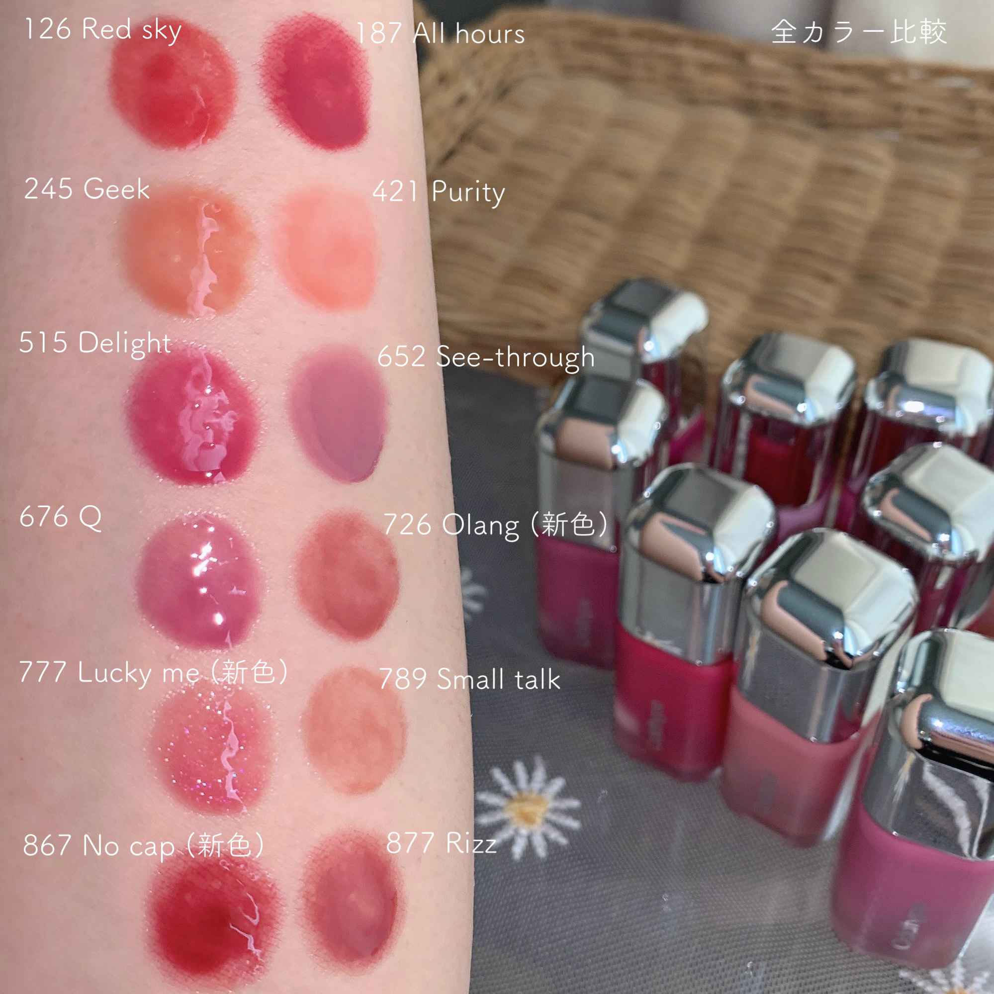 どのカラーも絶妙で忖度なしに本当にかわいい🥹 透明感あるパッケージも天下一品💯 "露ティント"の名に相応しい磨いたガラスのようなちゅるちゅる感で、ひとり一本持っておくべき名アイテムです!
