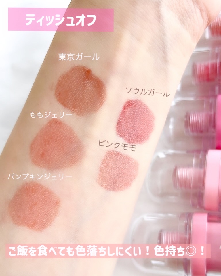 - <01 モモジェリー> Water、Diphenyl Dimethicone、Diisostearyl Malate、Bis-Diglyceryl Polyacyladipate-2、Hydrogenated Polyisobutene、Bis-Behenyl/Isostearyl/Phytosteryl Dimer Dilinoleyl Dimer Dilinoleate、Cetyl PEG/PPG-10/1 Dimethicone、Diglycerin、Hydrogenated Polydecene、Dipropylene Glycol、Polysorbate 60、Sorbitan Isostearate、Hydroxyethyl Acrylate/Sodium Acryloyldimethyl Taurate Copolymer、Pentylene Glycol、Squalane、Titanium Dioxide (CI 77891)、Ethylene/Propylene Copolymer、Ceteareth-20、Phenoxyethanol、Polyglycerin-3、Yellow 5 (CI 19140)、Red 33 (CI 17200)、Fragrance、Ethylhexylglycerin、Glycerin、Aluminum Hydroxide、Ammonium Polyacrylate、Yellow 6 (CI 15985)、Butylene Glycol、Blue 1 (CI 42090)、Tocopheryl Acetate、Prunus Persica (Peach) Fruit Extract、1,2-Hexanediol、Sodium Hyaluronate、Hydroxypropyltrimonium Hyaluronate、Sodium Acetylated Hyaluronate、Hydrolyzed Hyaluronic acid、Hyaluronic Acid、Sodium Hyaluronate Crosspolymer、Hydrolyzed Sodium Hyaluronate、Potassium Hyaluronate <02 ヘルシーサーモン> Water、Diphenyl Dimethicone、Diisostearyl Malate、Bis-Diglyceryl Polyacyladipate-2、Hydrogenated Polyisobutene、Bis-Behenyl/Isostearyl/Phytosteryl Dimer Dilinoleyl Dimer Dilinoleate、Cetyl PEG/PPG-10/1 Dimethicone、Diglycerin、Hydrogenated Polydecene、Dipropylene Glycol、Polysorbate 60、Sorbitan Isostearate、Hydroxyethyl Acrylate/Sodium Acryloyldimethyl Taurate Copolymer、Pentylene Glycol、Squalane、Ethylene/Propylene Copolymer、Ceteareth-20、Phenoxyethanol、Titanium Dioxide (CI 77891)、Polyglycerin-3、Yellow 6 (CI 15985)、Fragrance、Ethylhexylglycerin、Red 33 (CI 17200)、Glycerin、Red 28 (CI 45410)、Aluminum Hydroxide、Ammonium Polyacrylate、Yellow 5 (CI 19140)、Butylene Glycol、Tocopheryl Acetate、Blue 1 (CI 42090)、Prunus Persica (Peach) Fruit Extract、1,2-Hexanediol、Sodium Hyaluronate、Hydroxypropyltrimonium Hyaluronate、Sodium Acetylated Hyaluronate、Hydrolyzed Hyaluronic acid、Hyaluronic Acid、Sodium Hyaluronate Crosspolymer、Hydrolyzed Sodium Hyaluronate、Potassium Hyaluronate <03 ヌーディーピンク> Water、Diphenyl Dimethicone、Diisostearyl Malate、Bis-Diglyceryl Polyacyladipate-2、Hydrogenated Polyisobutene、Bis-Behenyl/Isostearyl/Phytosteryl Dimer Dilinoleyl Dimer Dilinoleate、Cetyl PEG/PPG-10/1 Dimethicone、Diglycerin、Hydrogenated Polydecene、Dipropylene Glycol、Polysorbate 60、Sorbitan Isostearate、Hydroxyethyl Acrylate/Sodium Acryloyldimethyl Taurate Copolymer、Pentylene Glycol、Squalane、Ethylene/Propylene Copolymer、Ceteareth-20、Titanium Dioxide (CI 77891)、Phenoxyethanol、Polyglycerin-3、Red 33 (CI 17200)、Yellow 5 (CI 19140)、Fragrance、Ethylhexylglycerin、Glycerin、Aluminum Hydroxide、Ammonium Polyacrylate、Butylene Glycol、Blue 1 (CI 42090)、Tocopheryl Acetate、Prunus Persica (Peach) Fruit Extract、1,2-Hexanediol、Sodium Hyaluronate、Hydroxypropyltrimonium Hyaluronate、Sodium Acetylated Hyaluronate、Hydrolyzed Hyaluronic acid、Hyaluronic Acid、Sodium Hyaluronate Crosspolymer、Hydrolyzed Sodium Hyaluronate、Potassium Hyaluronate <04 ローズミルク> Water、Diphenyl Dimethicone、Diisostearyl Malate、Bis-Diglyceryl Polyacyladipate-2、Hydrogenated Polyisobutene、Bis-Behenyl/Isostearyl/Phytosteryl Dimer Dilinoleyl Dimer Dilinoleate、Cetyl PEG/PPG-10/1 Dimethicone、Diglycerin、Hydrogenated Polydecene、Dipropylene Glycol、Polysorbate 60、Sorbitan Isostearate、Hydroxyethyl Acrylate/Sodium Acryloyldimethyl Taurate Copolymer、Pentylene Glycol、Squalane、Ethylene/Propylene Copolymer、Ceteareth-20、Titanium Dioxide (CI 77891)、Phenoxyethanol、Polyglycerin-3、Red 28 (CI 45410)、Yellow 6 (CI 15985)、Fragrance、Ethylhexylglycerin、Red 33 (CI 17200)、Glycerin、Aluminum Hydroxide、Ammonium Polyacrylate、Butylene Glycol、Blue 1 (CI 42090)、Tocopheryl Acetate、Prunus Persica (Peach) Fruit Extract、1,2-Hexanediol、Sodium Hyaluronate、Hydroxypropyltrimonium Hyaluronate、Sodium Acetylated Hyaluronate、Hydrolyzed Hyaluronic acid、Hyaluronic Acid、Sodium Hyaluronate Crosspolymer、Hydrolyzed Sodium Hyaluronate、Potassium Hyaluronate <05 ベージュフィグ> Water、Diphenyl Dimethicone、Diisostearyl Malate、Bis-Diglyceryl Polyacyladipate-2、Hydrogenated Polyisobutene、Bis-Behenyl/Isostearyl/Phytosteryl Dimer Dilinoleyl Dimer Dilinoleate、Cetyl PEG/PPG-10/1 Dimethicone、Diglycerin、Hydrogenated Polydecene、Dipropylene Glycol、Polysorbate 60、Sorbitan Isostearate、Hydroxyethyl Acrylate/Sodium Acryloyldimethyl Taurate Copolymer、Pentylene Glycol、Squalane、Titanium Dioxide (CI 77891)、Ethylene/Propylene Copolymer、Ceteareth-20、Phenoxyethanol、Polyglycerin-3、Yellow 5 (CI 19140)、Red 33 (CI 17200)、Fragrance、Ethylhexylglycerin、Yellow 6 (CI 15985)、Glycerin、Aluminum Hydroxide、Ammonium Polyacrylate、Butylene Glycol、Blue 1 (CI 42090)、Tocopheryl Acetate、Prunus Persica (Peach) Fruit Extract、1,2-Hexanediol、Sodium Hyaluronate、Hydroxypropyltrimonium Hyaluronate、Sodium Acetylated Hyaluronate、Hydrolyzed Hyaluronic acid、Hyaluronic Acid、Sodium Hyaluronate Crosspolymer、Hydrolyzed Sodium Hyaluronate、Potassium Hyaluronate <06 ソウルガール> Water、Diphenyl Dimethicone、Diisostearyl Malate、Bis-Diglyceryl Polyacyladipate-2、Hydrogenated Polyisobutene、Bis-Behenyl/Isostearyl/Phytosteryl Dimer Dilinoleyl Dimer Dilinoleate、Cetyl PEG/PPG-10/1 Dimethicone、Diglycerin、Hydrogenated Polydecene、Dipropylene Glycol、Polysorbate 60、Sorbitan Isostearate、Hydroxyethyl Acrylate/Sodium Acryloyldimethyl Taurate Copolymer、Pentylene Glycol、Squalane、Ethylene/Propylene Copolymer、Ceteareth-20、Titanium Dioxide (CI 77891)、Phenoxyethanol、Polyglycerin-3、Red 33 (CI 17200)、Yellow 6 (CI 15985)、Fragrance、Ethylhexylglycerin、Yellow 5 (CI 19140)、Glycerin、Aluminum Hydroxide、Ammonium Polyacrylate、Blue 1 (CI 42090)、Butylene Glycol、Tocopheryl Acetate
